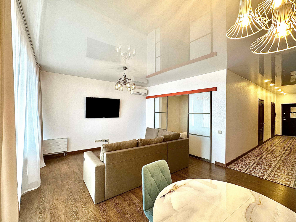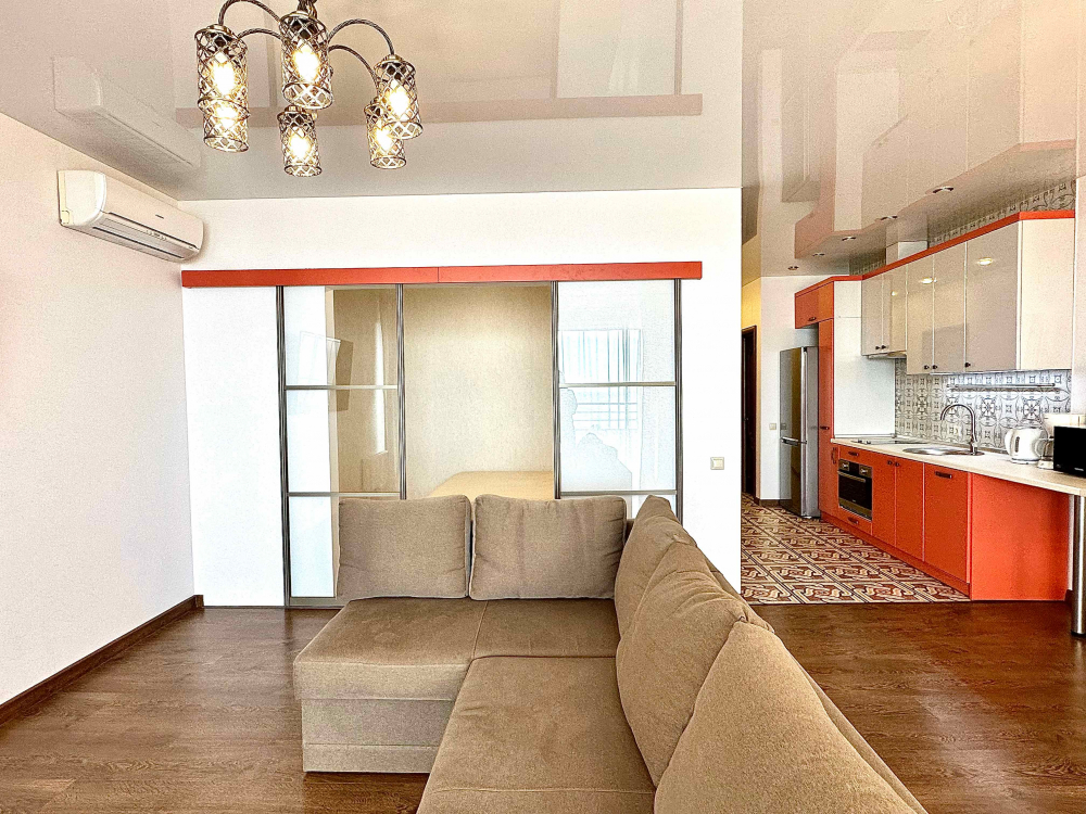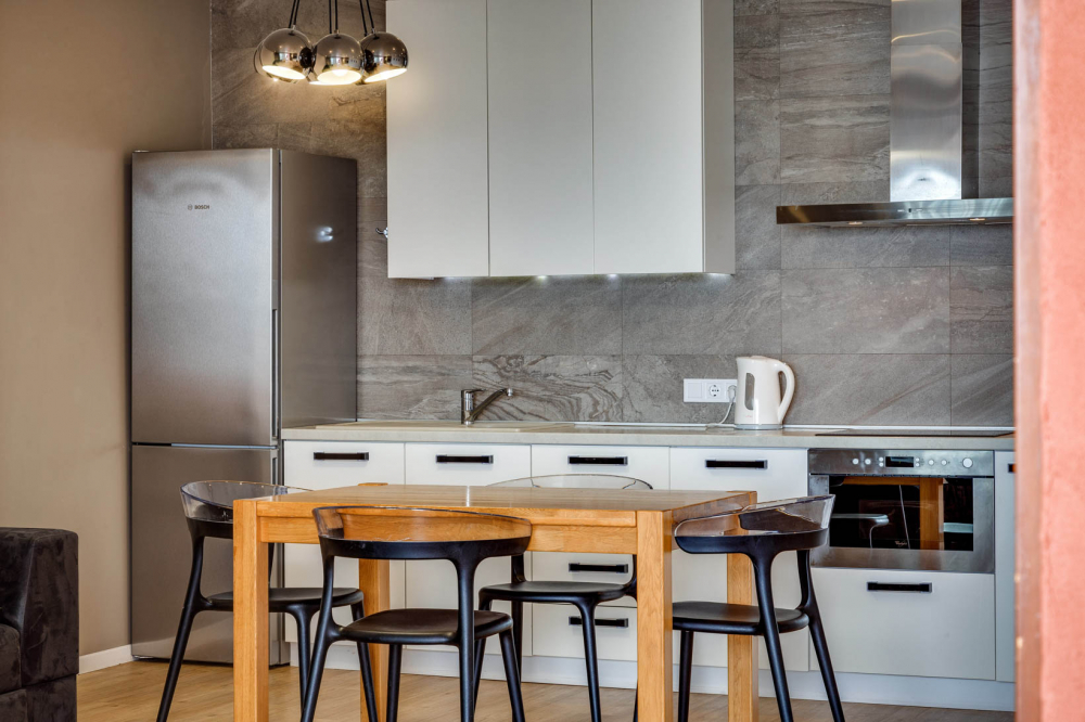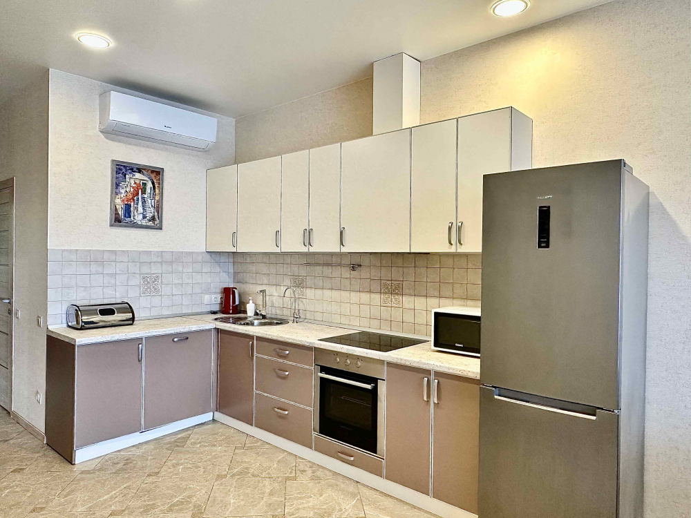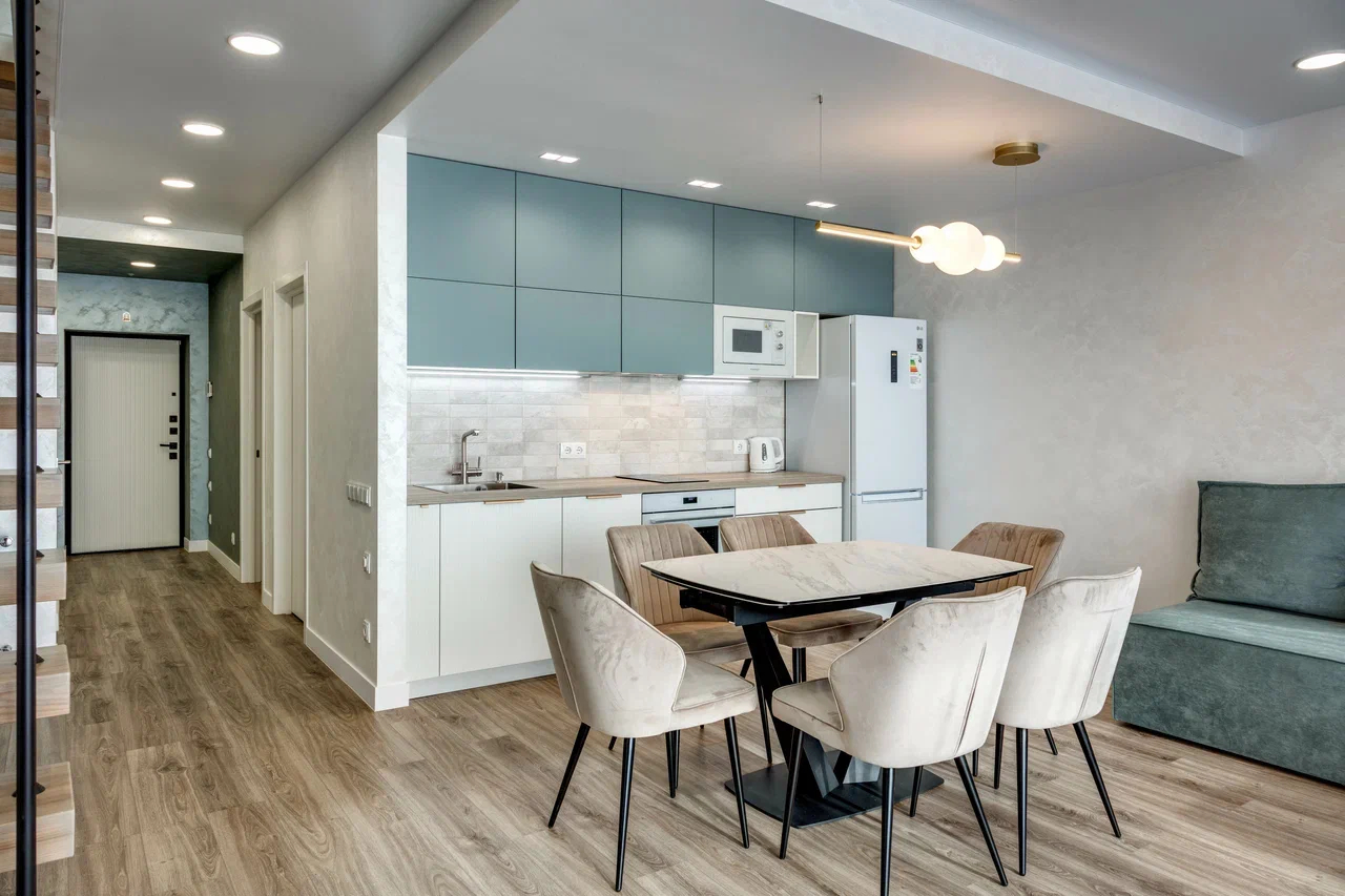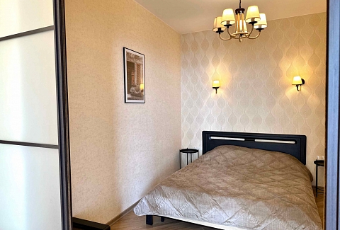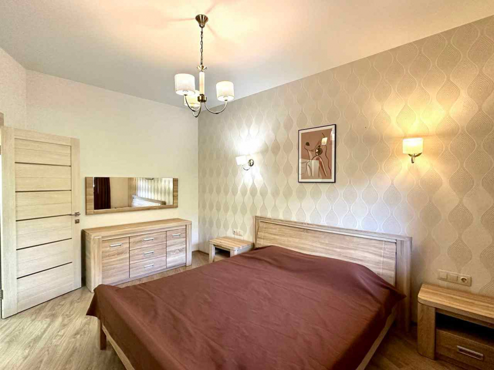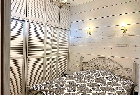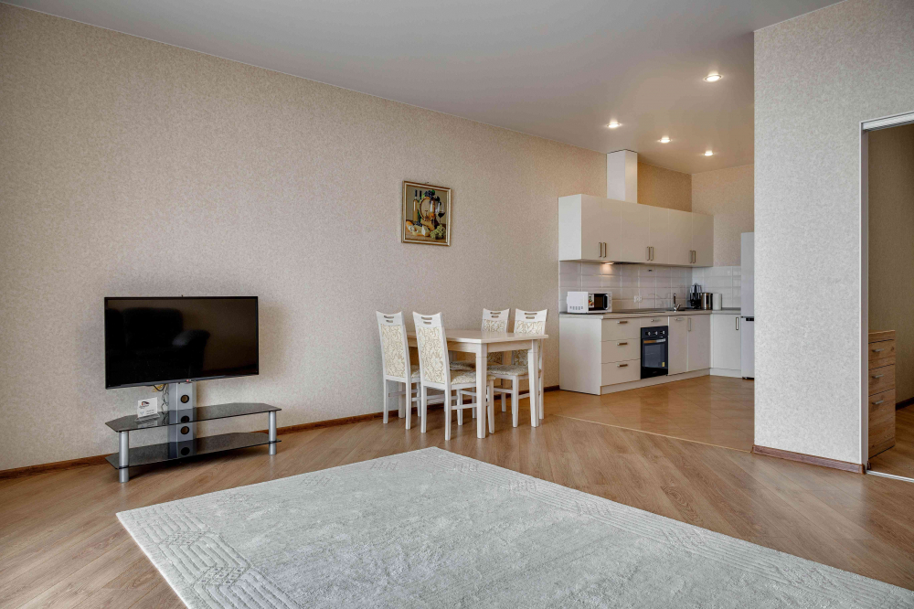 В номере: вешалка, диван, зеркало, кровать двуспальная, кухонная мебель, прикроватная тумбочка, стол, стулья, шкаф, микроволновая печь, плита электрическая, посудомоечная машина, телевизор, холодильник, электрочайник