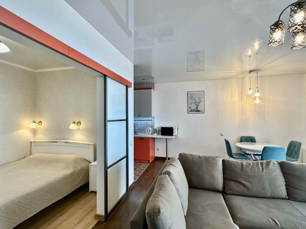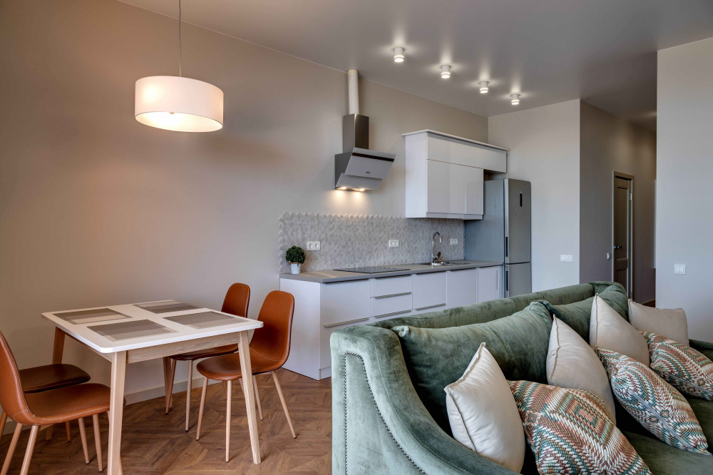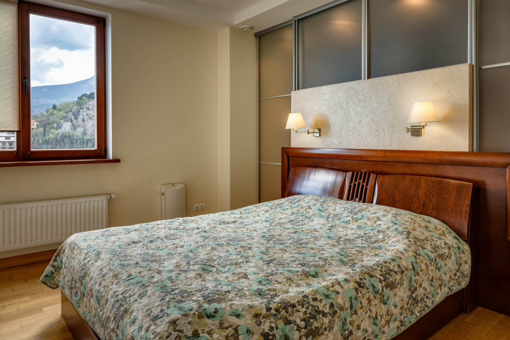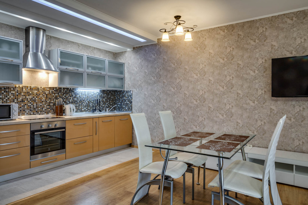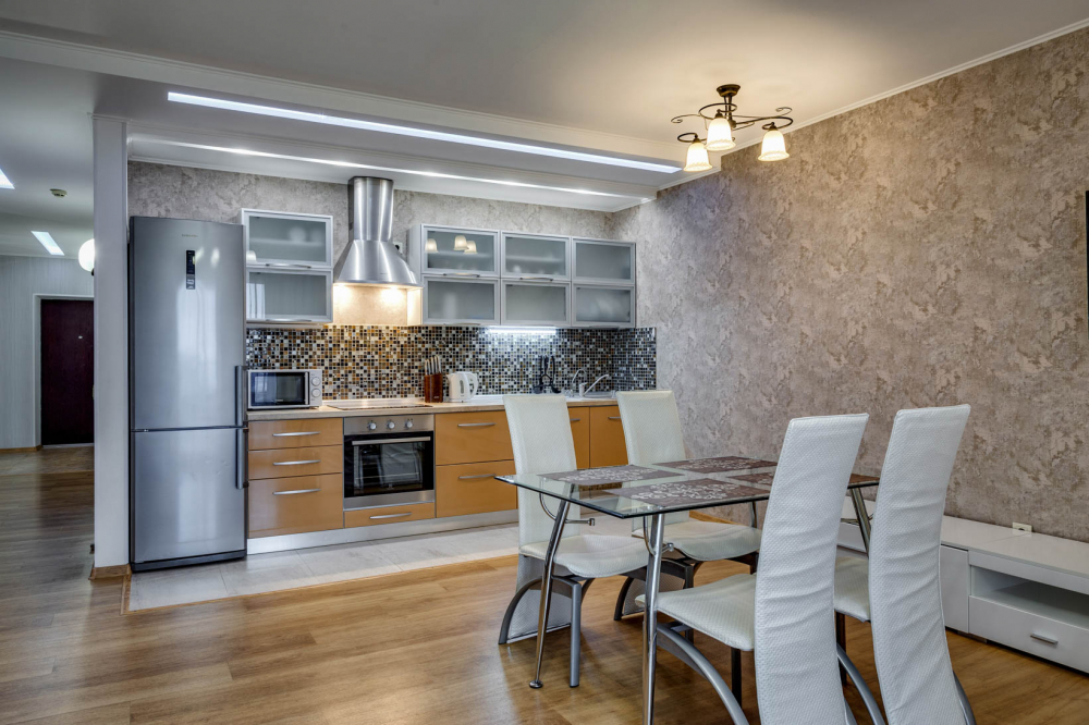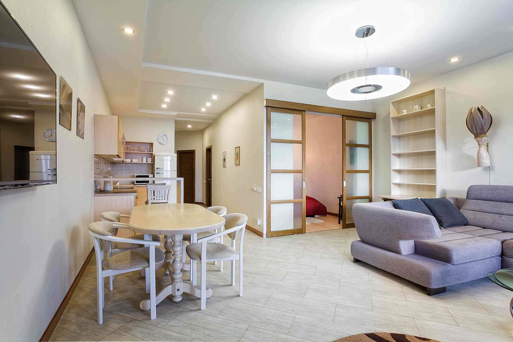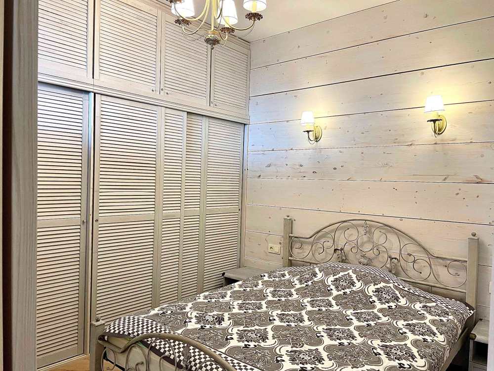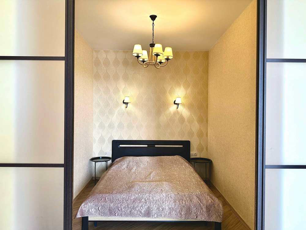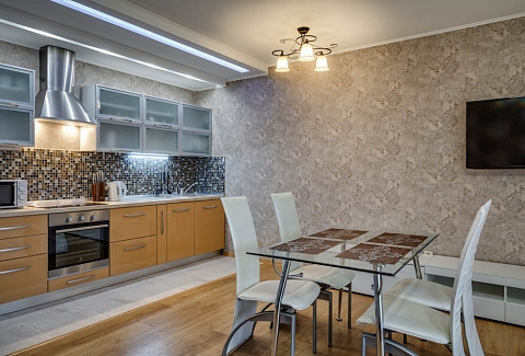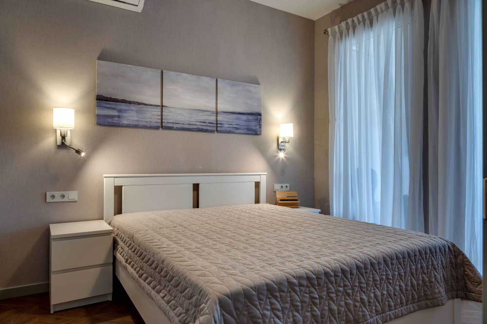 В номере: вешалка, диван, зеркало, кровать двуспальная, кухонная мебель, прикроватная тумбочка, стол, стулья, шкаф, микроволновая печь, плита электрическая, посудомоечная машина, телевизор, холодильник, электрочайник
