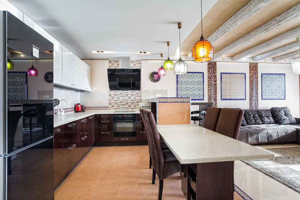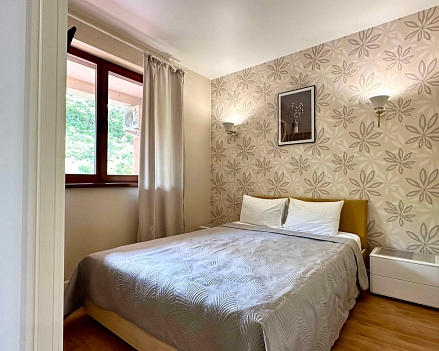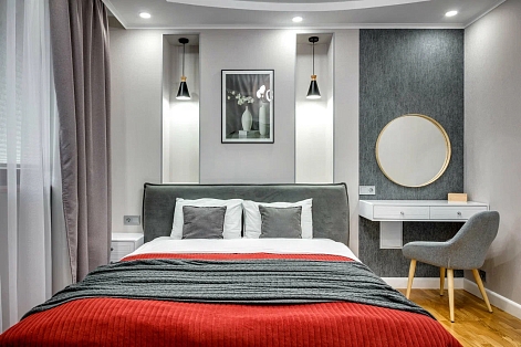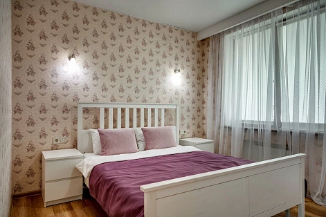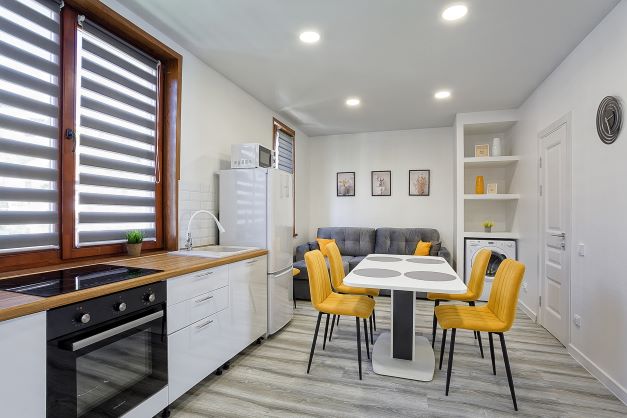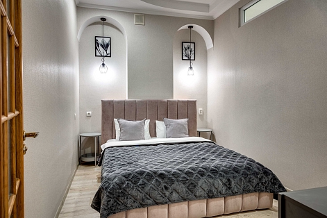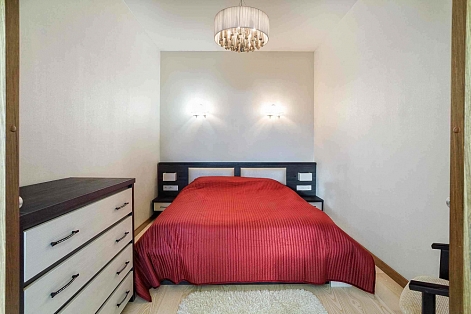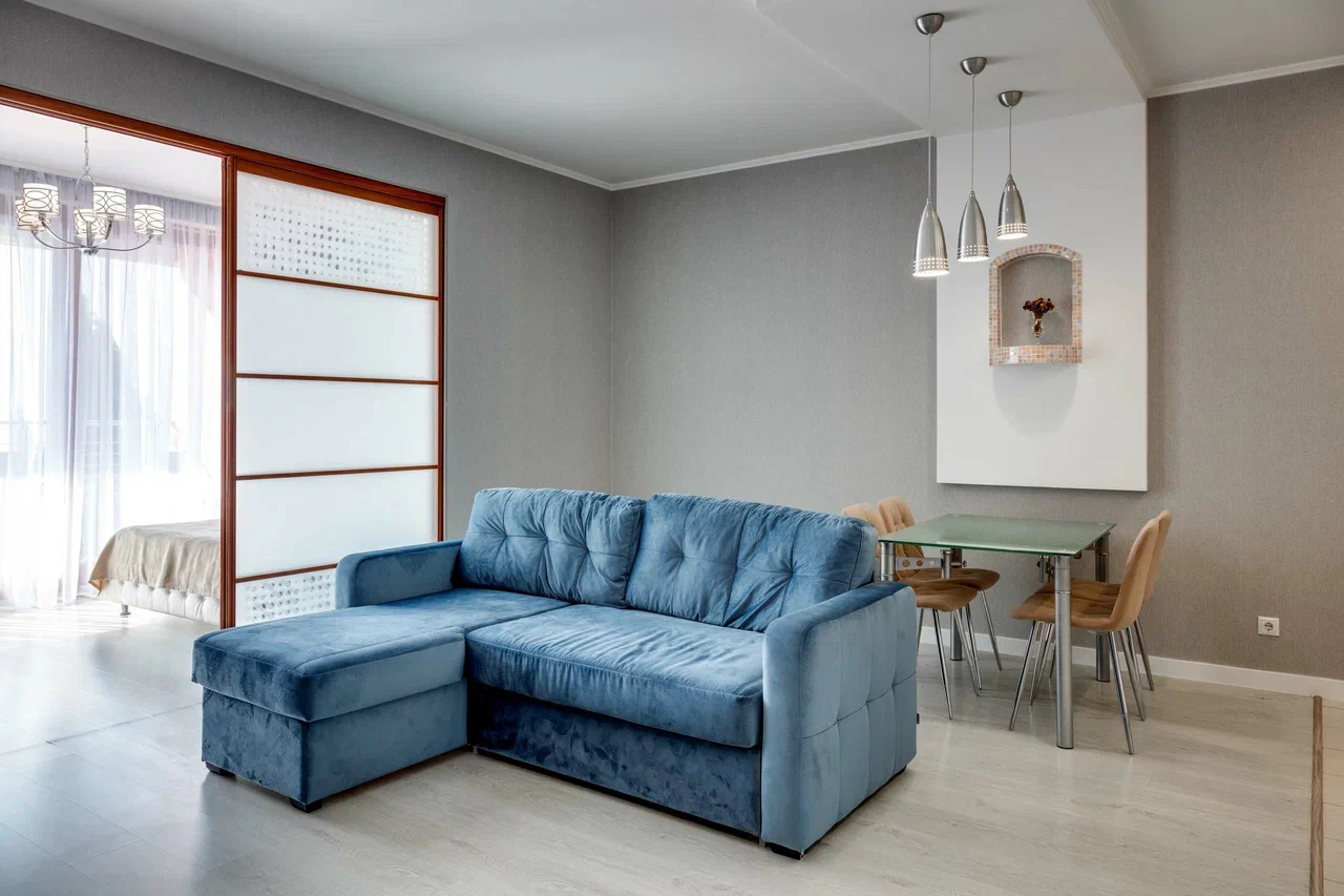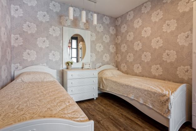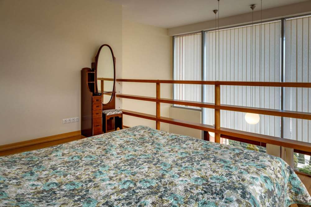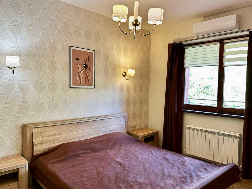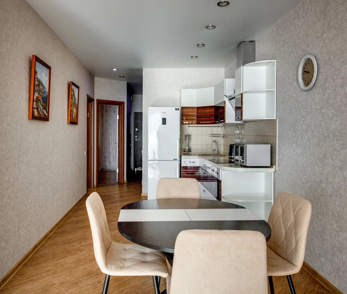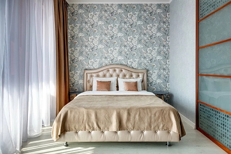 В номере: вешалка, диван, зеркало, кровать двуспальная, кухонная мебель, прикроватная тумбочка, стол, стулья, шкаф, микроволновая печь, плита электрическая, посудомоечная машина, телевизор, холодильник, электрочайник