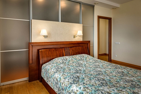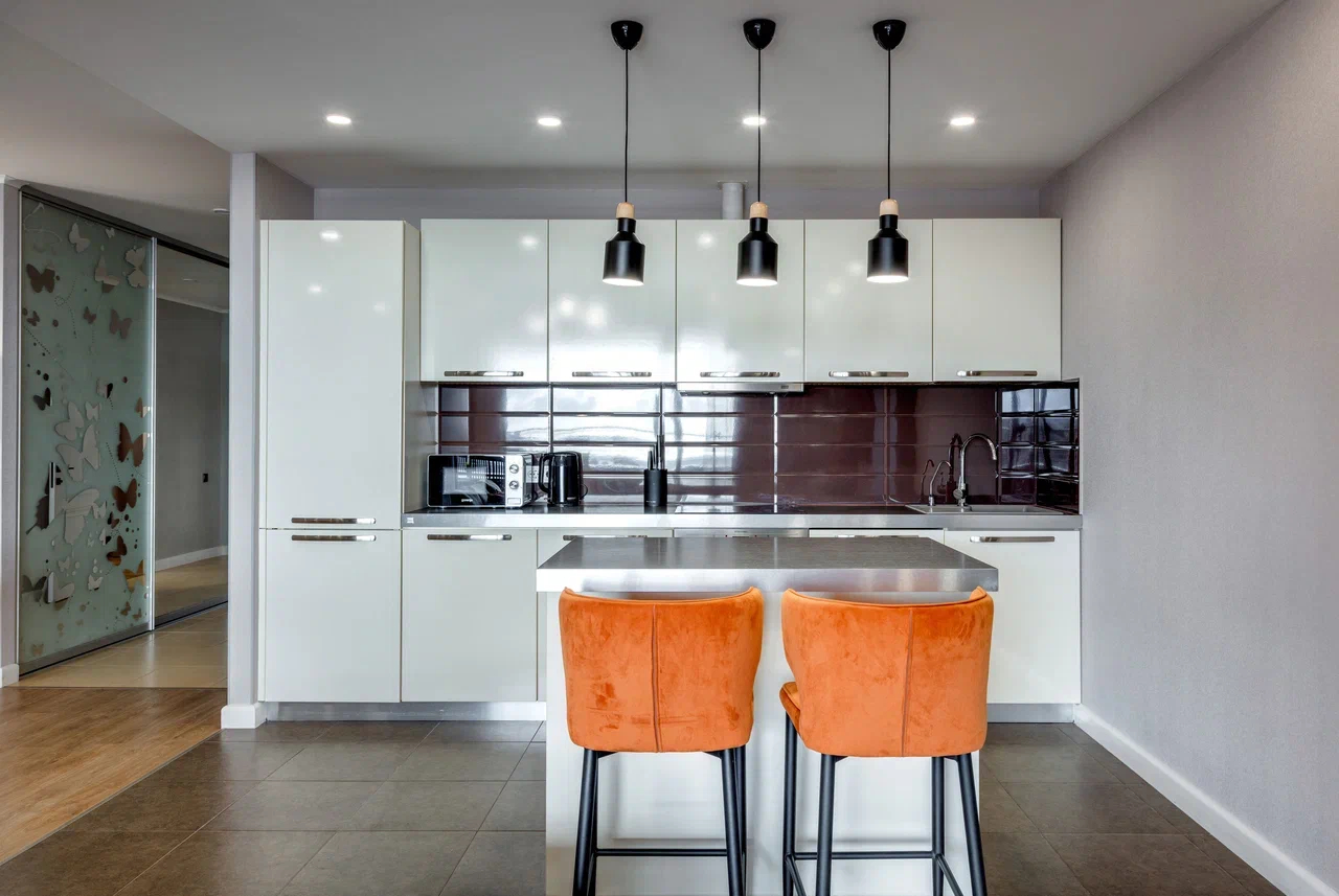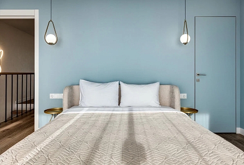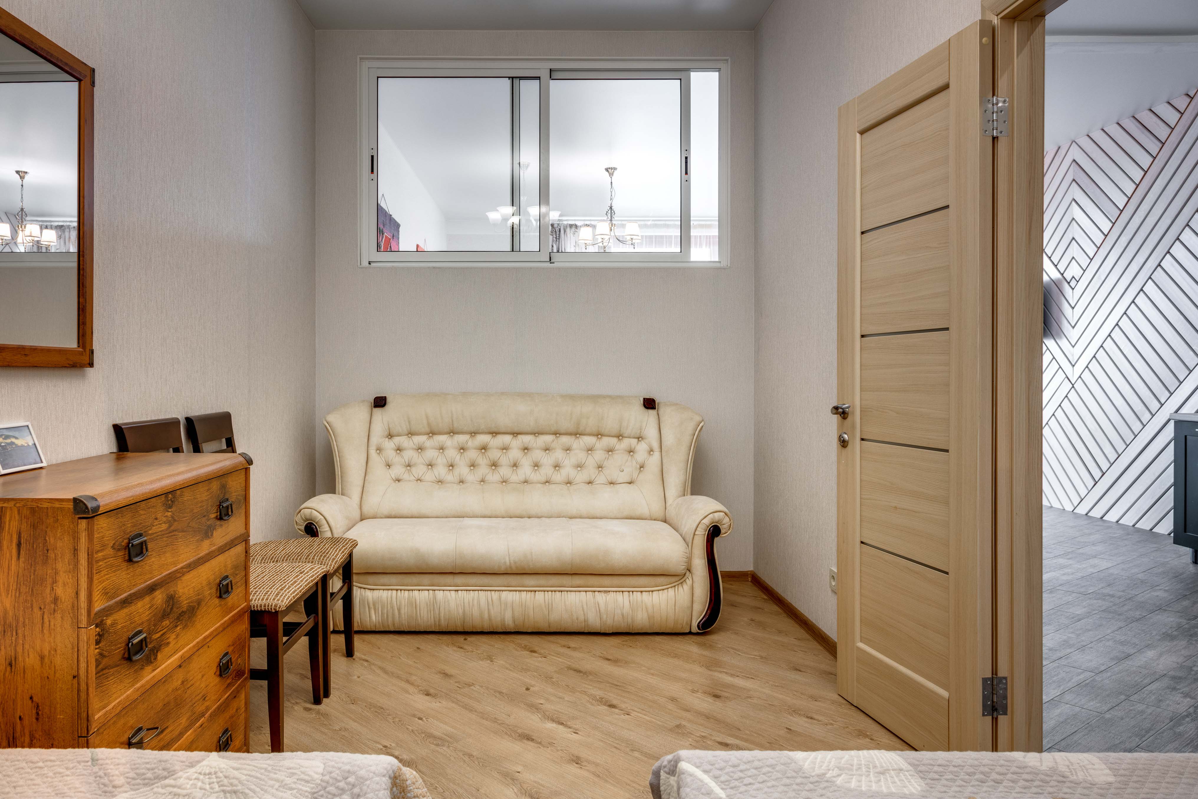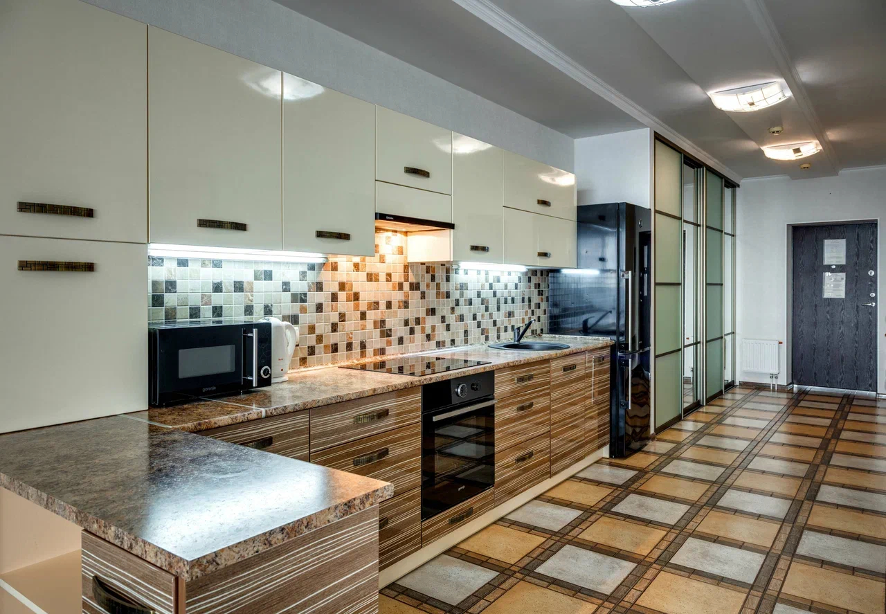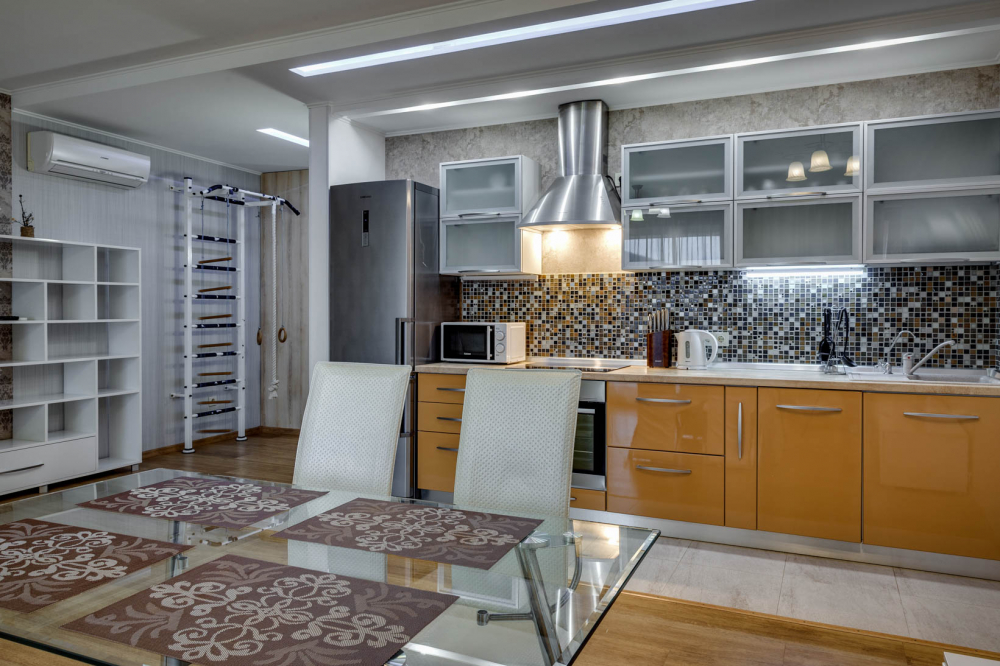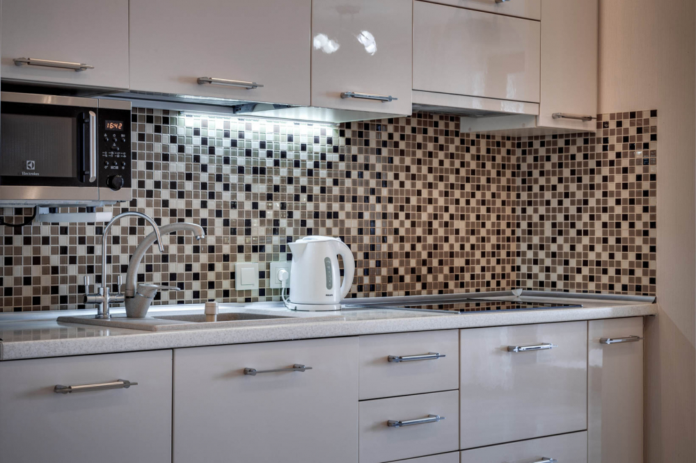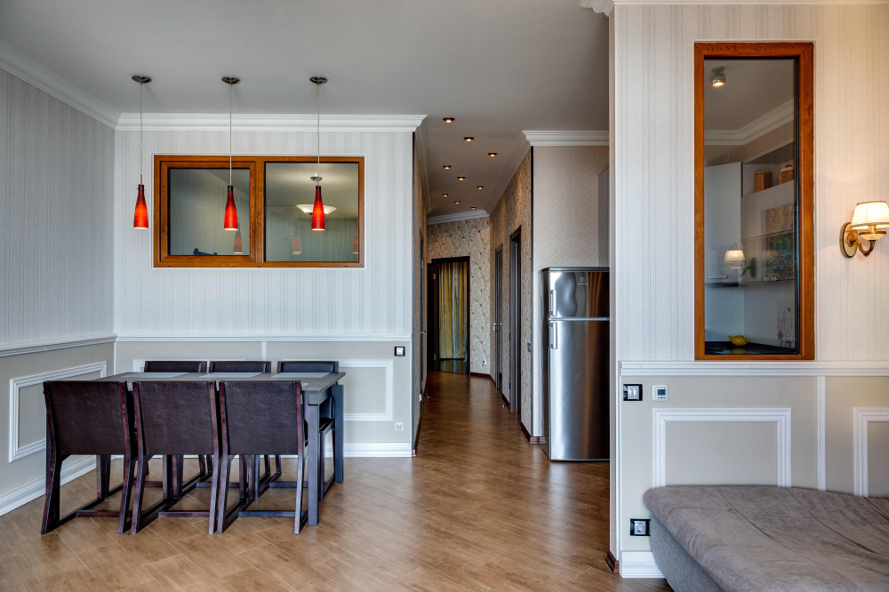 В номере: вешалка, диван, зеркало, кровать двуспальная, кухонная мебель, прикроватная тумбочка, стол, стулья, шкаф, микроволновая печь, плита электрическая, посудомоечная машина, телевизор, холодильник, электрочайник