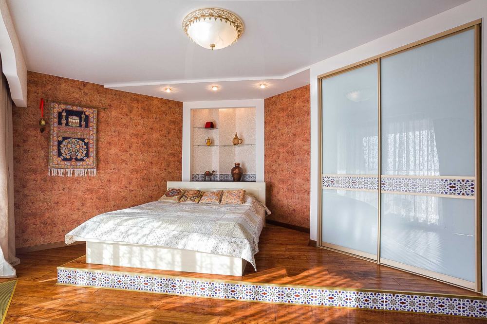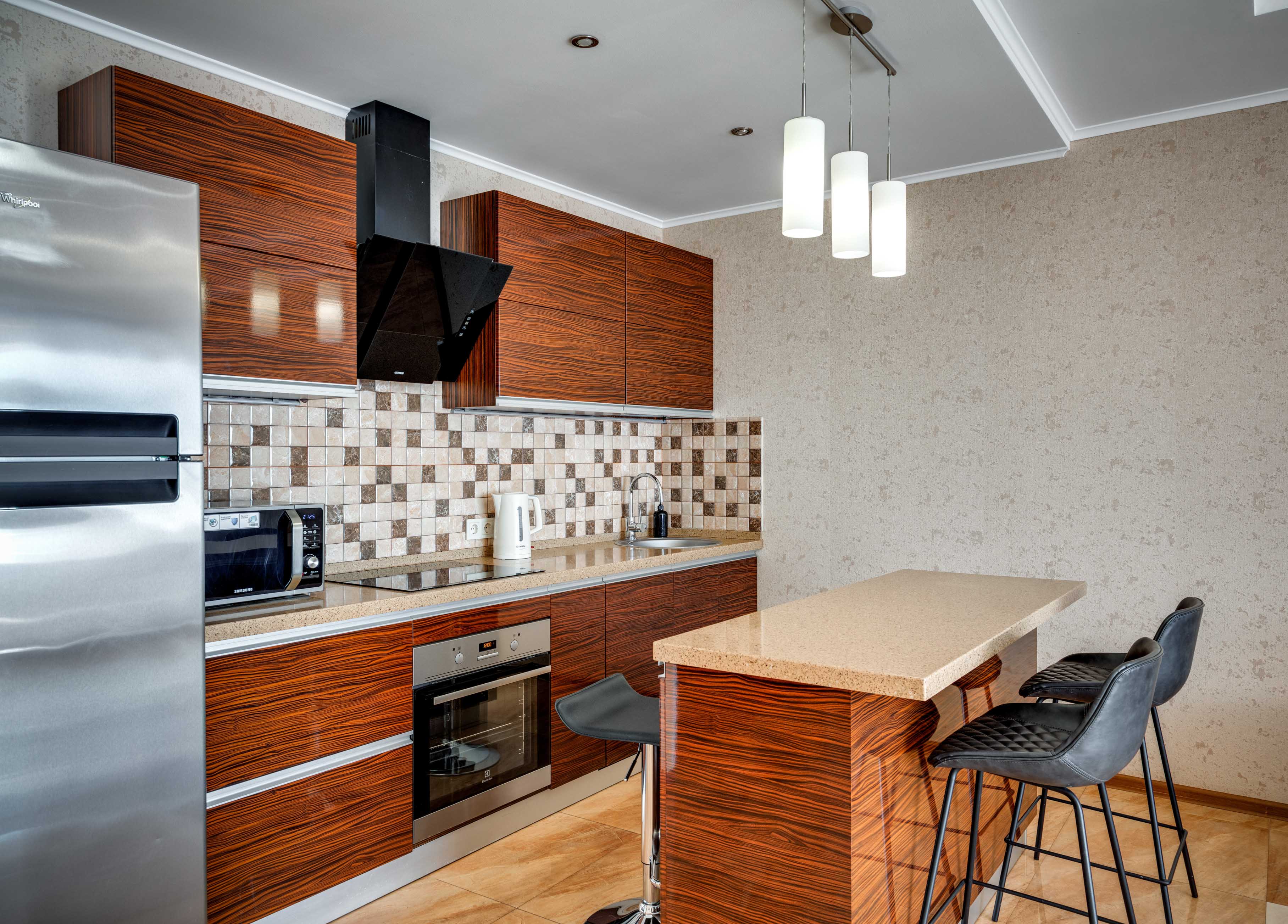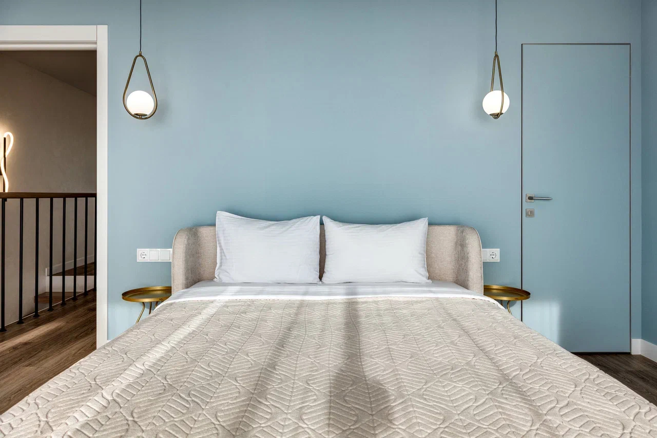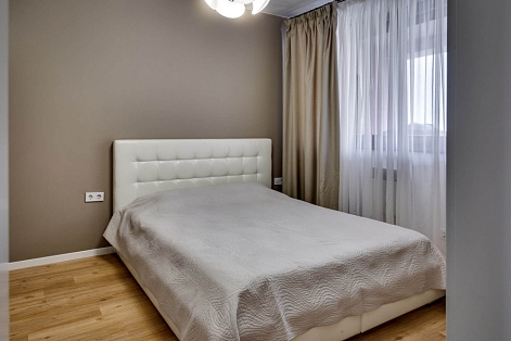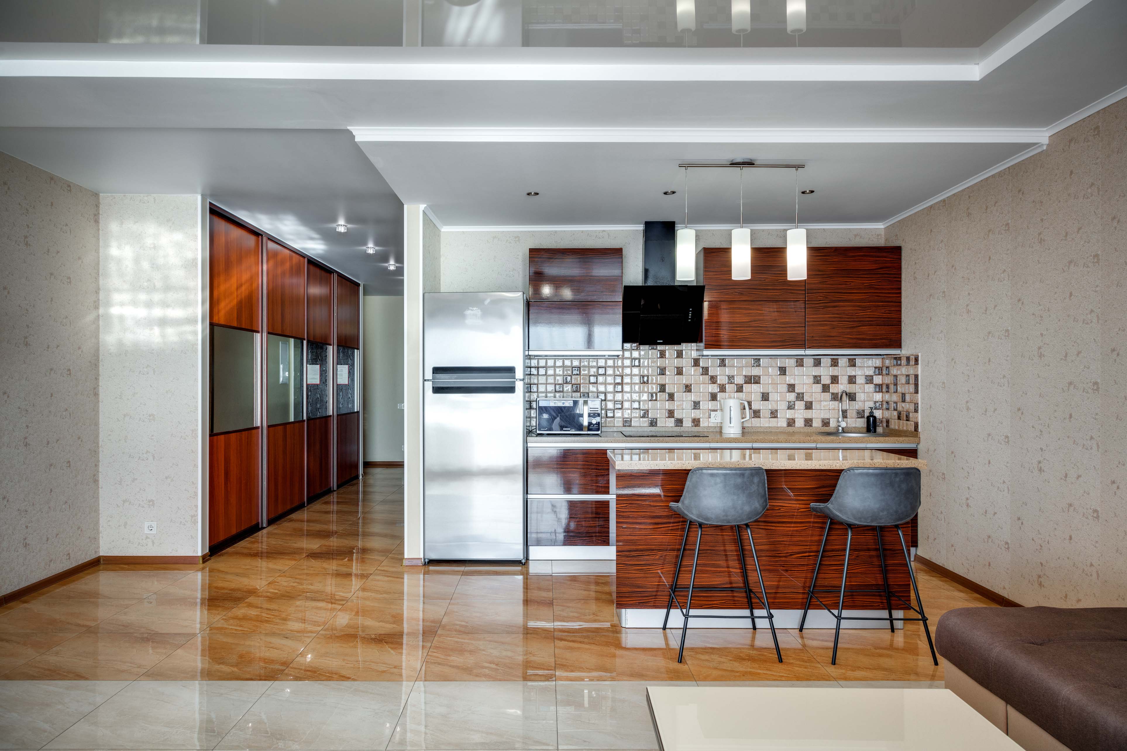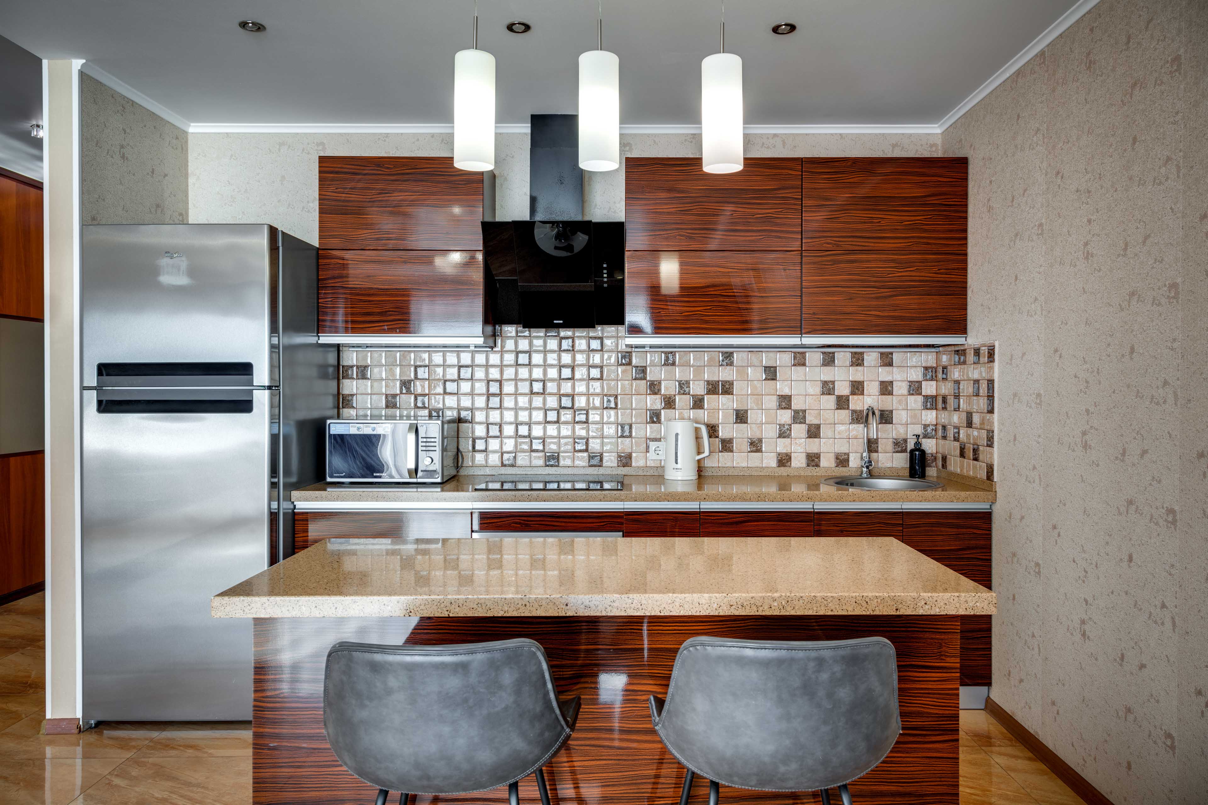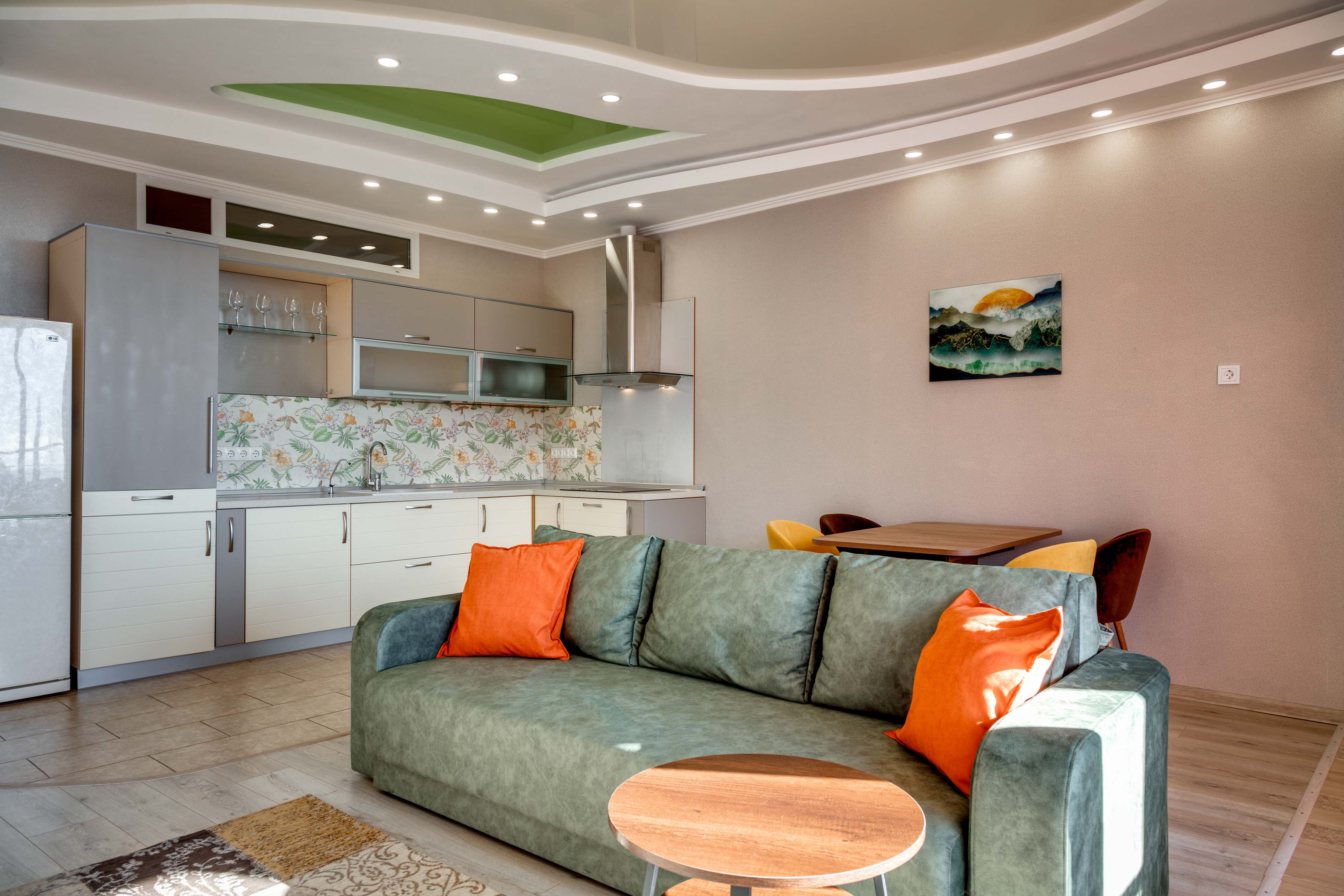 В номере: вешалка, диван, зеркало, кровать двуспальная, кухонная мебель, прикроватная тумбочка, стол, стулья, шкаф, микроволновая печь, плита электрическая, посудомоечная машина, телевизор, холодильник, электрочайник