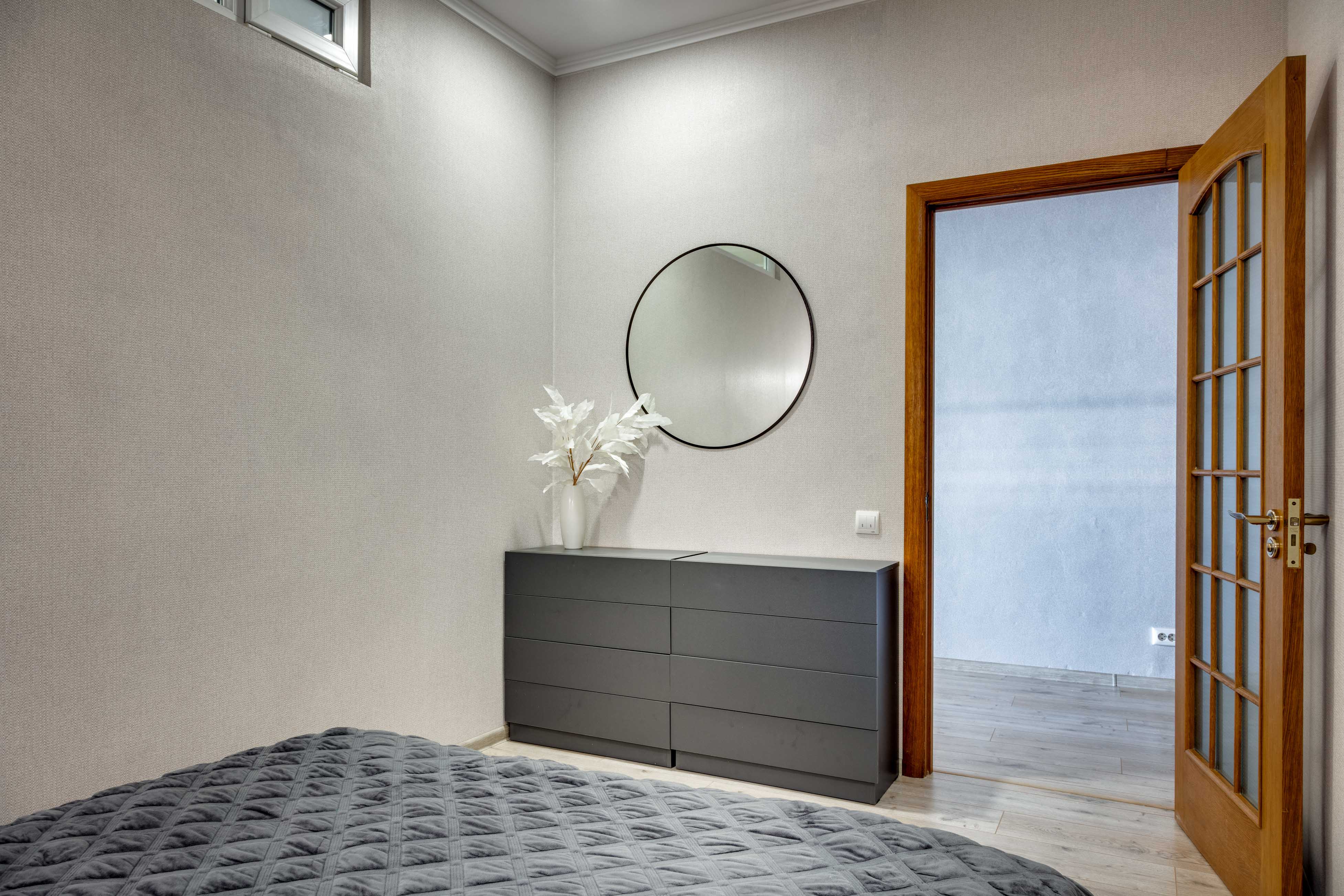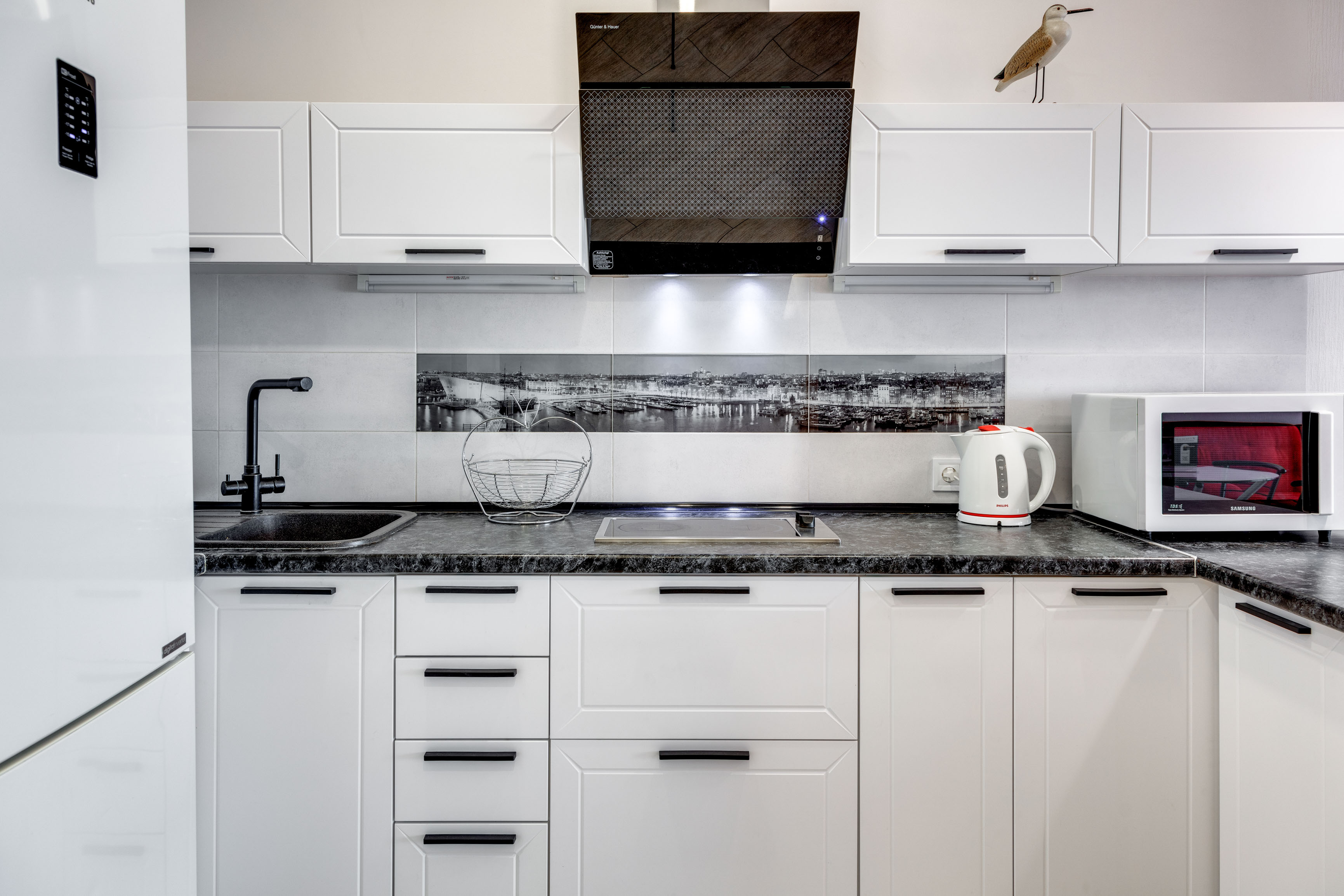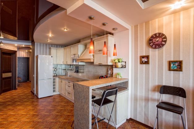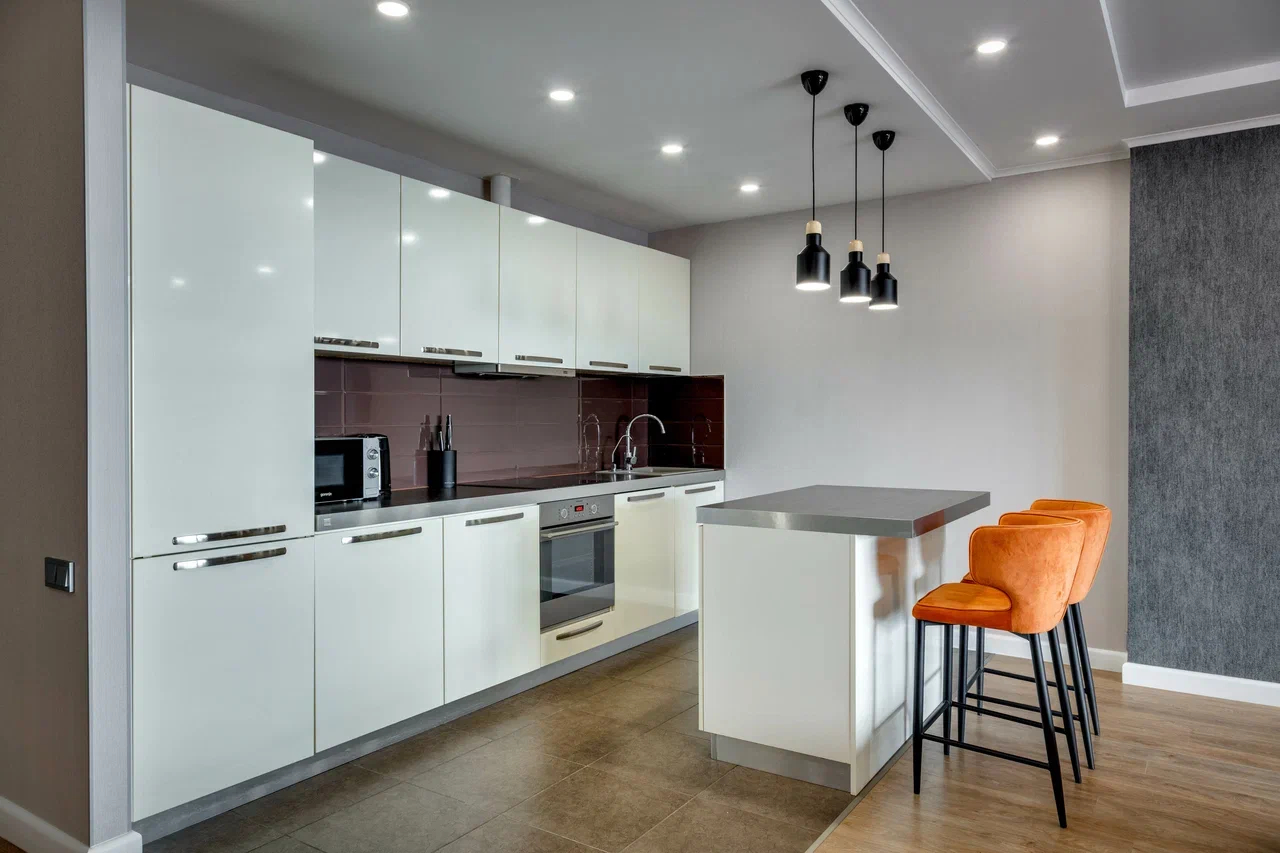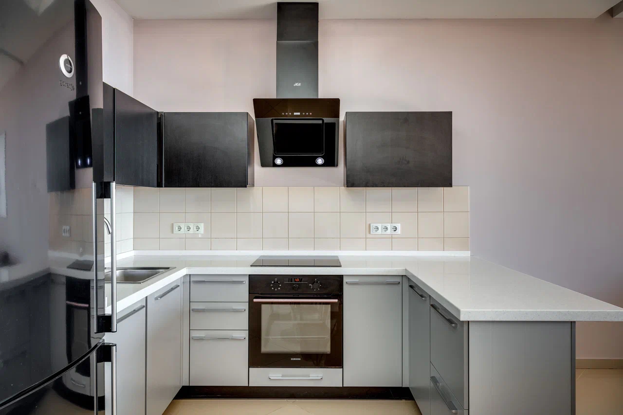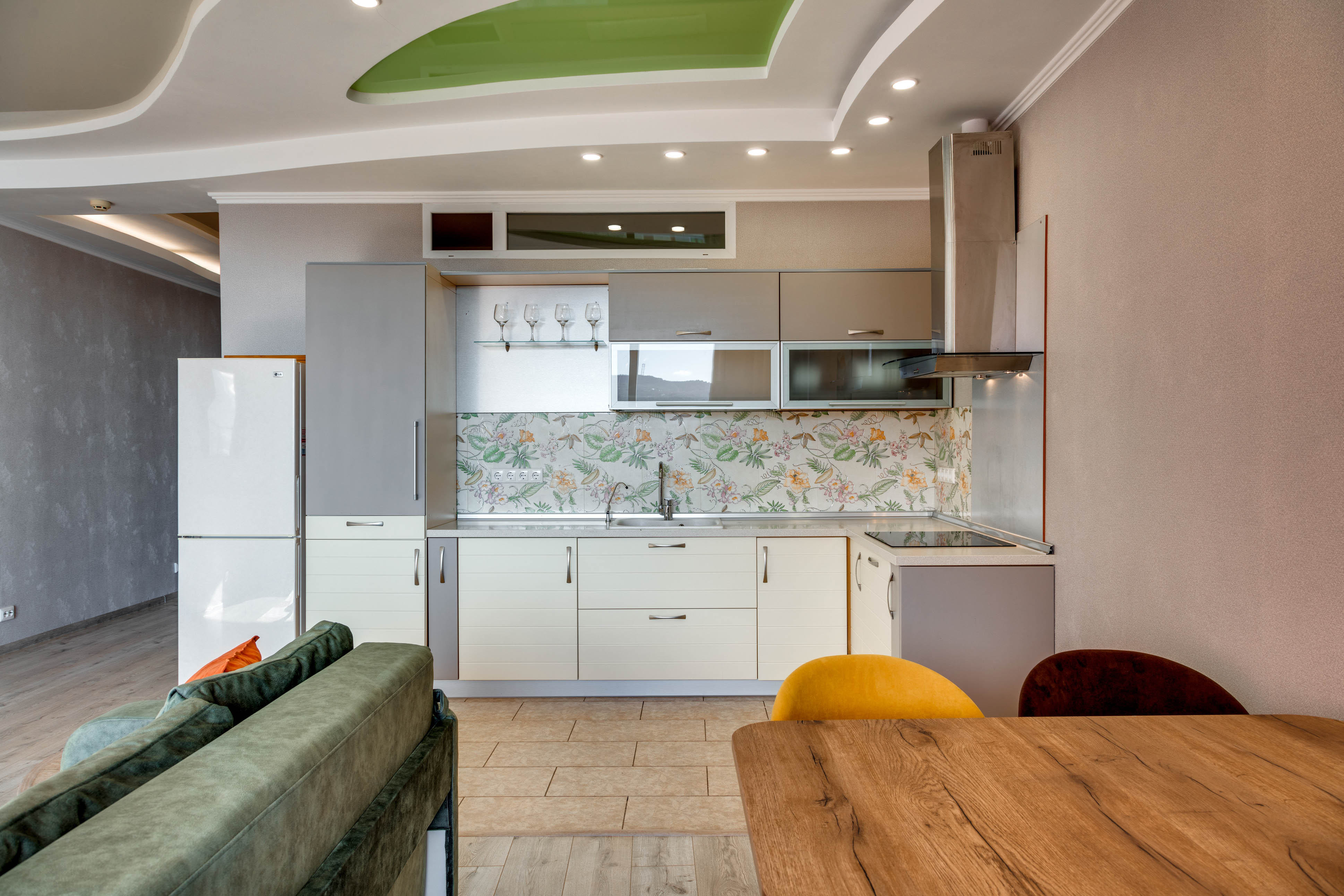 В номере: вешалка, диван, зеркало, кровать двуспальная, кухонная мебель, прикроватная тумбочка, стол, стулья, шкаф, микроволновая печь, плита электрическая, посудомоечная машина, телевизор, холодильник, электрочайник
