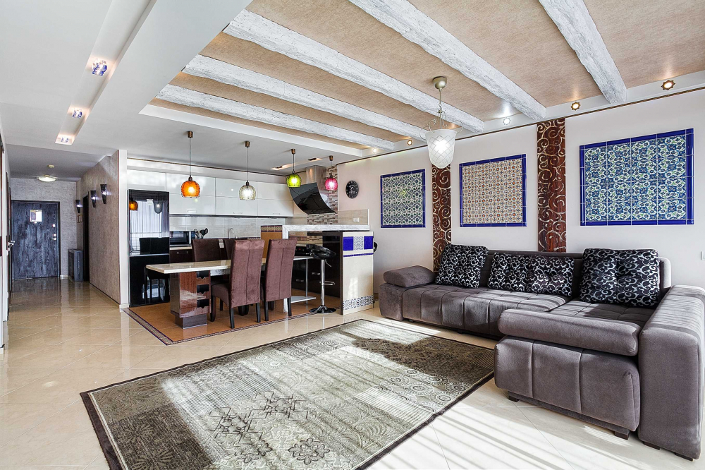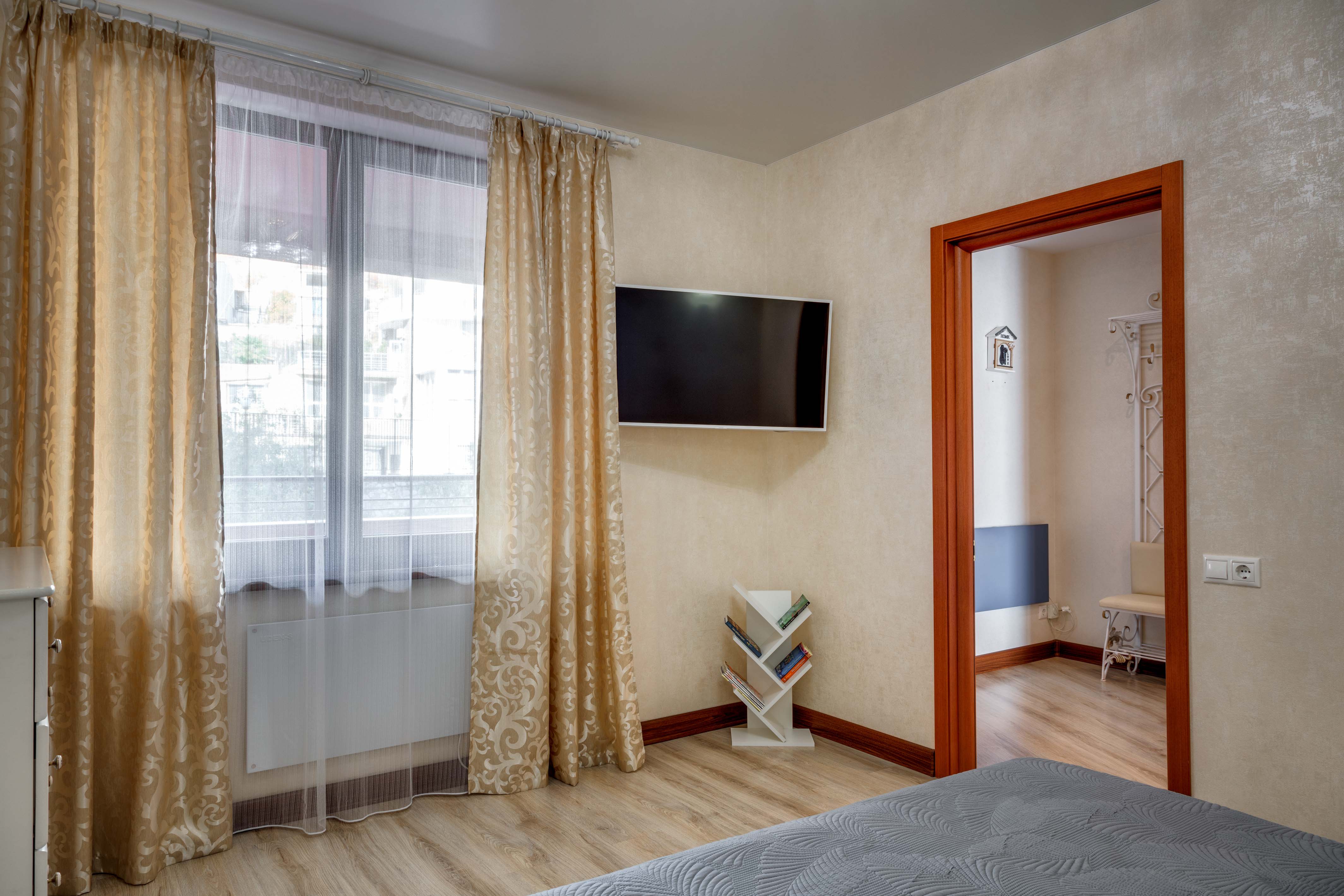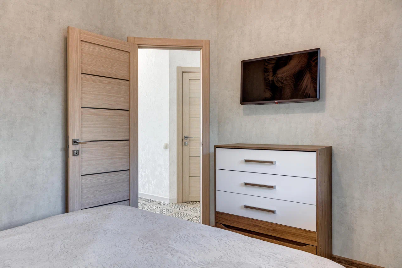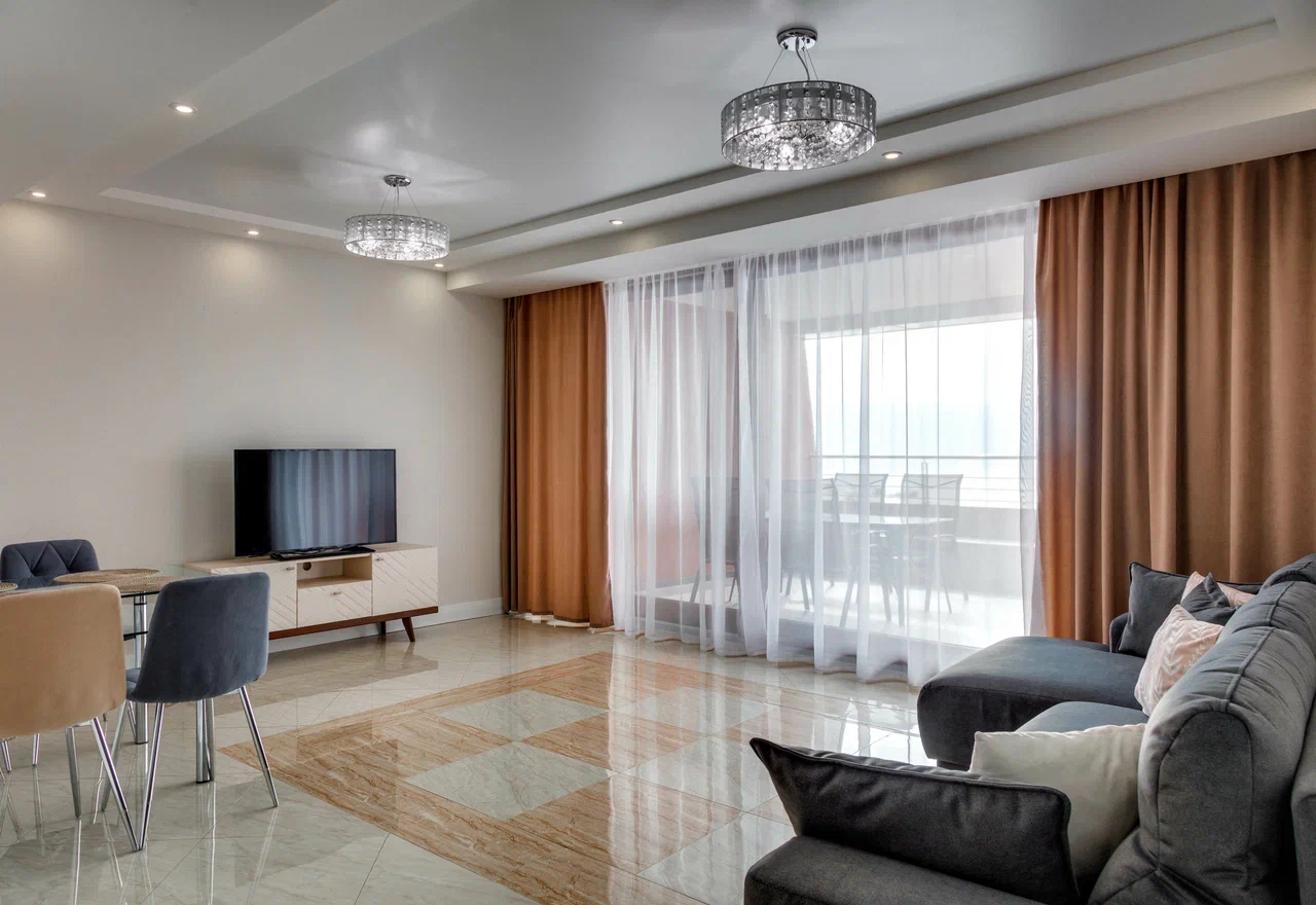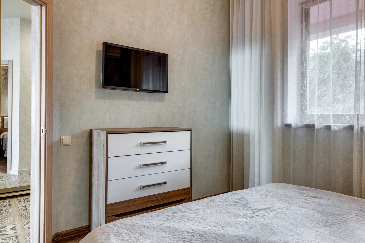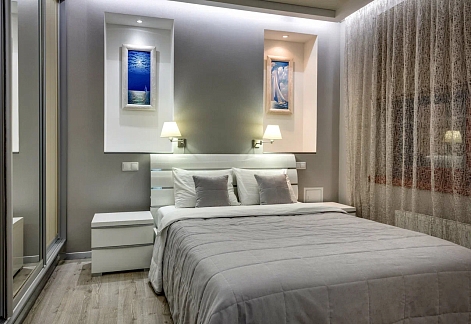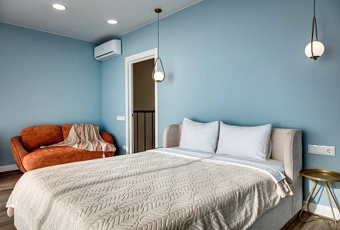 В номере: вешалка, диван, зеркало, кровать двуспальная, кухонная мебель, прикроватные тумбочки, стол, стулья, шкаф, кондиционер, микроволновая печь, плита электрическая, стиральная машина, телевизор, холодильник, электрочайник