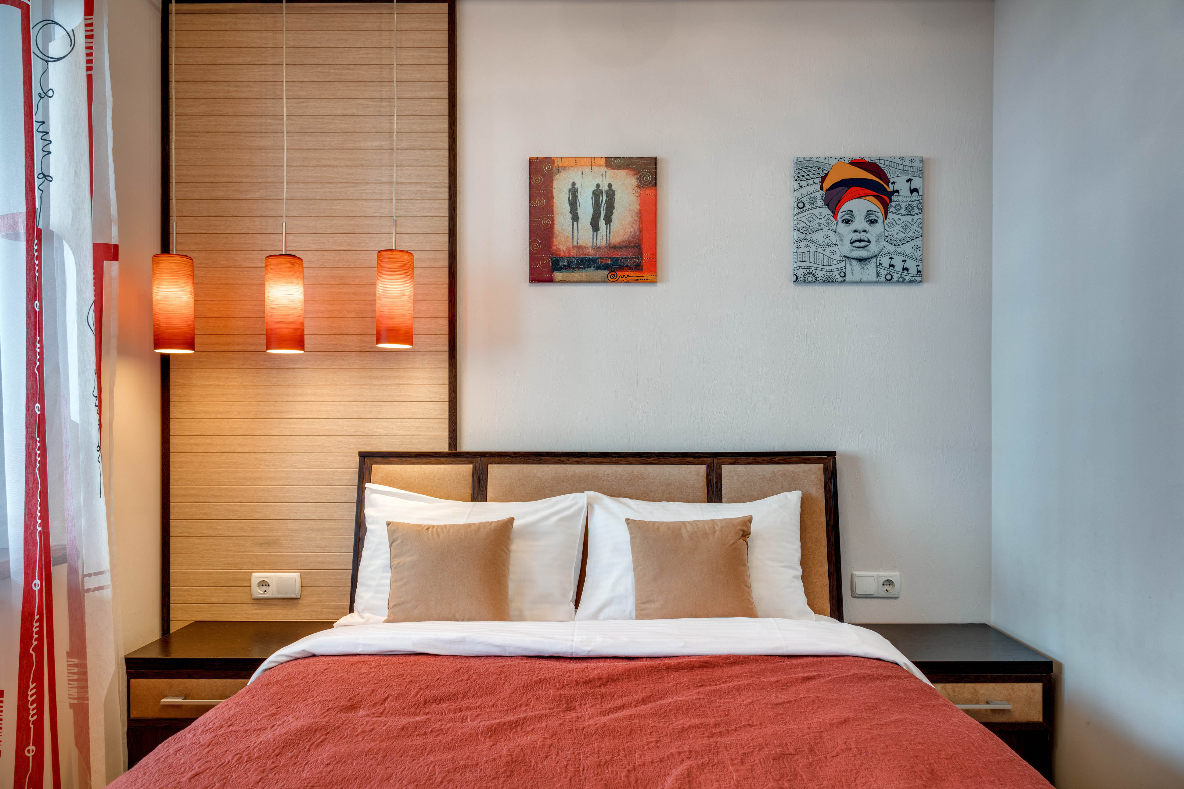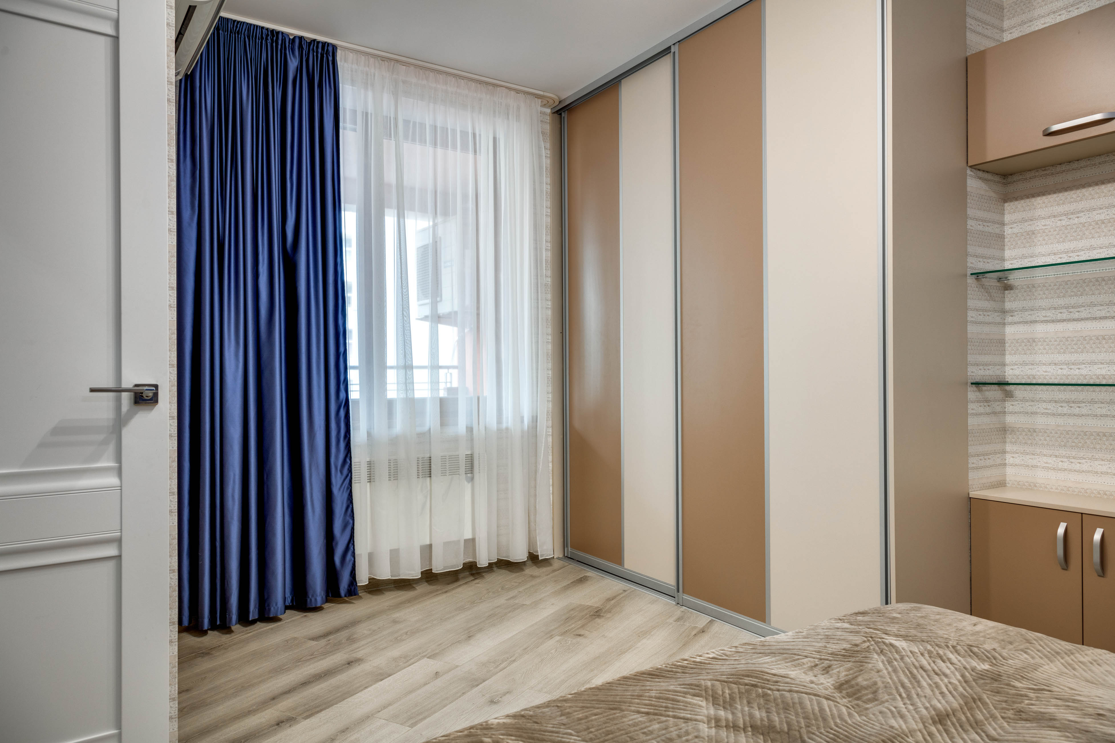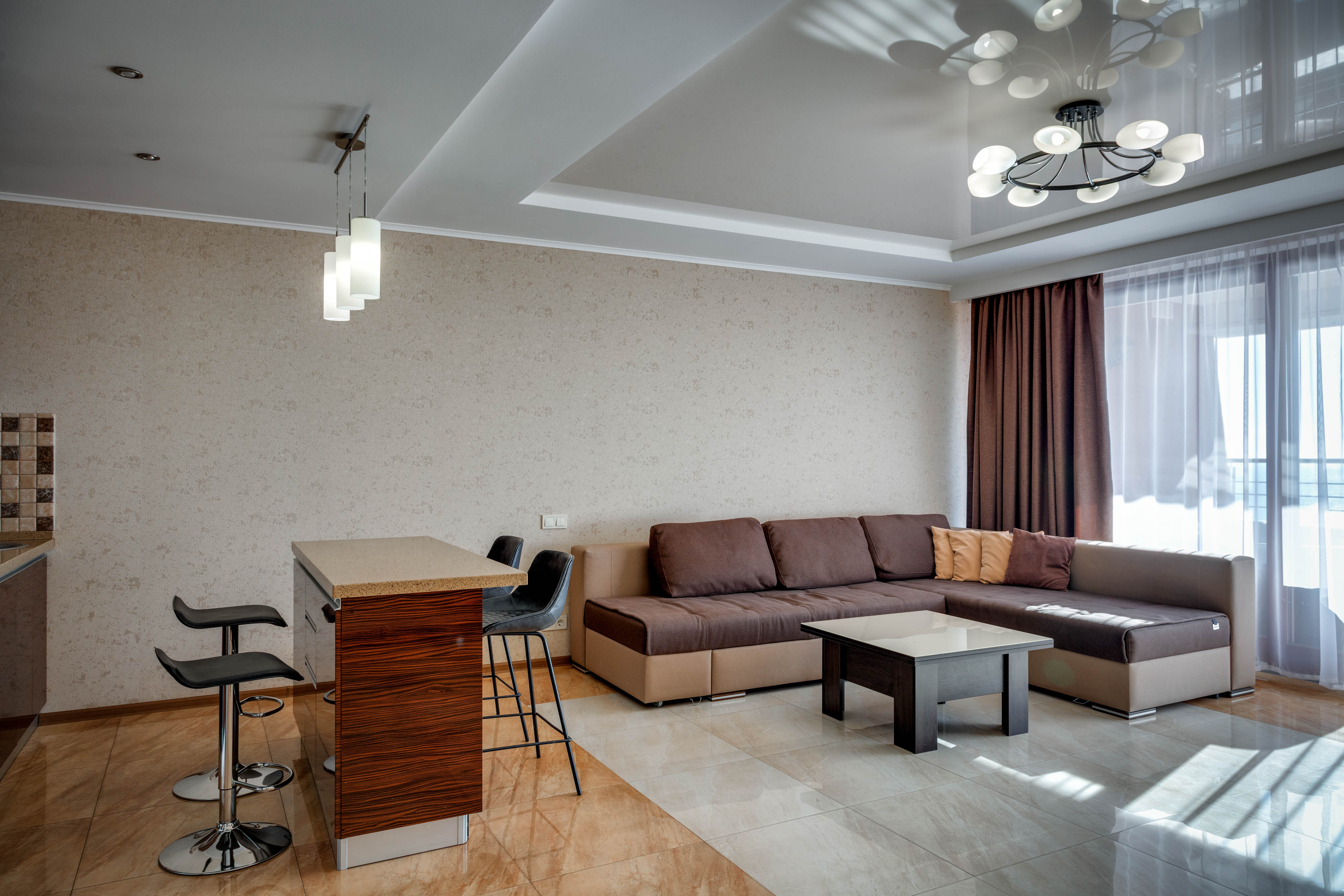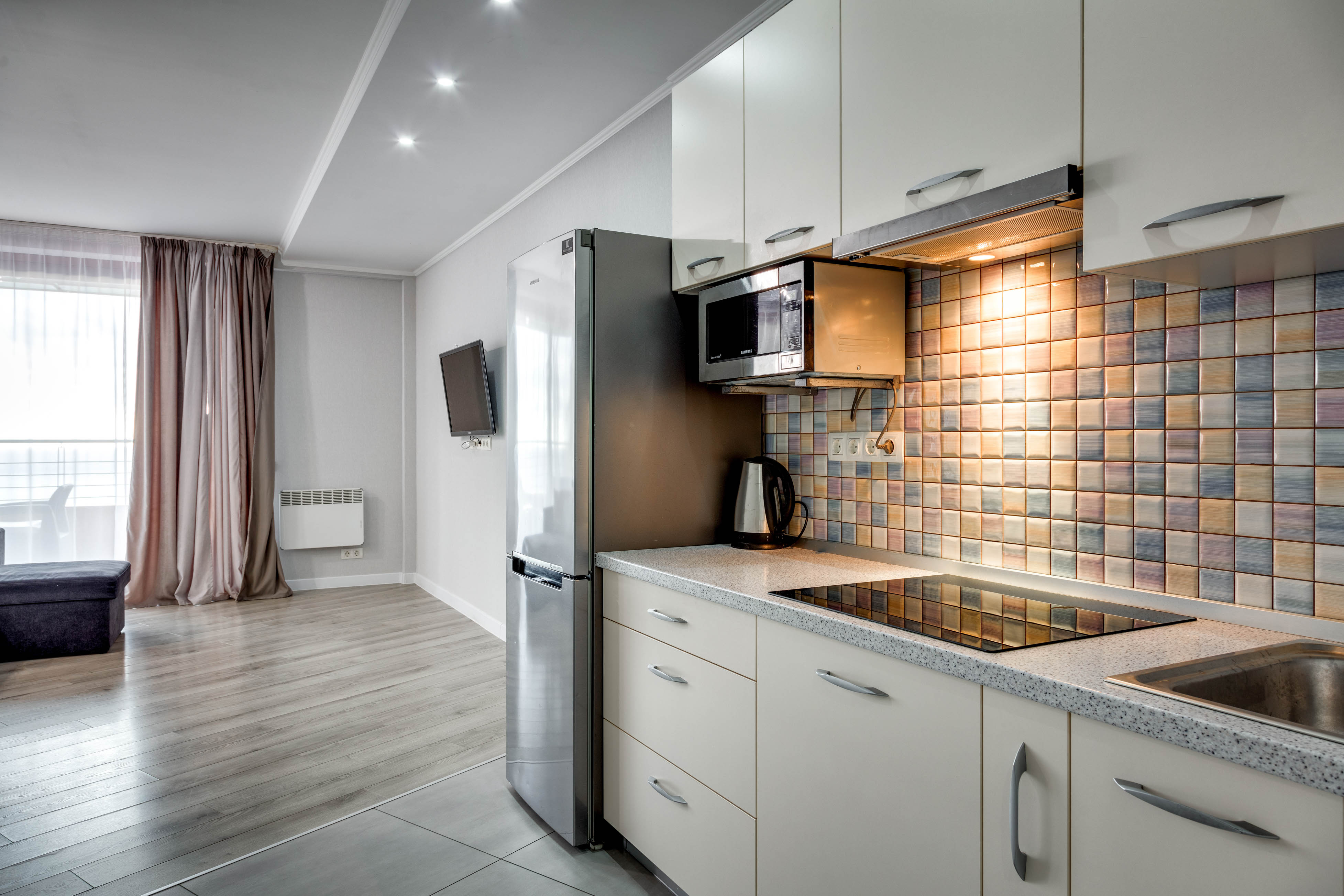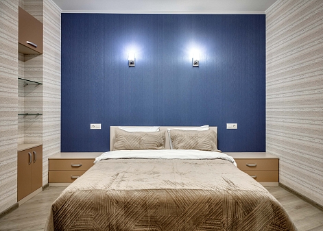В номере: вешалка, диван, зеркало, кровать двуспальная, кухонная мебель, прикроватные тумбочки, стол, стулья, шкаф, кондиционер, микроволновая печь, плита электрическая, стиральная машина, телевизор, холодильник, электрочайник