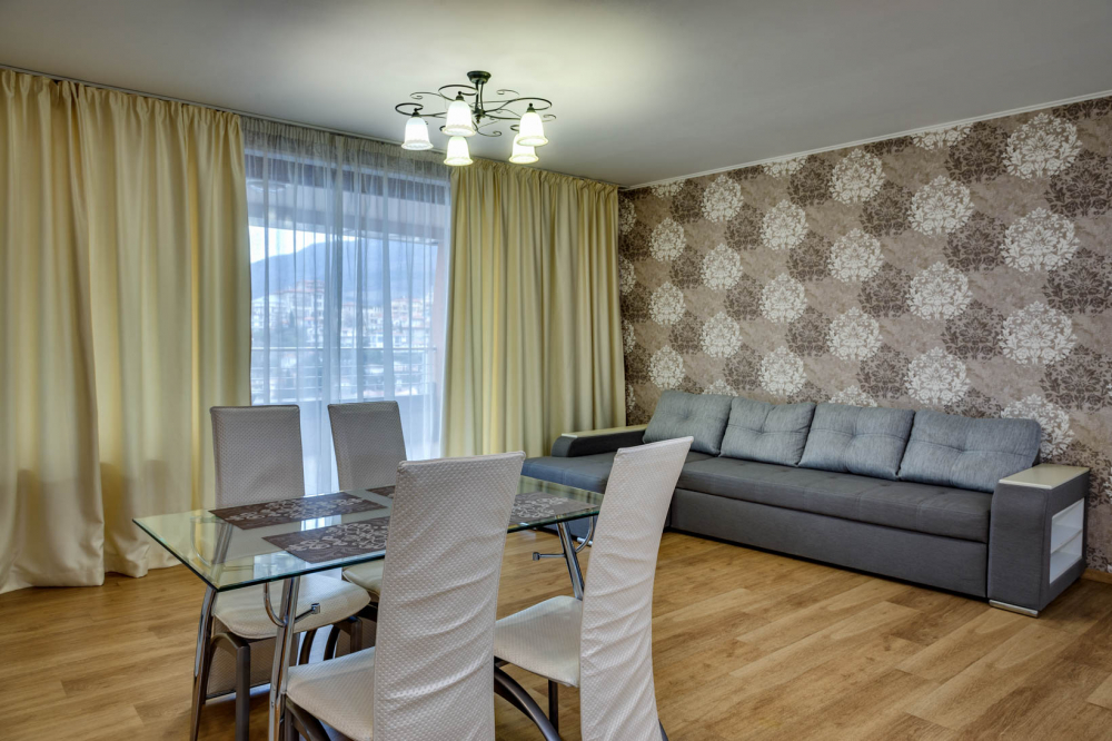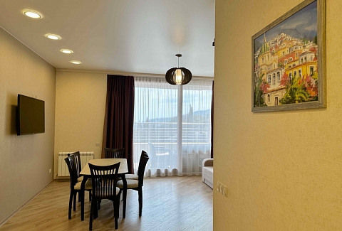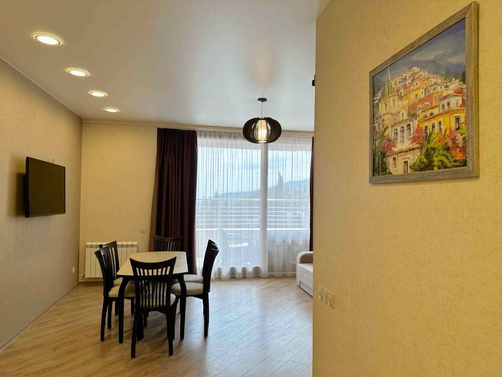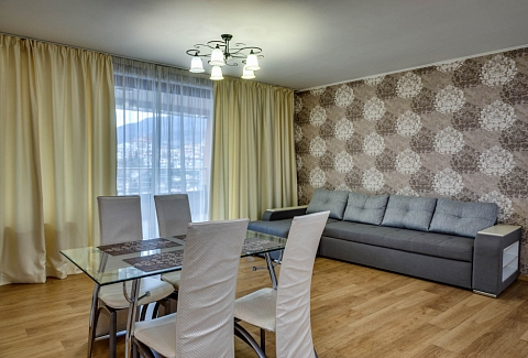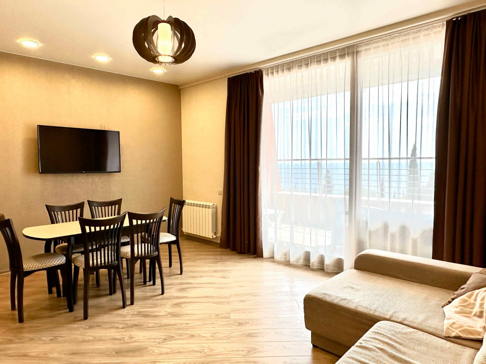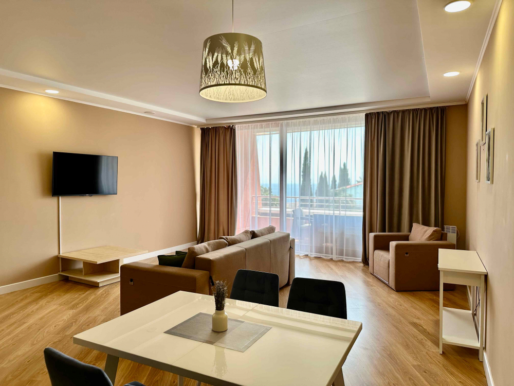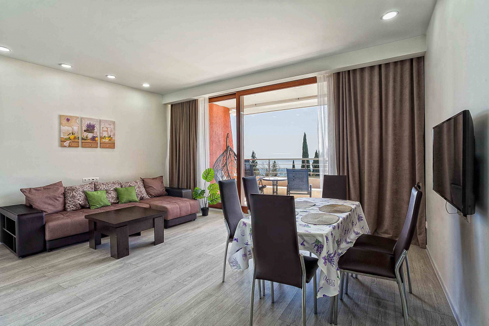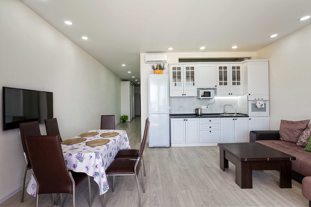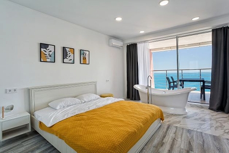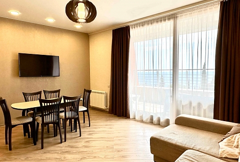 В распоряжении гостей номера разные по площади, вместимости и категории. Комплектация апартаментов отвечает самым высоким требованиям. Везде современный стильный интерьер, в каждом номере полноценная кухня, есть стиральная машина, кондиционер и другая бытовая техника. В ванной комнате душевая кабинка. В ряде апартаментов панорамные окна, из всех комнат открывается восхитительный вид на море.На первом этаже комплекса работает кафе, а на благоустроенной территории организована барбекю-зона, перед корпусом — большой бассейн под открытым небом. В числе удобств — тренажерный зал, бильярд, пинг-понг, подземный паркинг. Дети могут провести время на игровой площадке.В 15 минутах неспешной ходьбы находится оборудованный пляж, покрытый галькой.