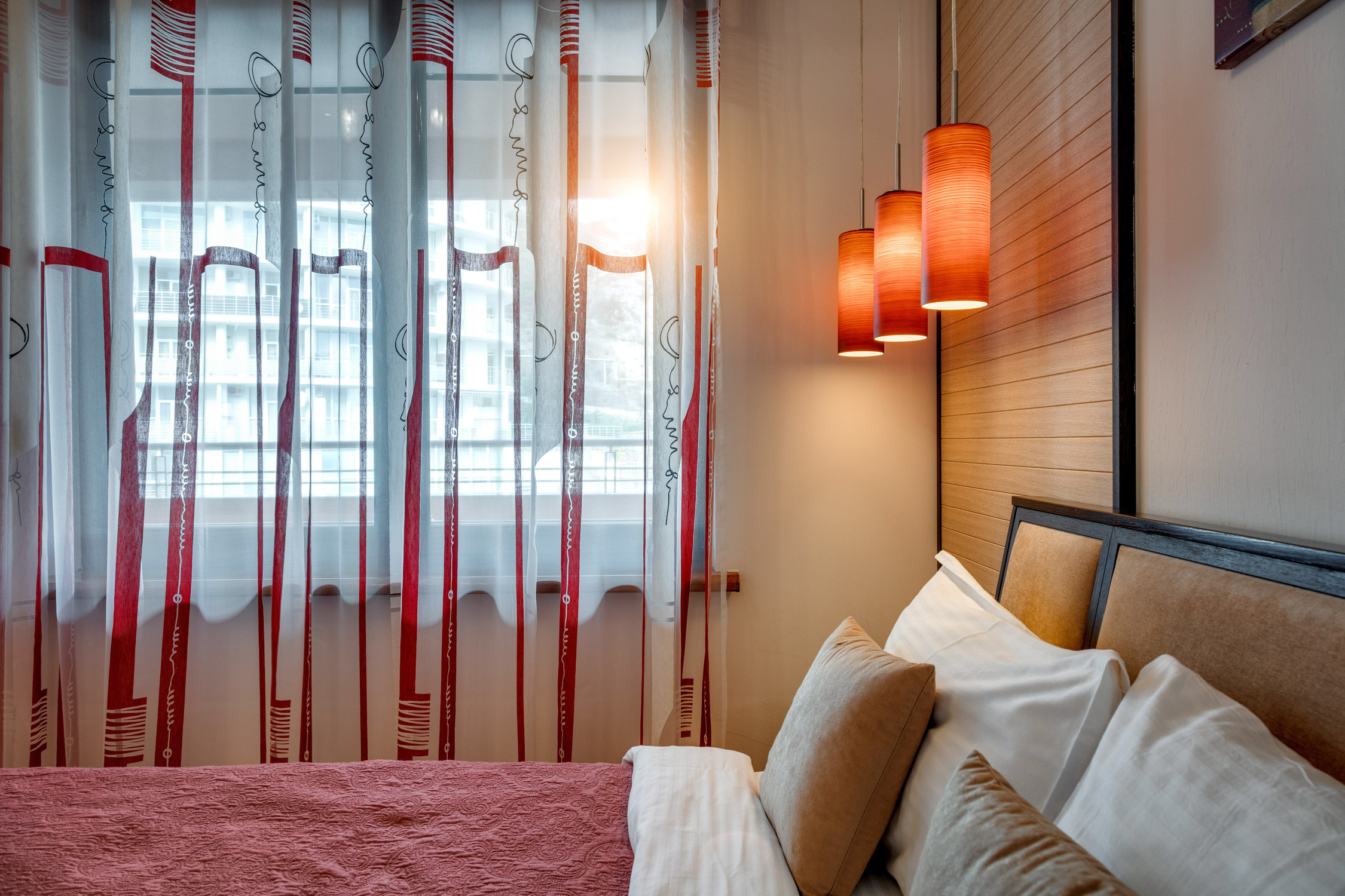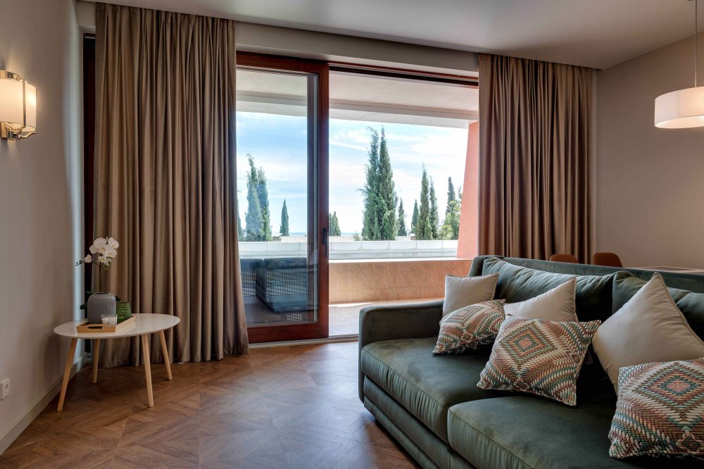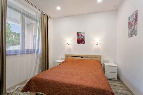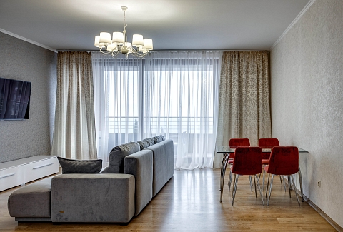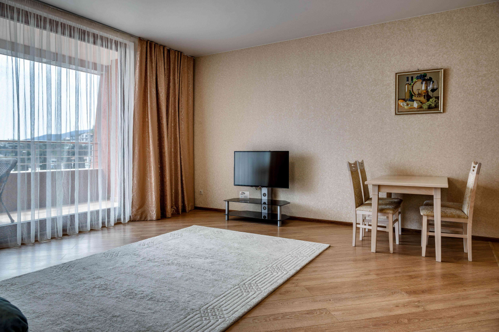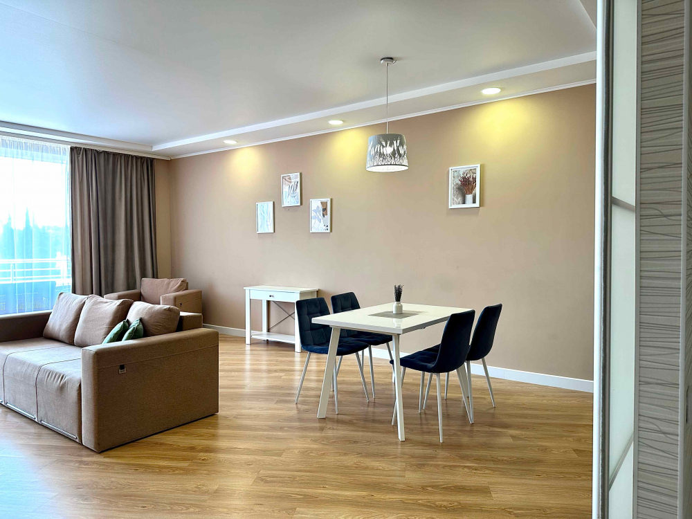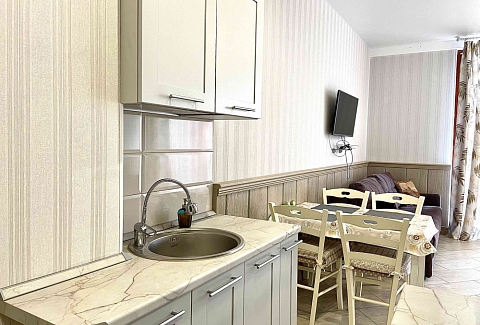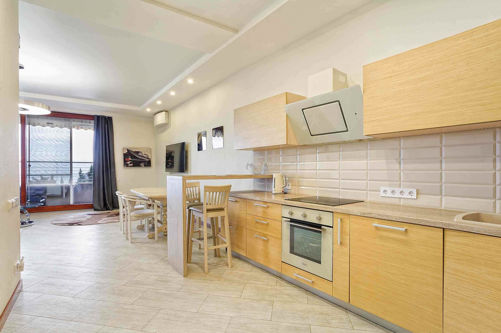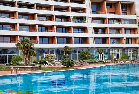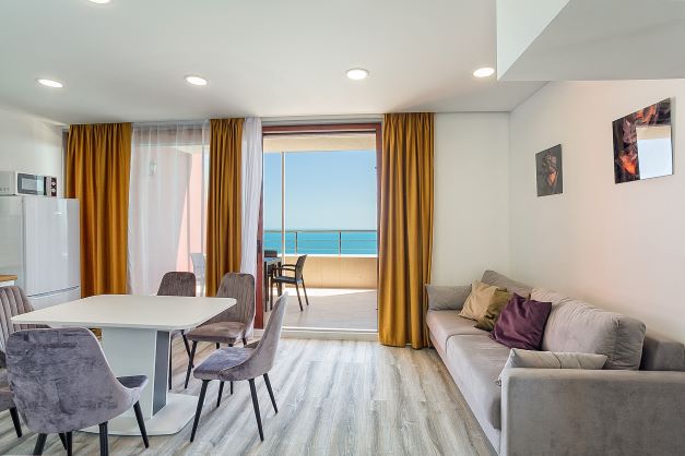 В распоряжении гостей номера разные по площади, вместимости и категории. Комплектация апартаментов отвечает самым высоким требованиям. Везде современный стильный интерьер, в каждом номере полноценная кухня, есть стиральная машина, кондиционер и другая бытовая техника. В ванной комнате душевая кабинка. В ряде апартаментов панорамные окна, из всех комнат открывается восхитительный вид на море.На первом этаже комплекса работает кафе, а на благоустроенной территории организована барбекю-зона, перед корпусом — большой бассейн под открытым небом. В числе удобств — тренажерный зал, бильярд, пинг-понг, подземный паркинг. Дети могут провести время на игровой площадке.В 15 минутах неспешной ходьбы находится оборудованный пляж, покрытый галькой.