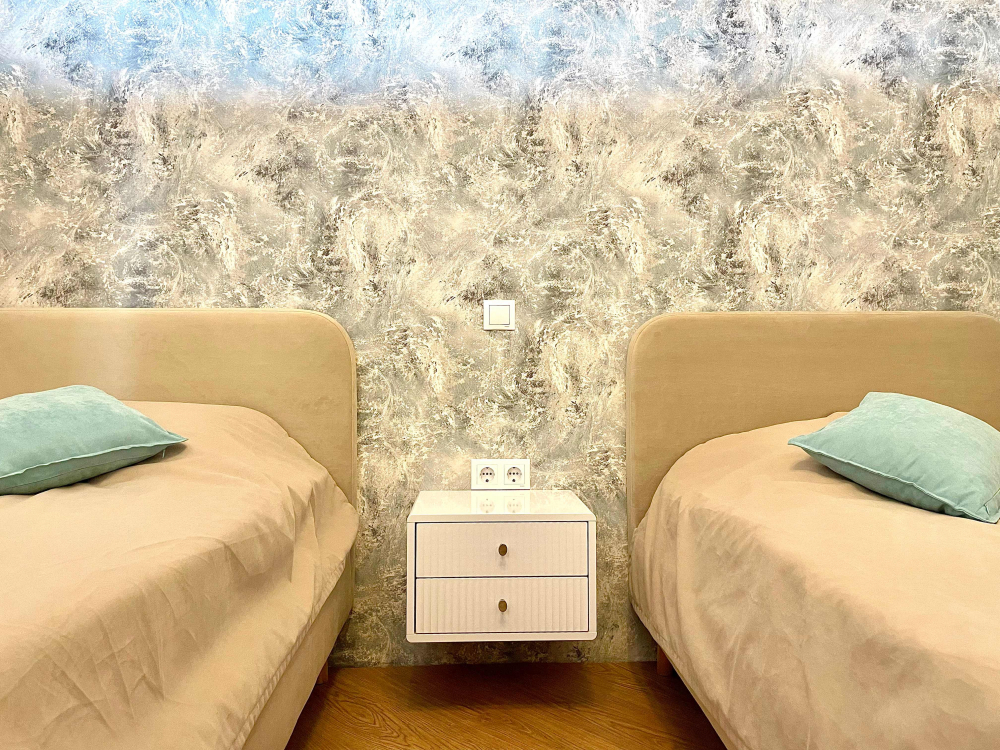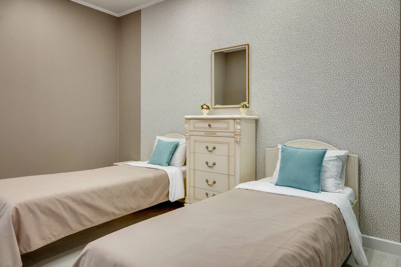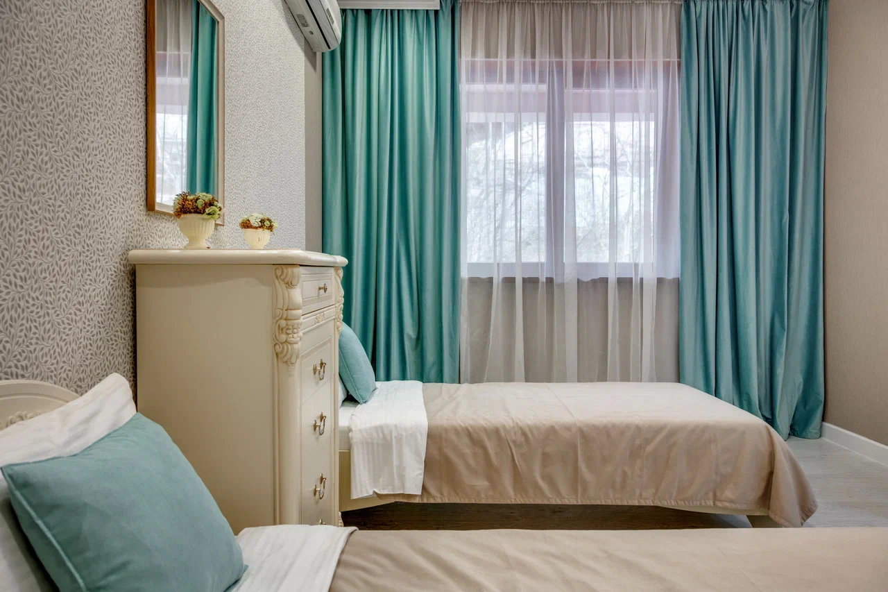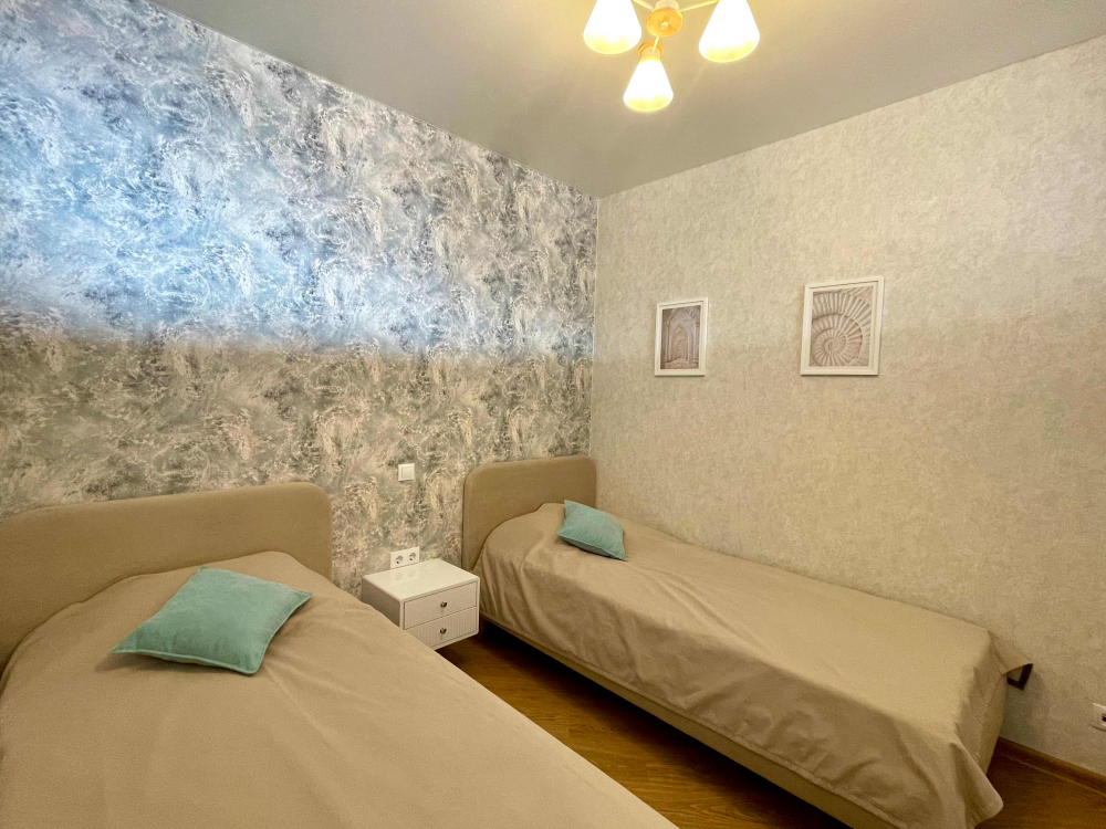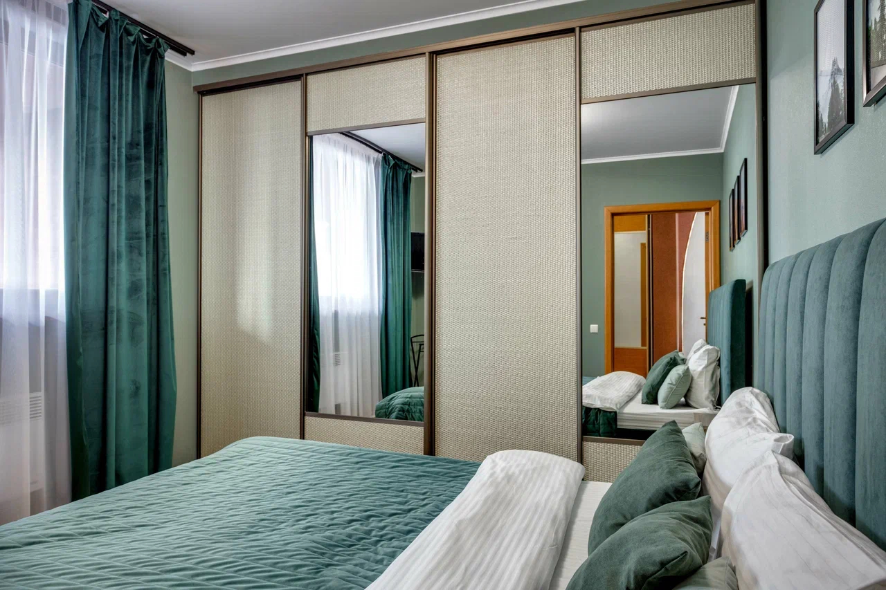 В номере: вешалка, диван раскладной, зеркало, кровати односпальные, кровать двуспальная, кухонная мебель, прикроватные тумбочки, стол, стулья, шкаф, кондиционер, микроволновая печь, плита электрическая, стиральная машина, телевизор, холодильник, электрочайник