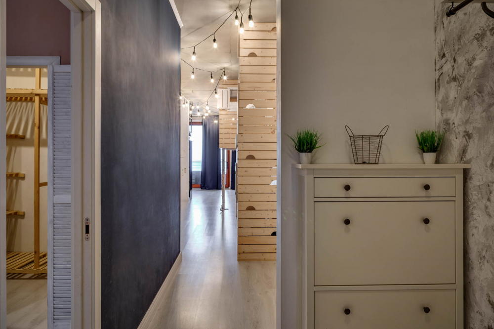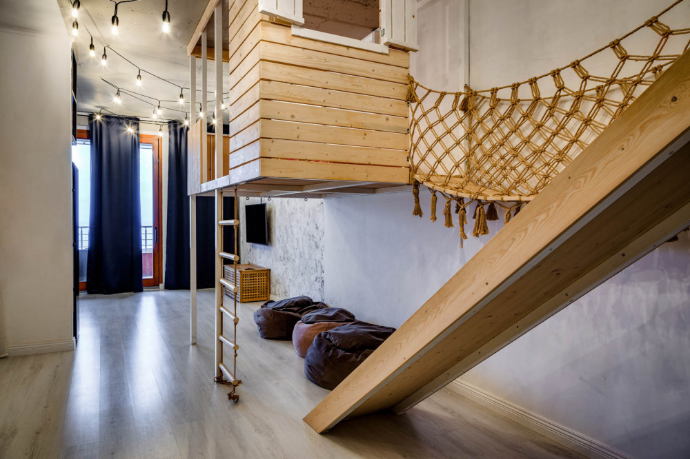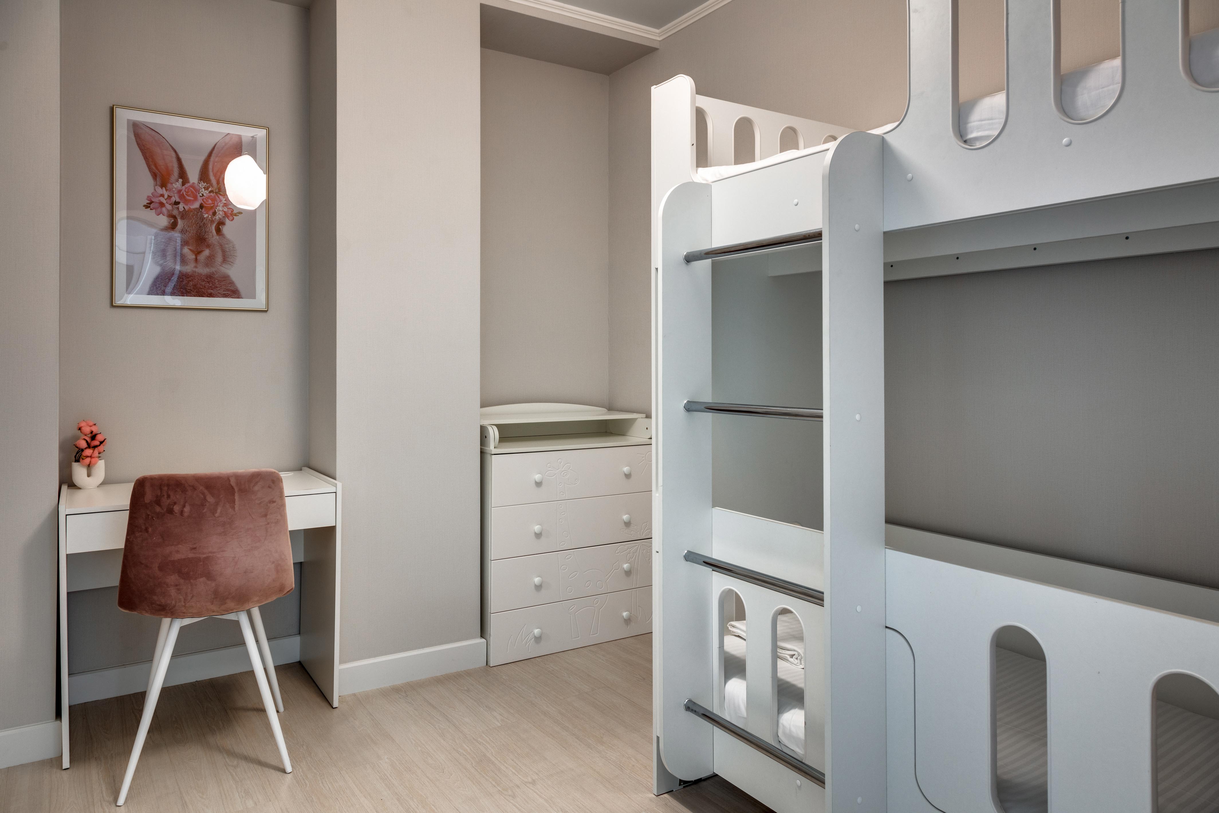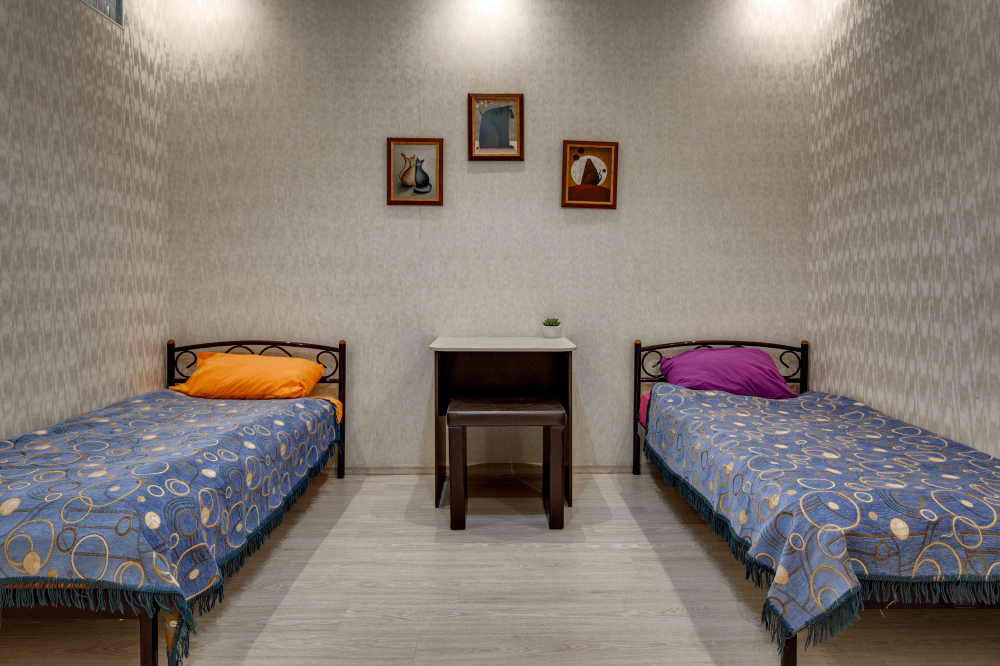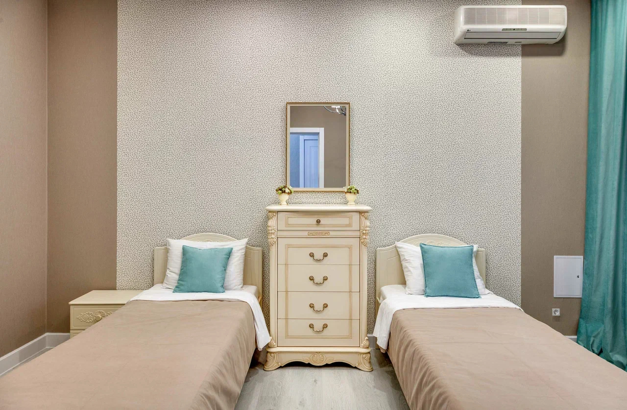 В номере: вешалка, зеркало, кровать двуспальная, кровать двухъярусная, прикроватные тумбочки, стол, стулья, шкаф, кондиционер, микроволновая печь, плита электрическая, стиральная машина, телевизор, холодильник, электрочайник