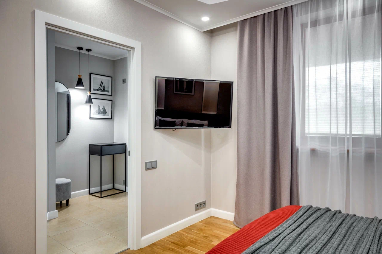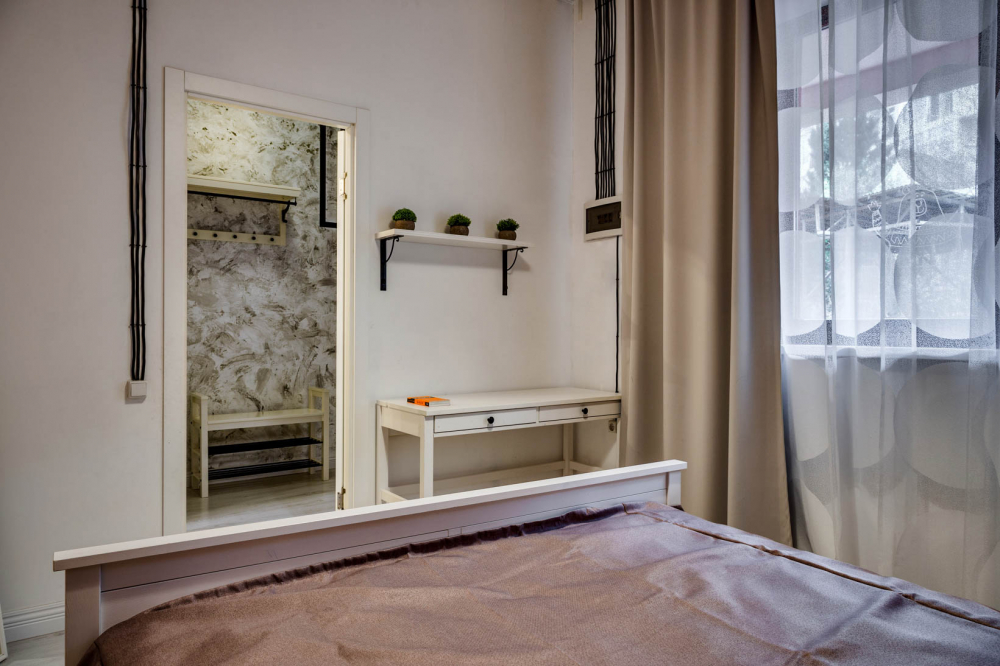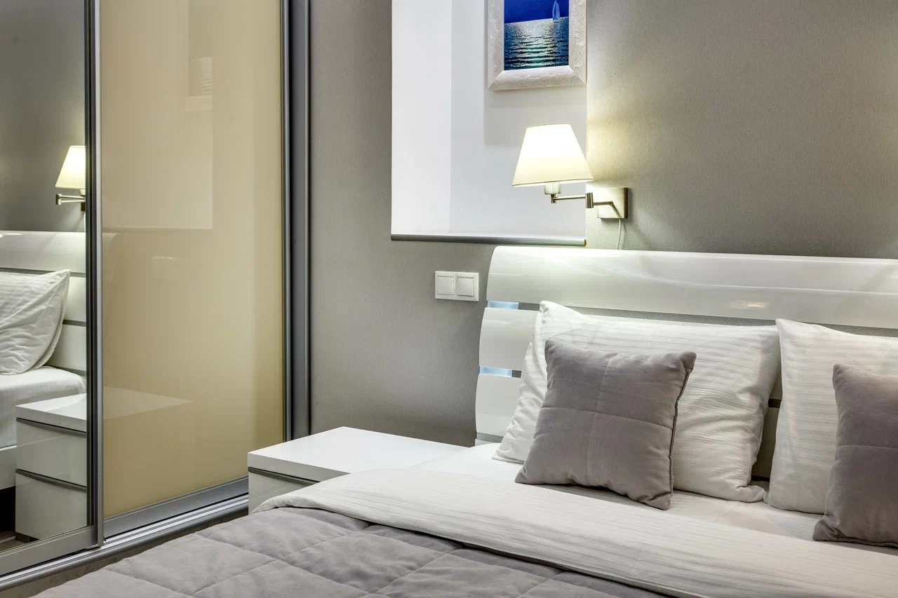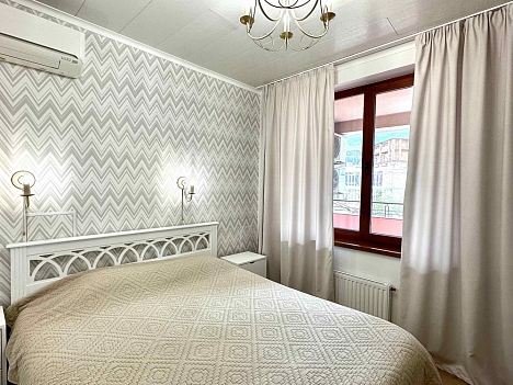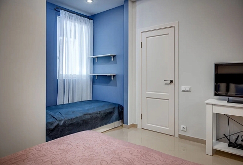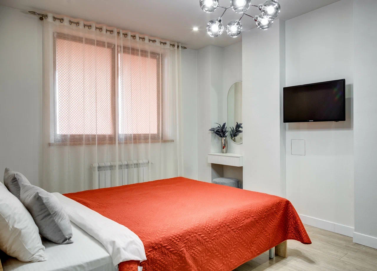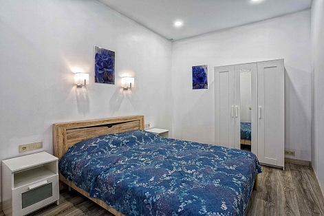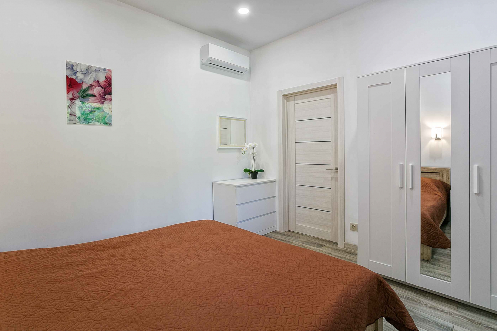 В номере: вешалка, диван раскладной, зеркало, кровать двуспальная, кухонная мебель, прикроватные тумбочки, стол, стулья, шкаф, кондиционер, плита электрическая, стиральная машина, телевизор, холодильник, электрочайник