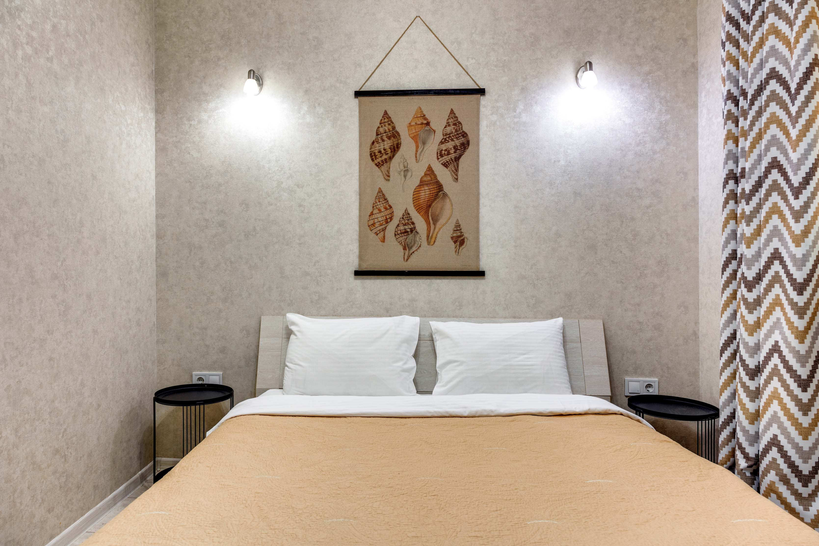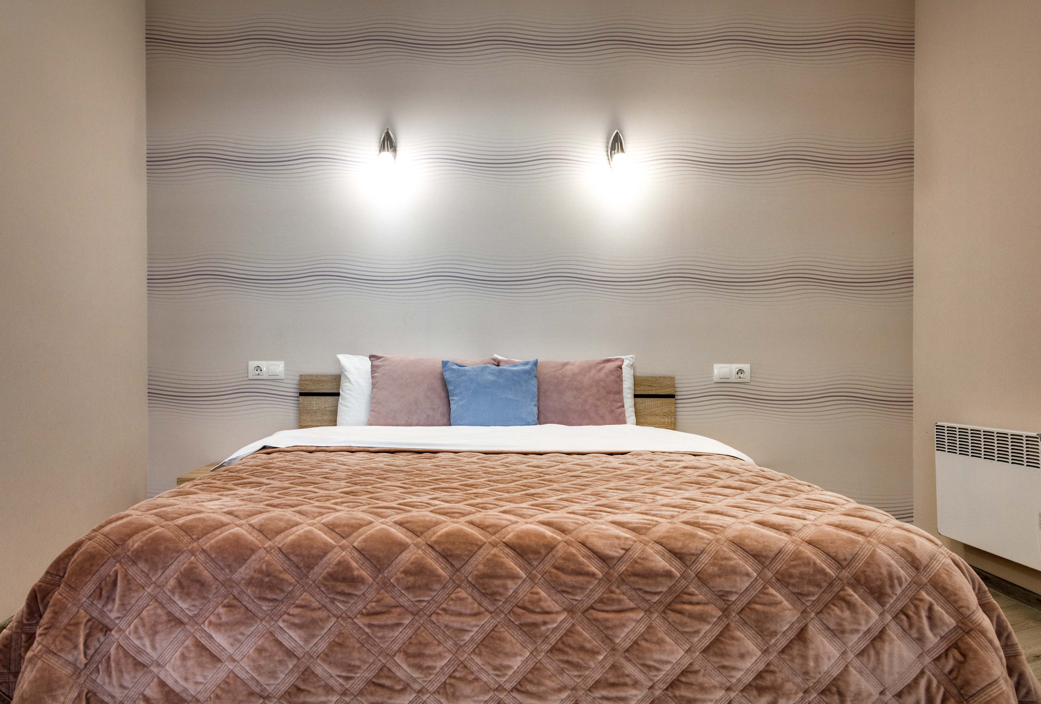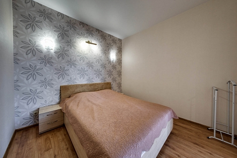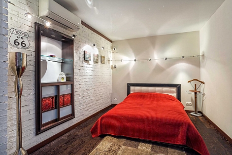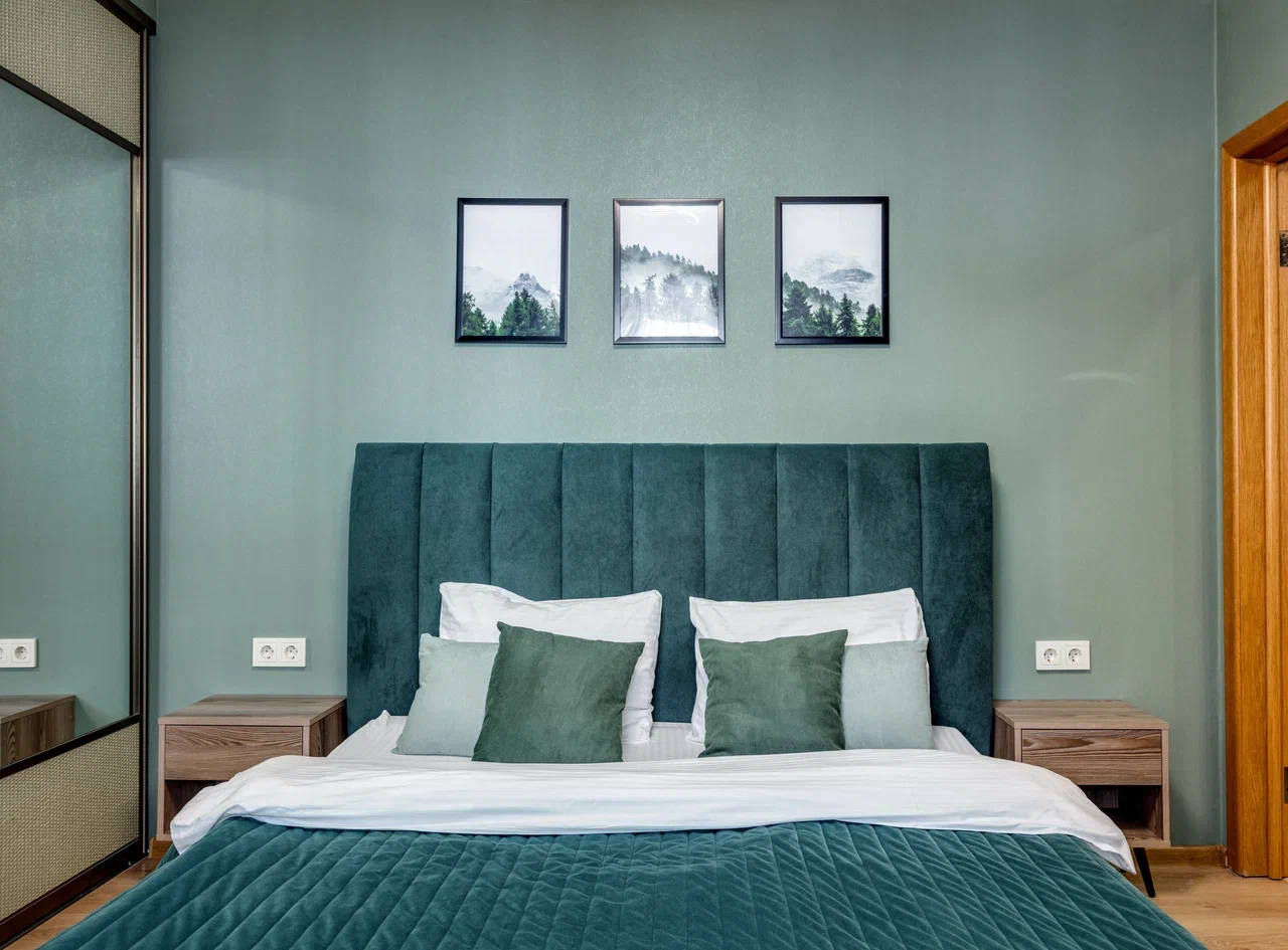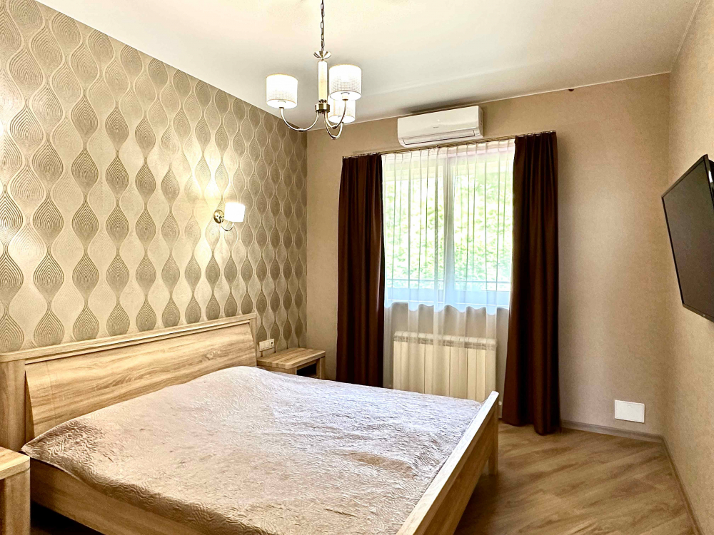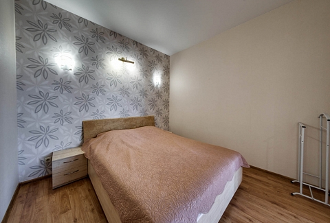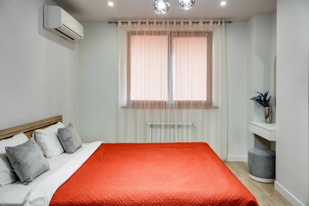 В номере: вешалка, диван раскладной, зеркало, кровать двуспальная, кухонная мебель, прикроватные тумбочки, стол, стулья, шкаф, кондиционер, плита электрическая, стиральная машина, телевизор, холодильник, электрочайник