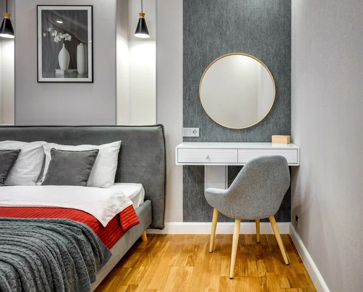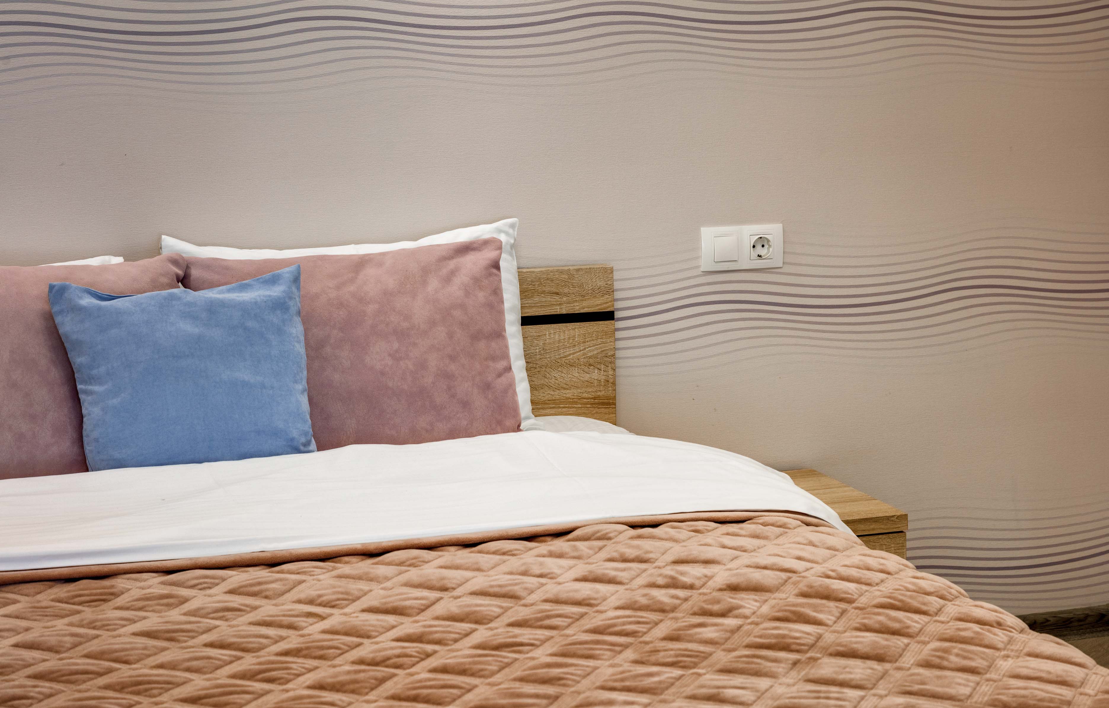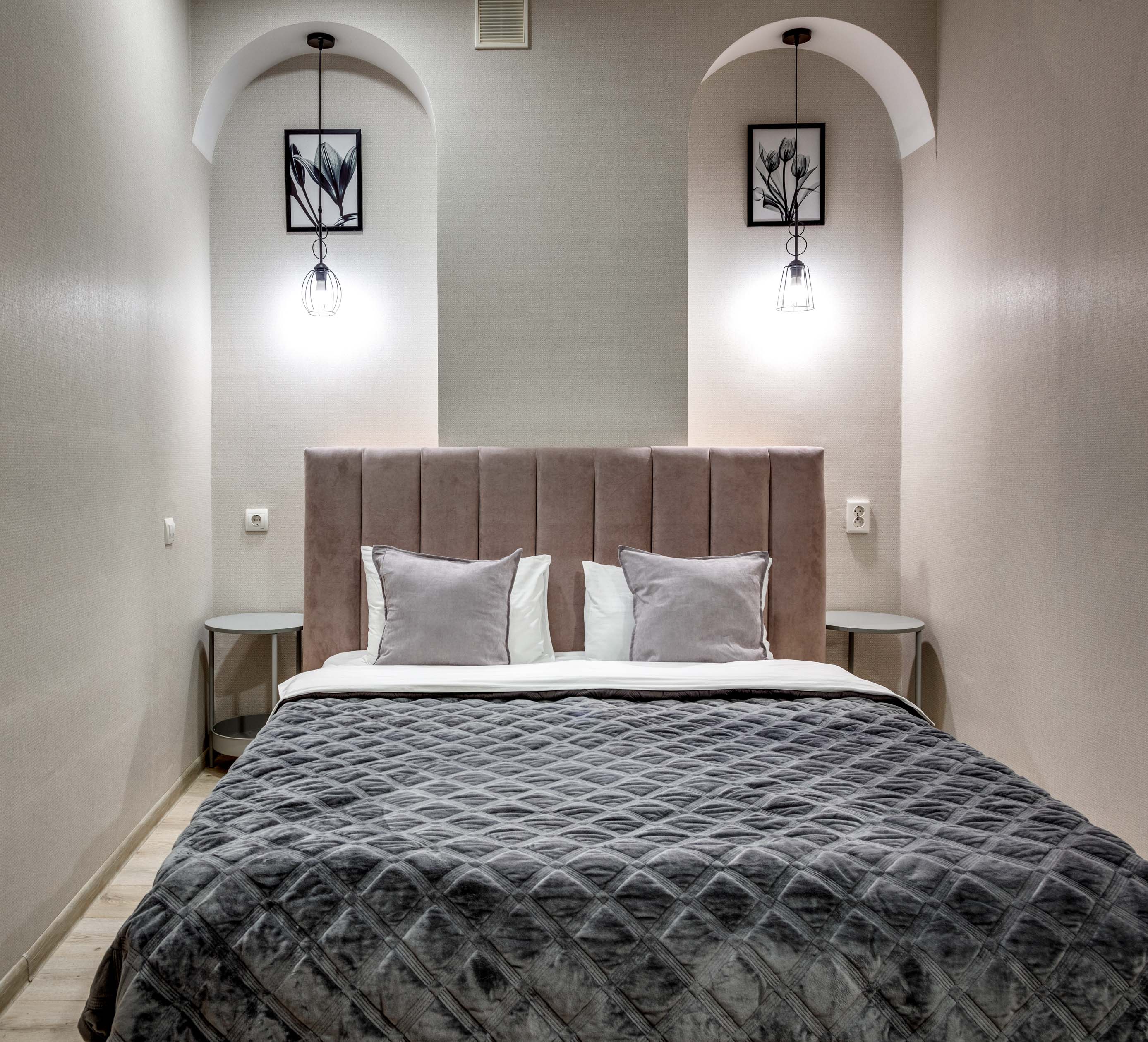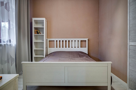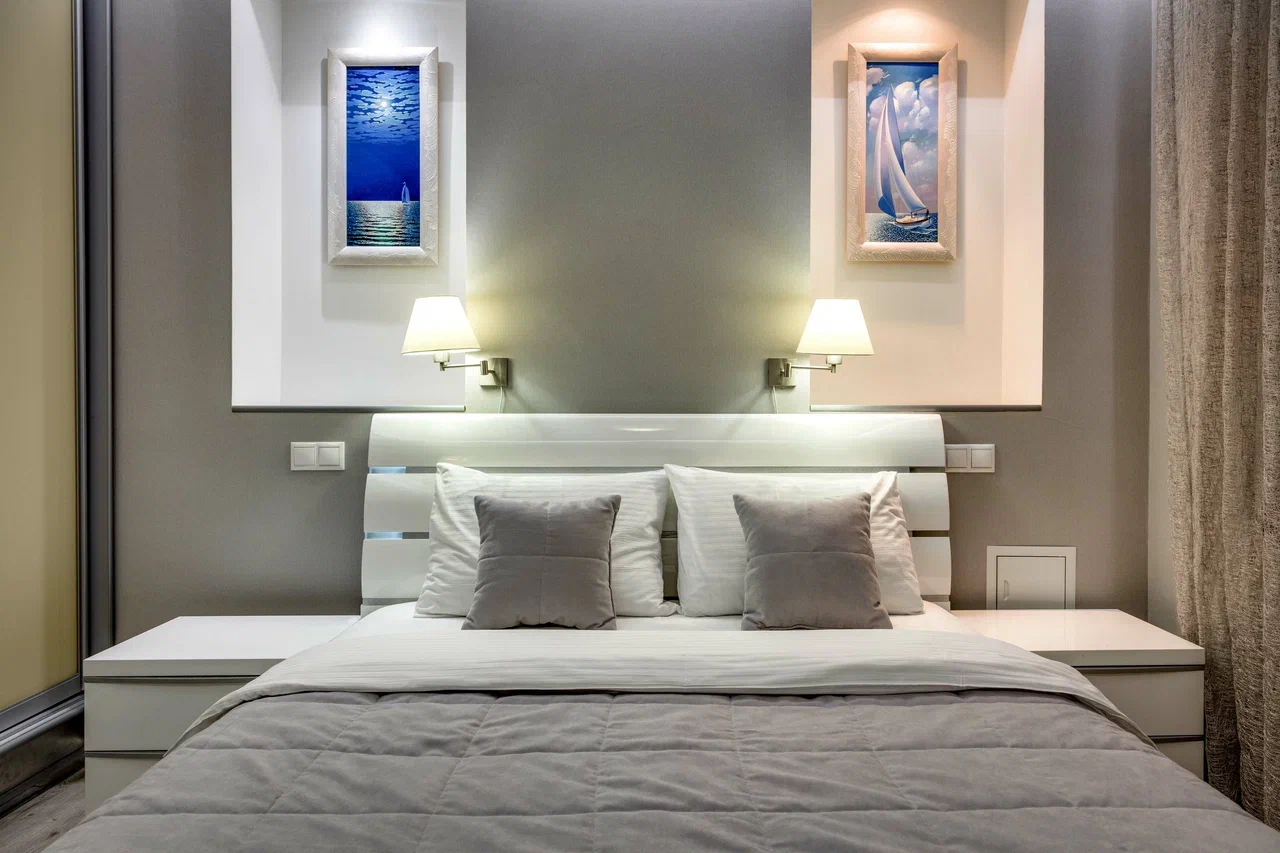 В номере: вешалка, диван раскладной, зеркало, кровать двуспальная, кухонная мебель, прикроватные тумбочки, стол, стулья, шкаф, кондиционер, плита электрическая, стиральная машина, телевизор, холодильник, электрочайник