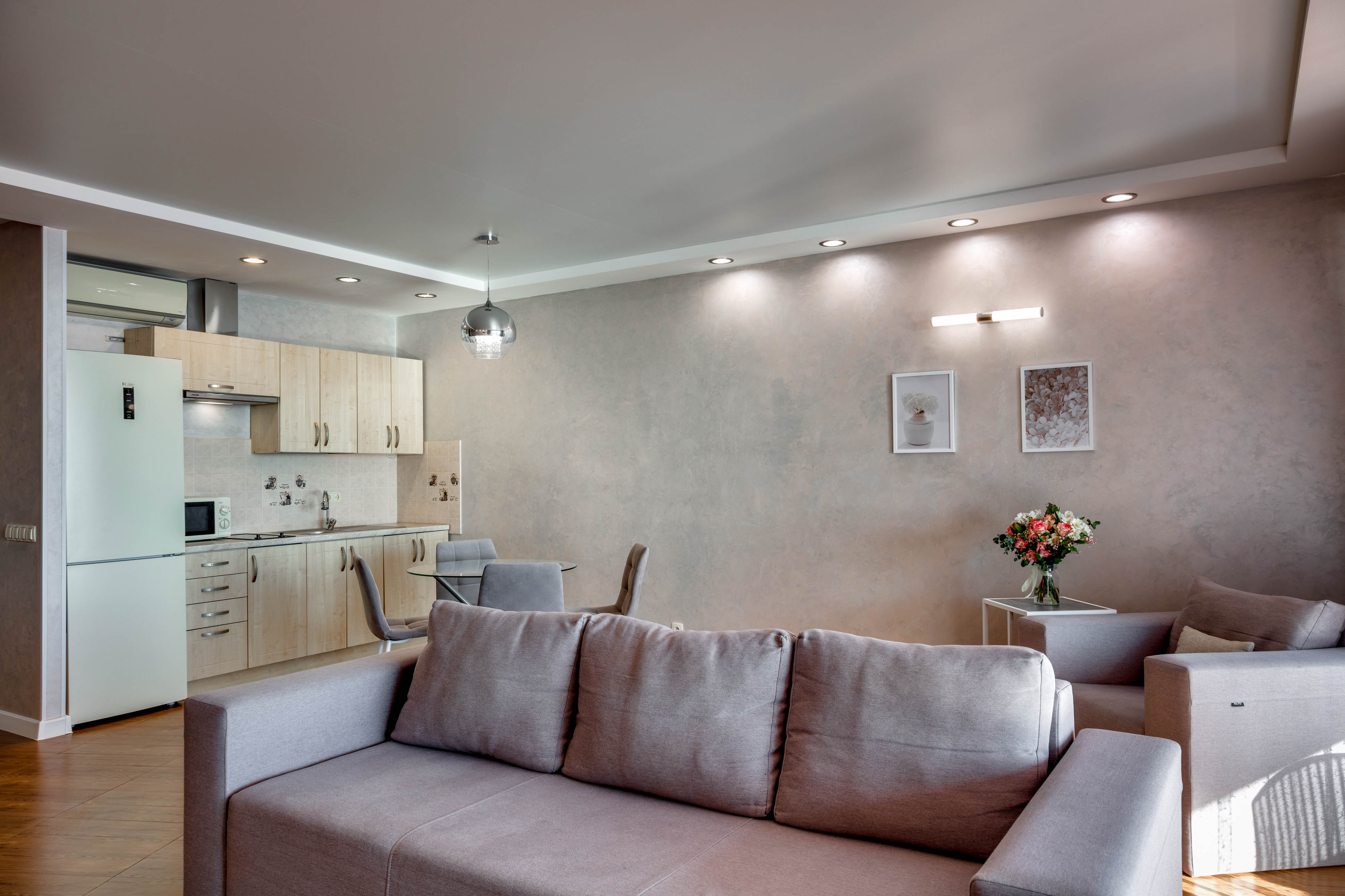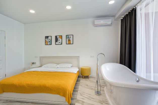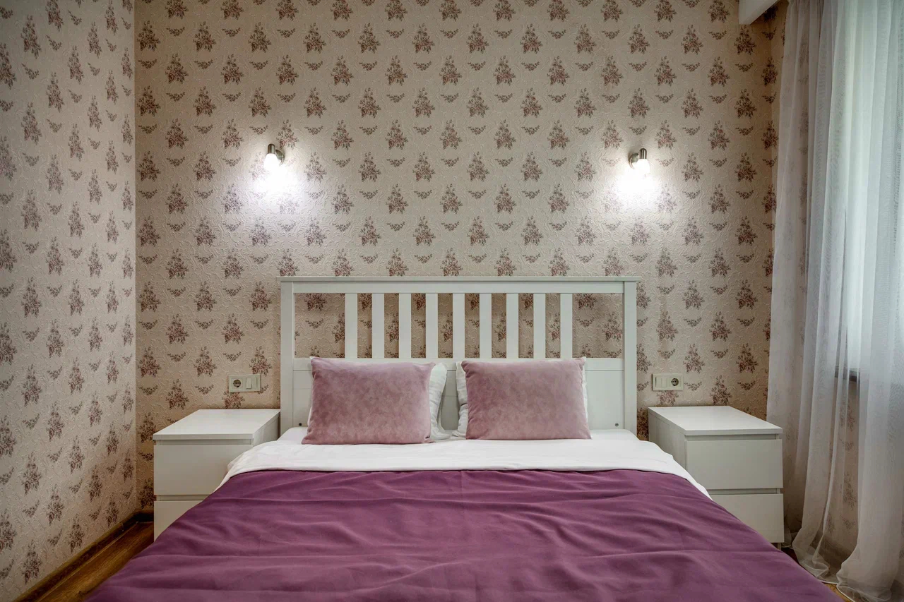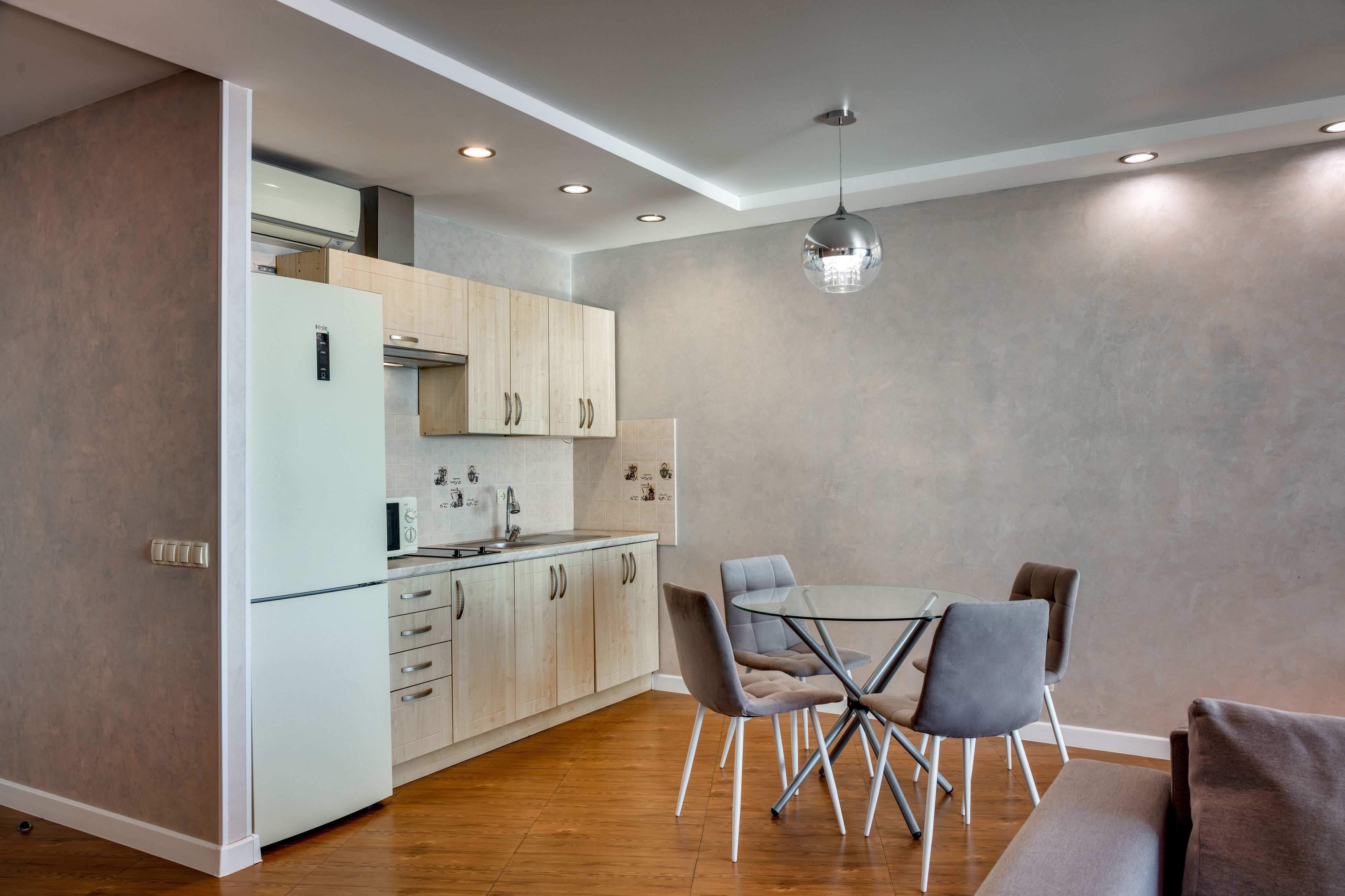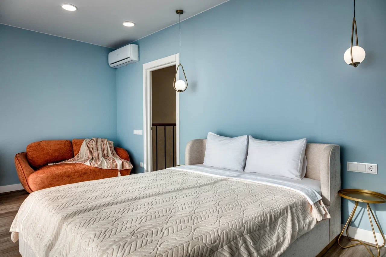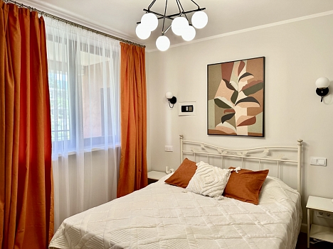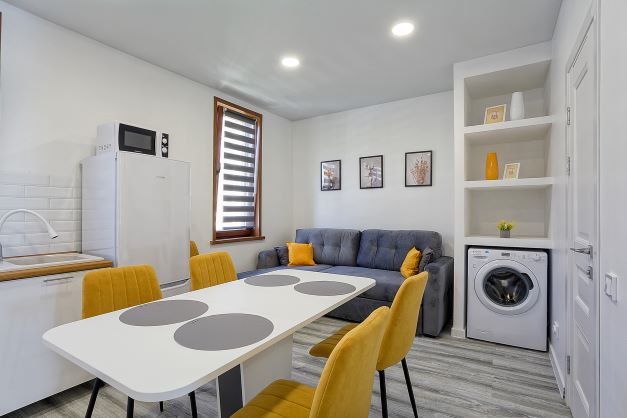 В номере: вешалка, диван, зеркало, кровать двуспальная, кухонная мебель, прикроватные тумбочки, стол, стулья, шкаф, кондиционер, микроволновая печь, стиральная машина, телевизор, холодильник, электрочайник