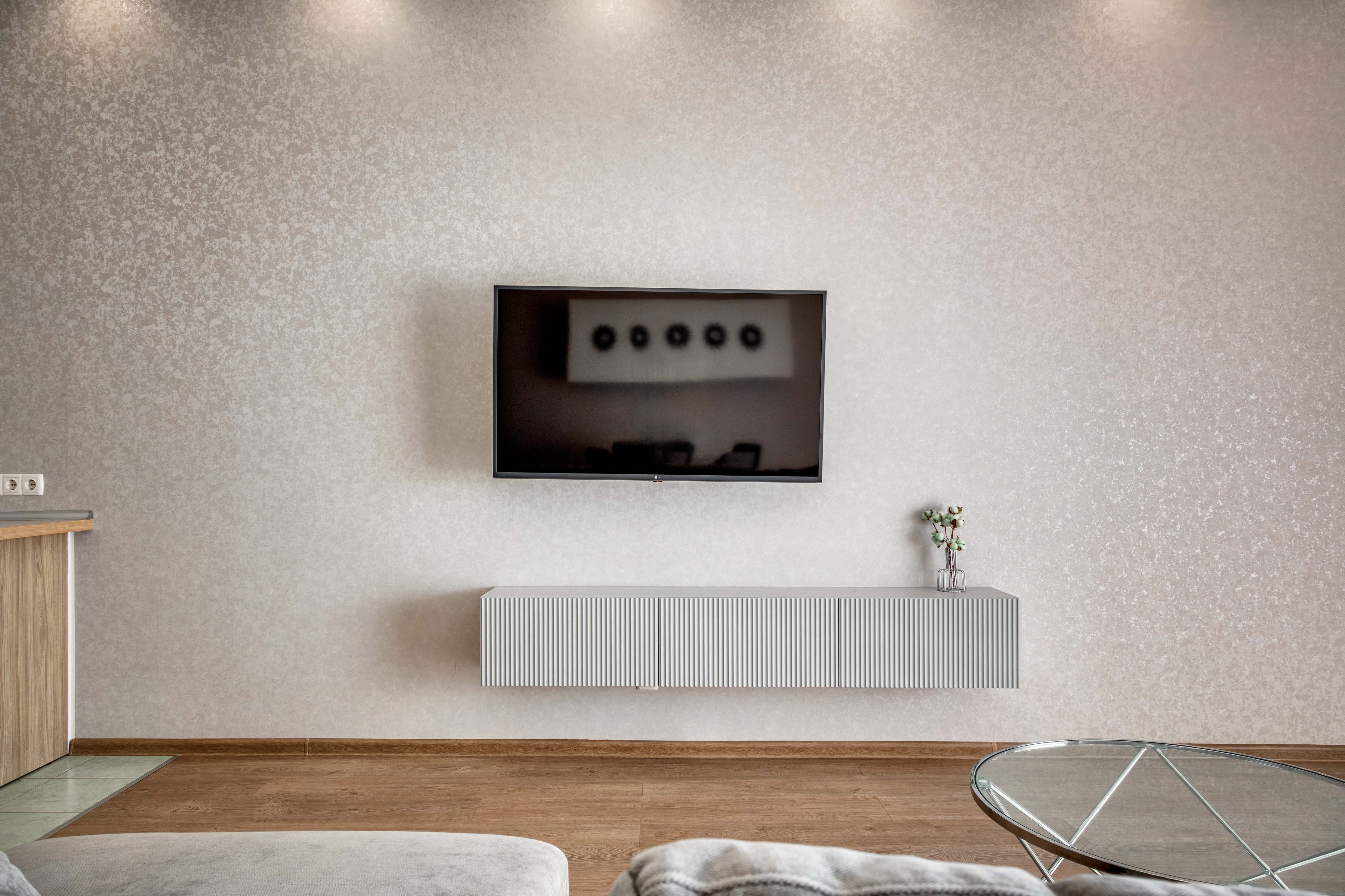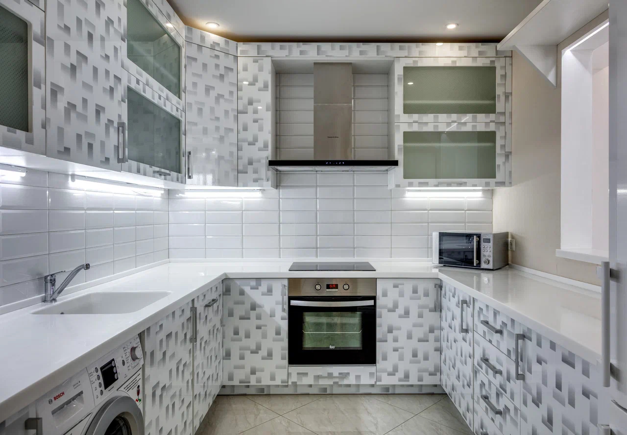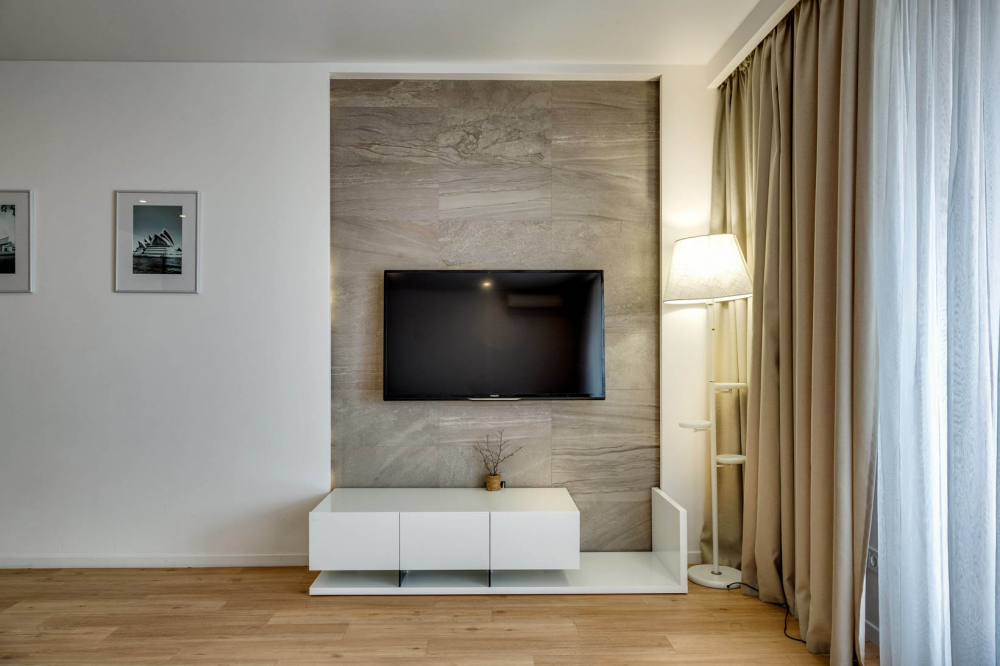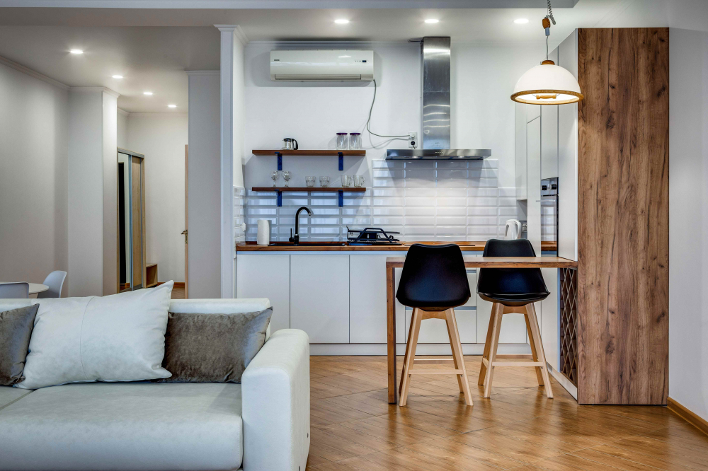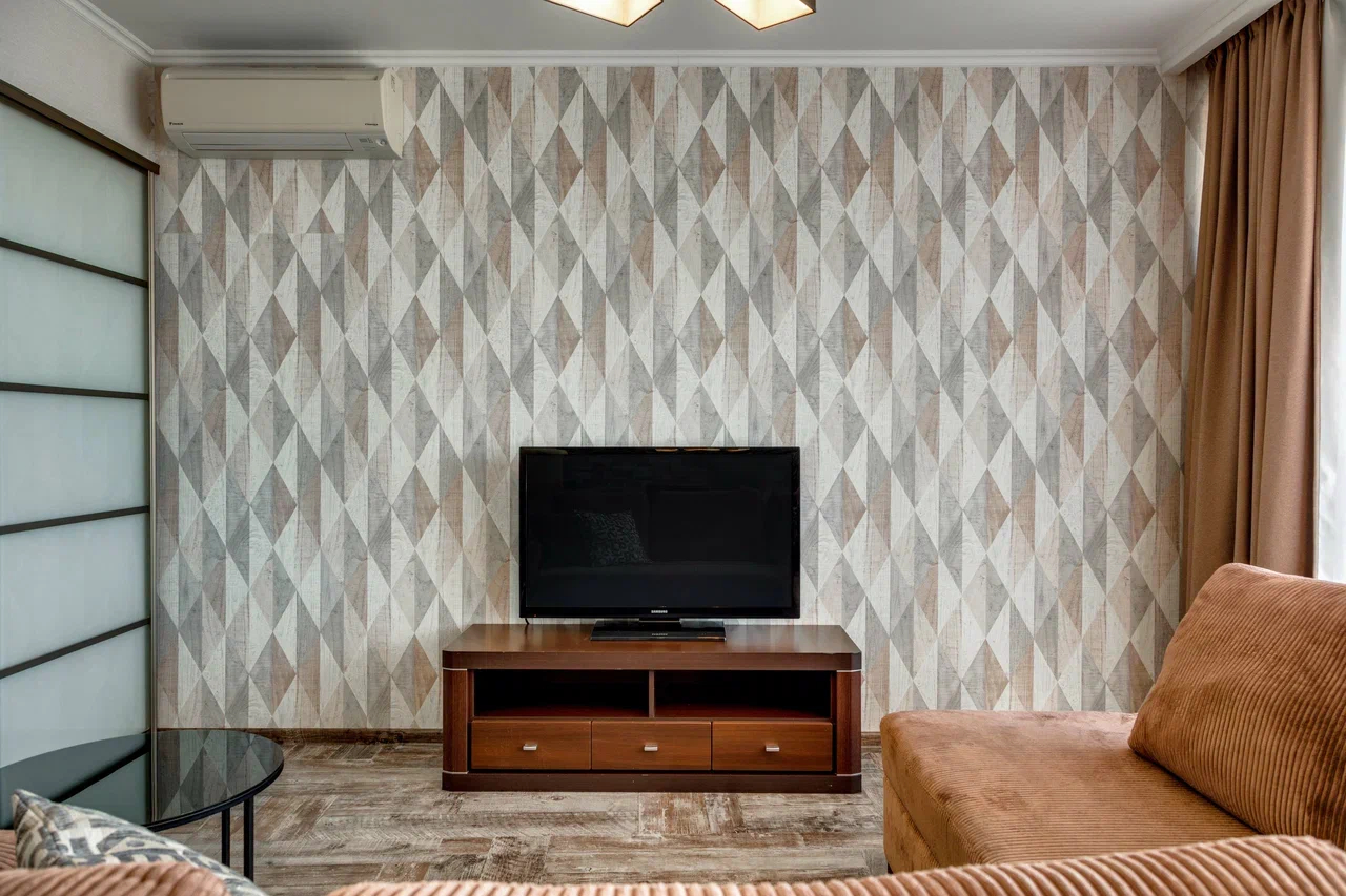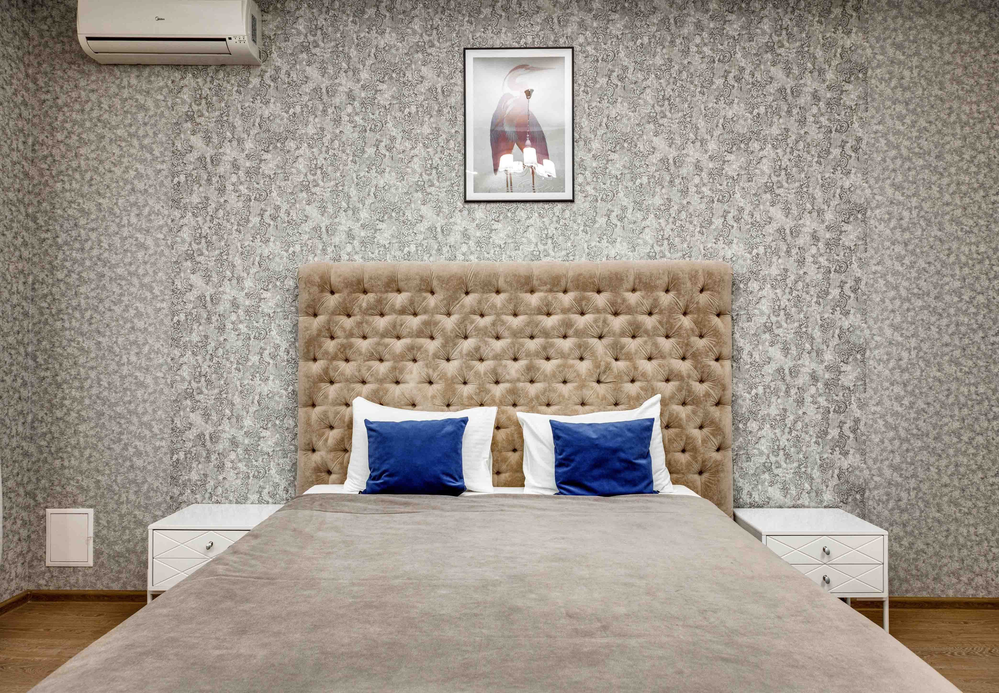 В номере: вешалка, диван, зеркало, кровать двуспальная, кухонная мебель, прикроватные тумбочки, стол, стулья, шкаф, кондиционер, микроволновая печь, стиральная машина, телевизор, холодильник, электрочайник