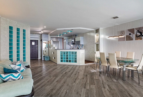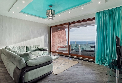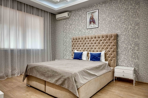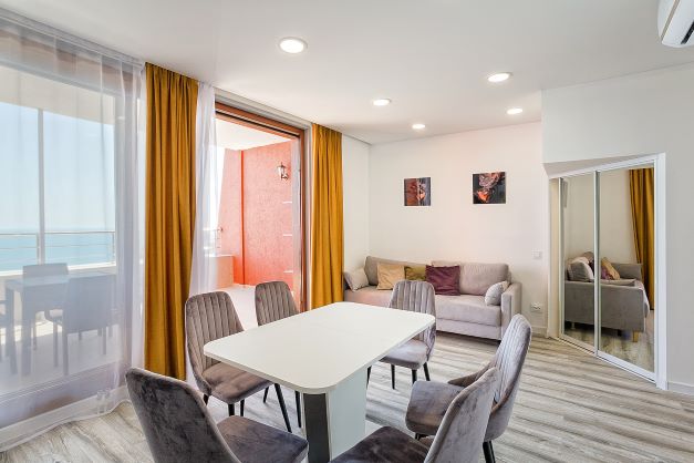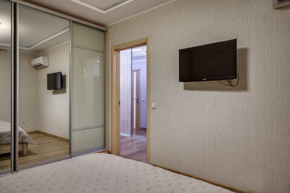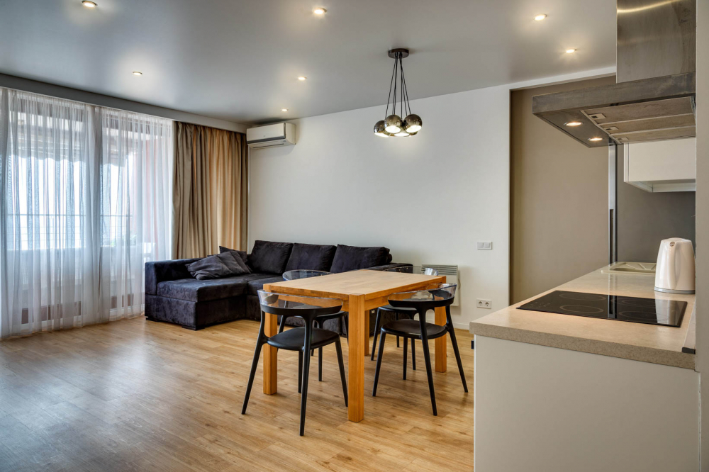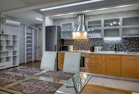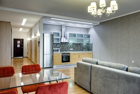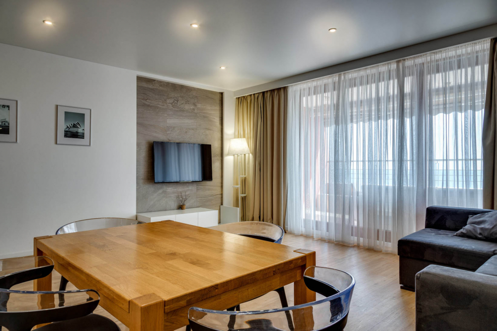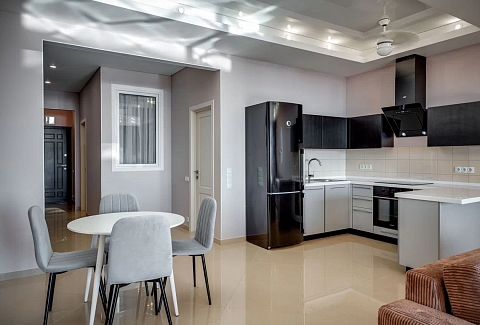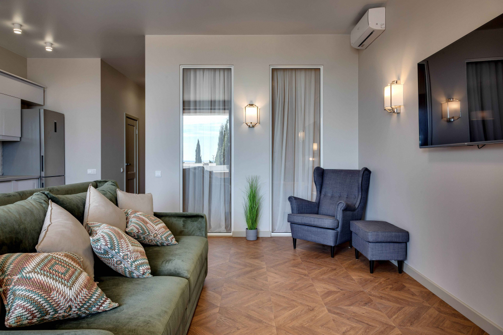 В номере: вешалка, диван, диван раскладной, зеркало, кровать двуспальная, кровать полутороспальная, кухонная мебель, прикроватные тумбочки, стол, стулья, шкаф, кондиционер, микроволновая печь, посудомоечная машина, стиральная машина, телевизор, холодильник, электрочайник