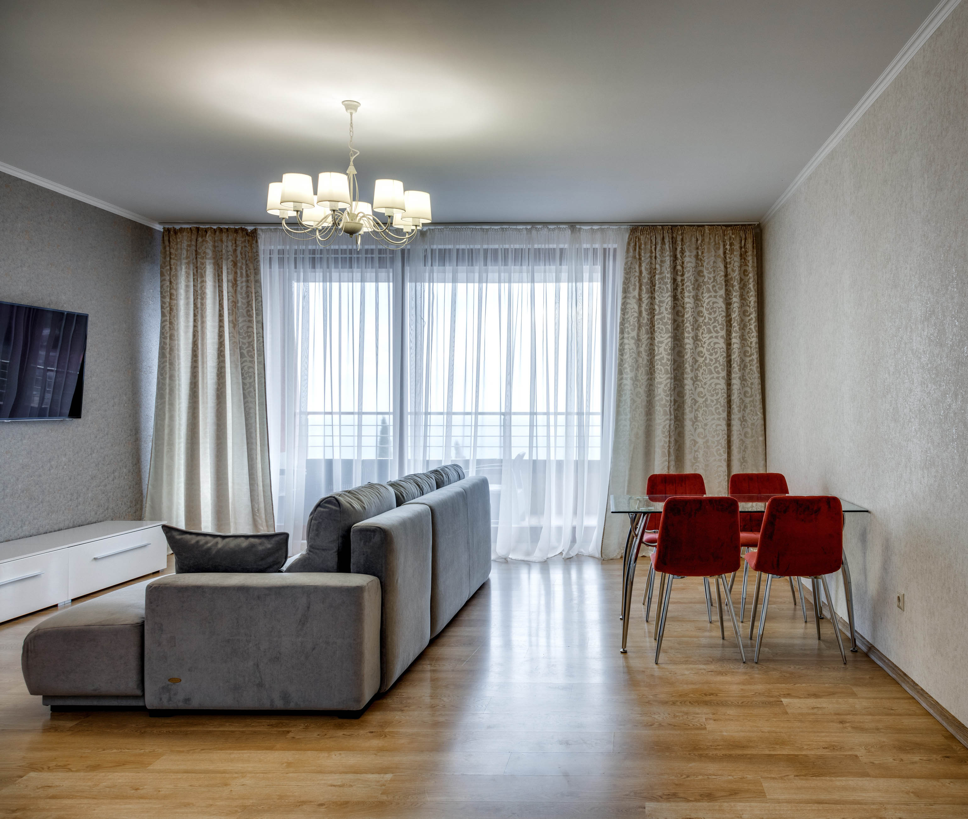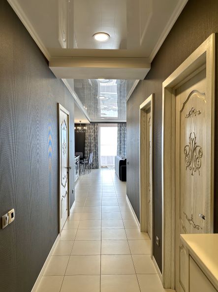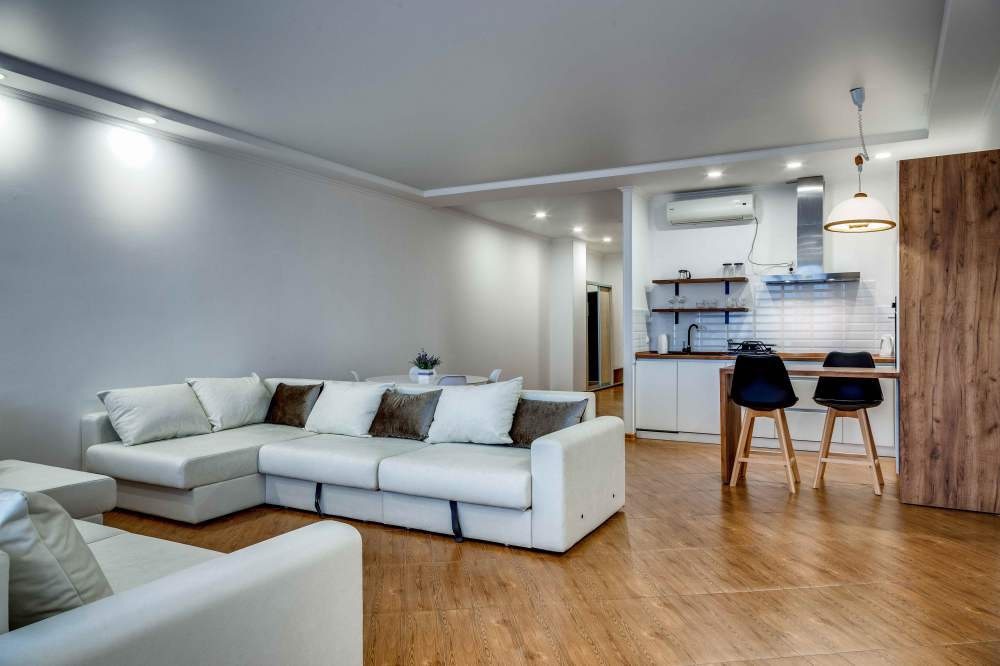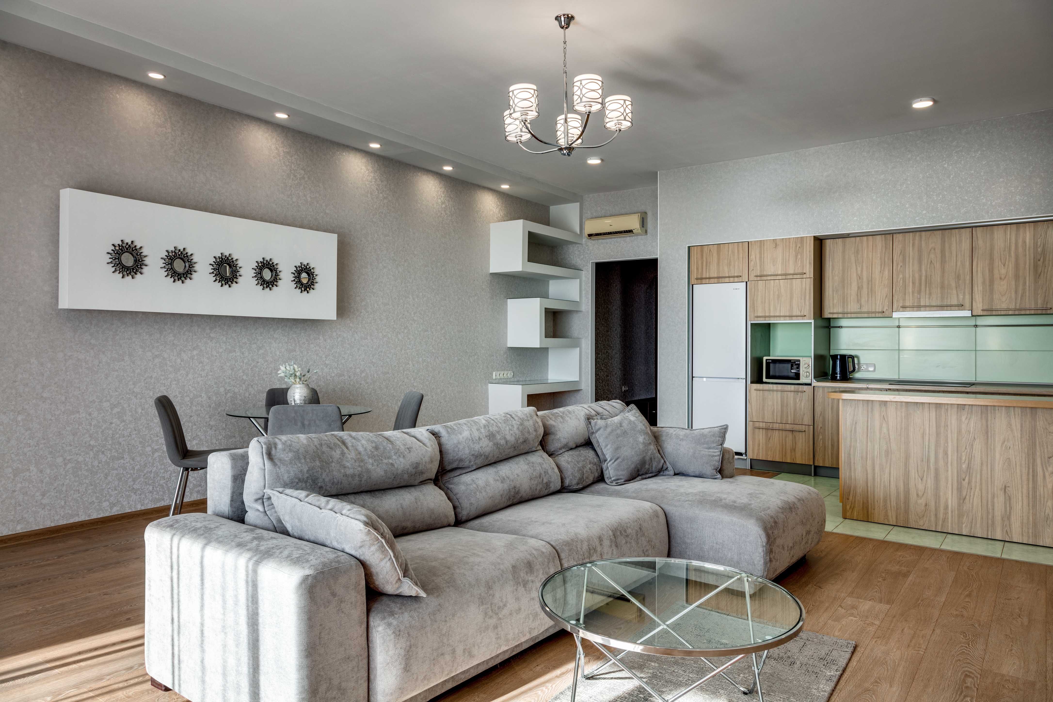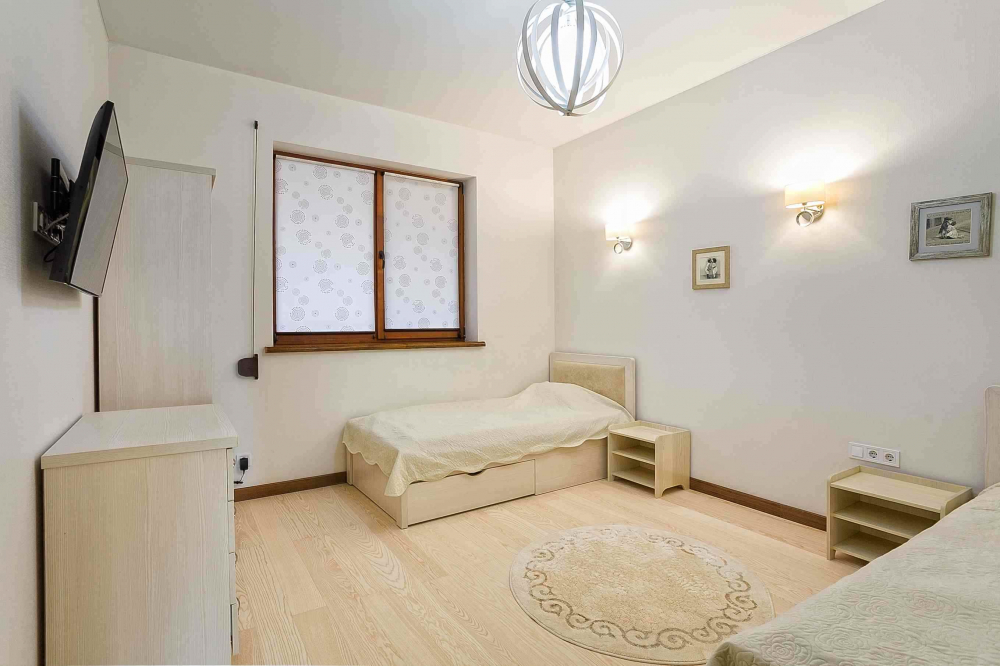 В номере: вешалка, диван, диван раскладной, зеркало, кровать двуспальная, кровать полутороспальная, кухонная мебель, прикроватные тумбочки, стол, стулья, шкаф, кондиционер, микроволновая печь, посудомоечная машина, стиральная машина, телевизор, холодильник, электрочайник