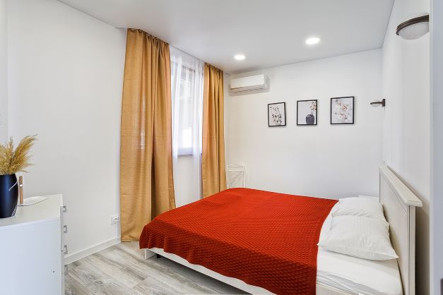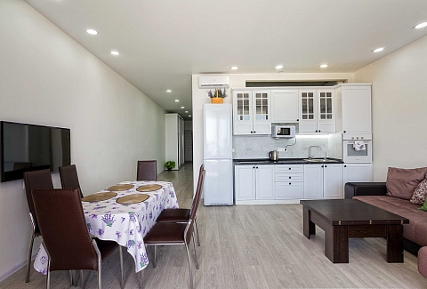 В номере: вешалка, диван раскладной, кровать двуспальная, кухонная мебель, прикроватные тумбочки, стол, стулья, шкаф, кондиционер, микроволновая печь, плита электрическая, стиральная машина, телевизор, холодильник, электрочайник