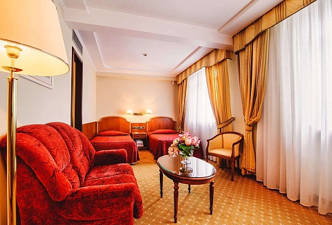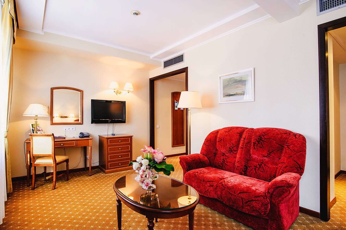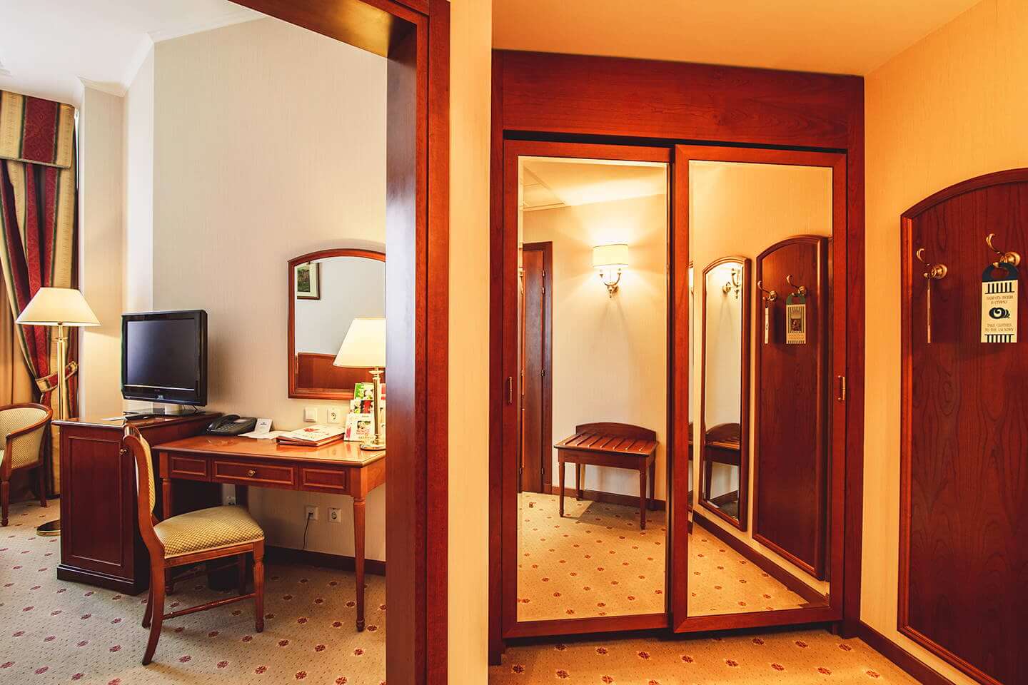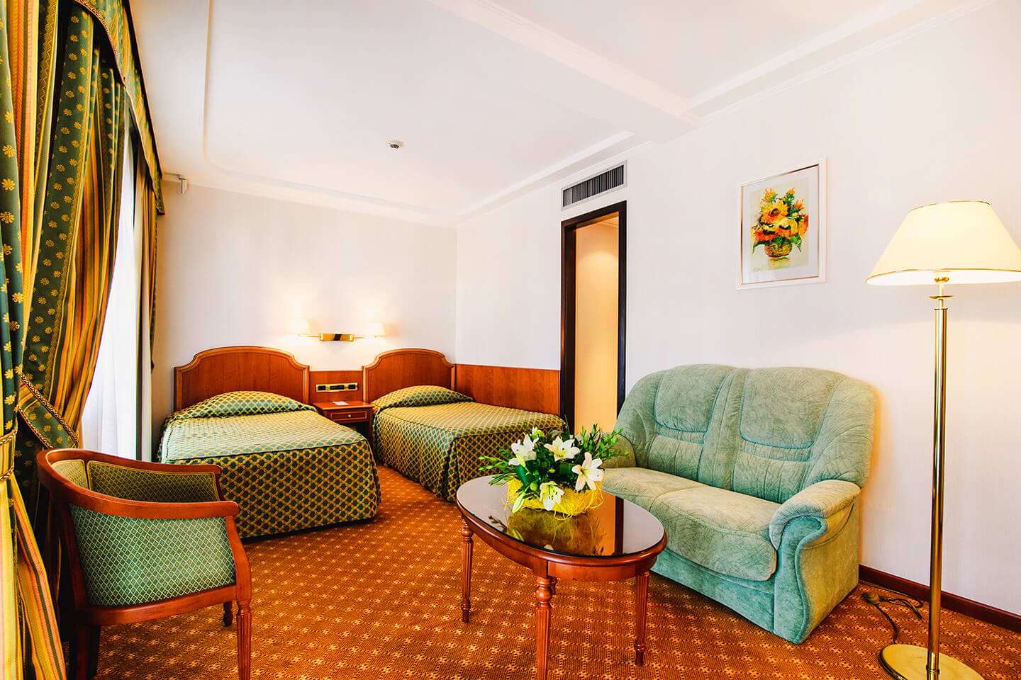 В номере: вешалка, диван раскладной, зеркало, кровати односпальные /одна двуспальная кровать, прикроватные тумбочки, стол, столик журнальный, стулья, шкаф, сейф, система общего кондиционирования, телевизор ЖК, телефон, холодильник, чайная станция, чайный набор посуды, электрочайник