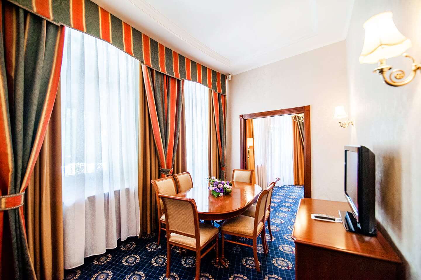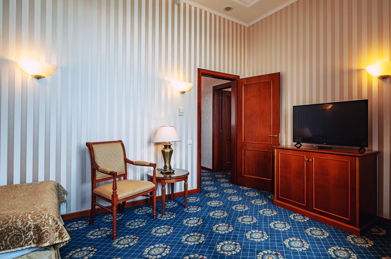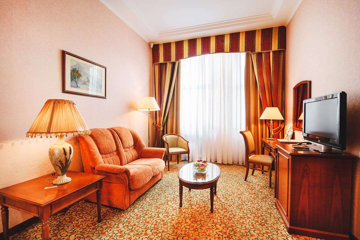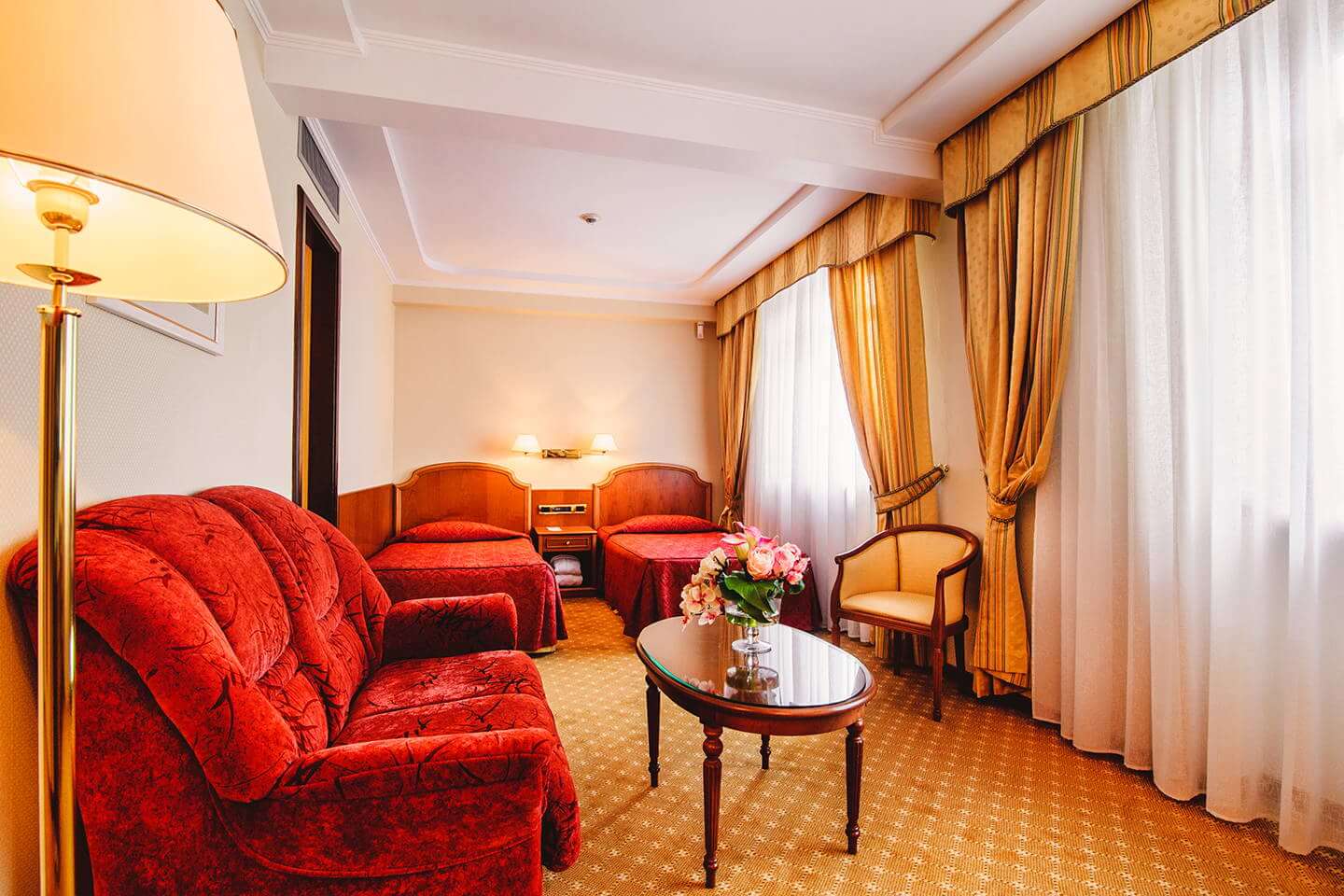 В номере: вешалка, диван раскладной, зеркало, кровати односпальные /одна двуспальная кровать, прикроватные тумбочки, стол, столик журнальный, стулья, шкаф, сейф, система общего кондиционирования, телевизор ЖК, телефон, холодильник, чайная станция, чайный набор посуды, электрочайник