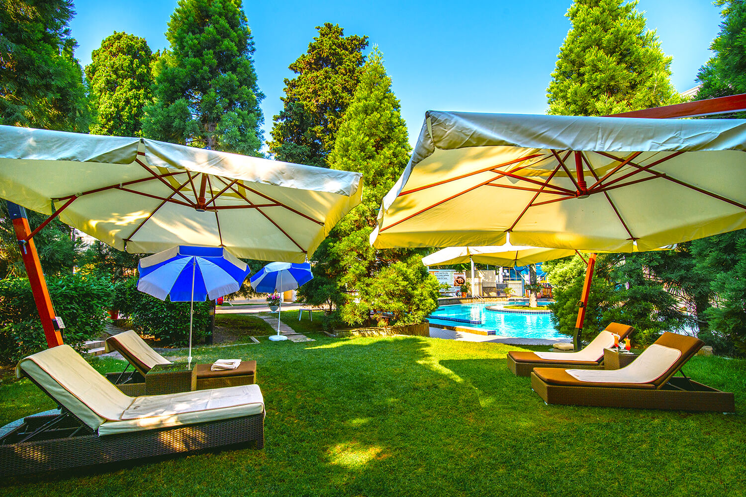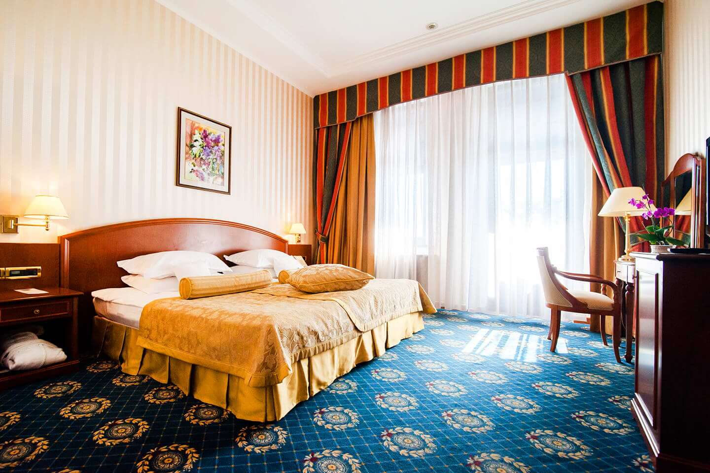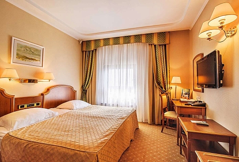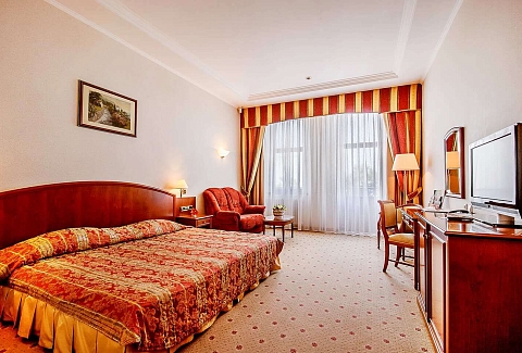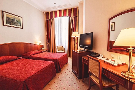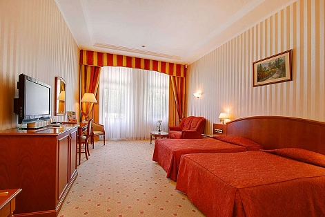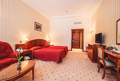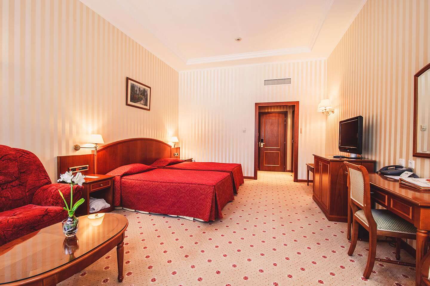 В номере: вешалка, зеркало, кровати односпальные /одна двуспальная кровать, прикроватные тумбочки, стол, столик журнальный, стулья, шкаф, мини-холодильник, система общего кондиционирования, телевизор ЖК, телефон, чайная станция, чайный набор посуды, электрочайник