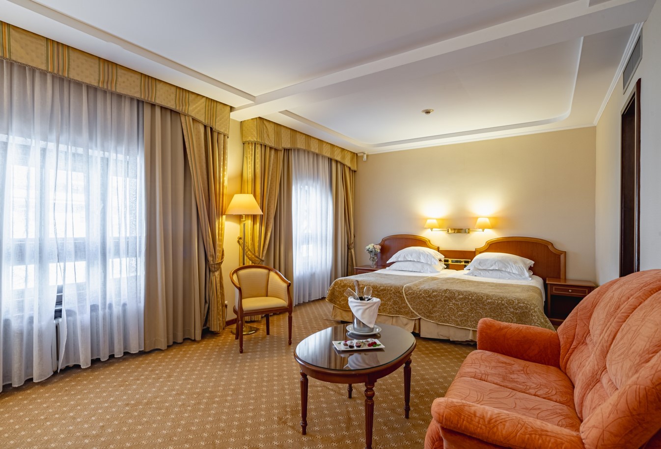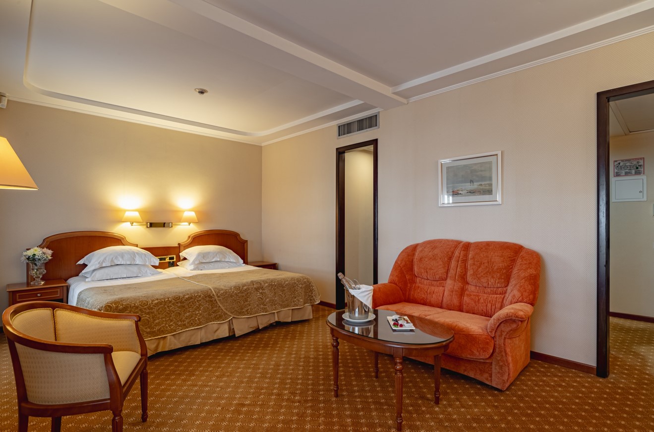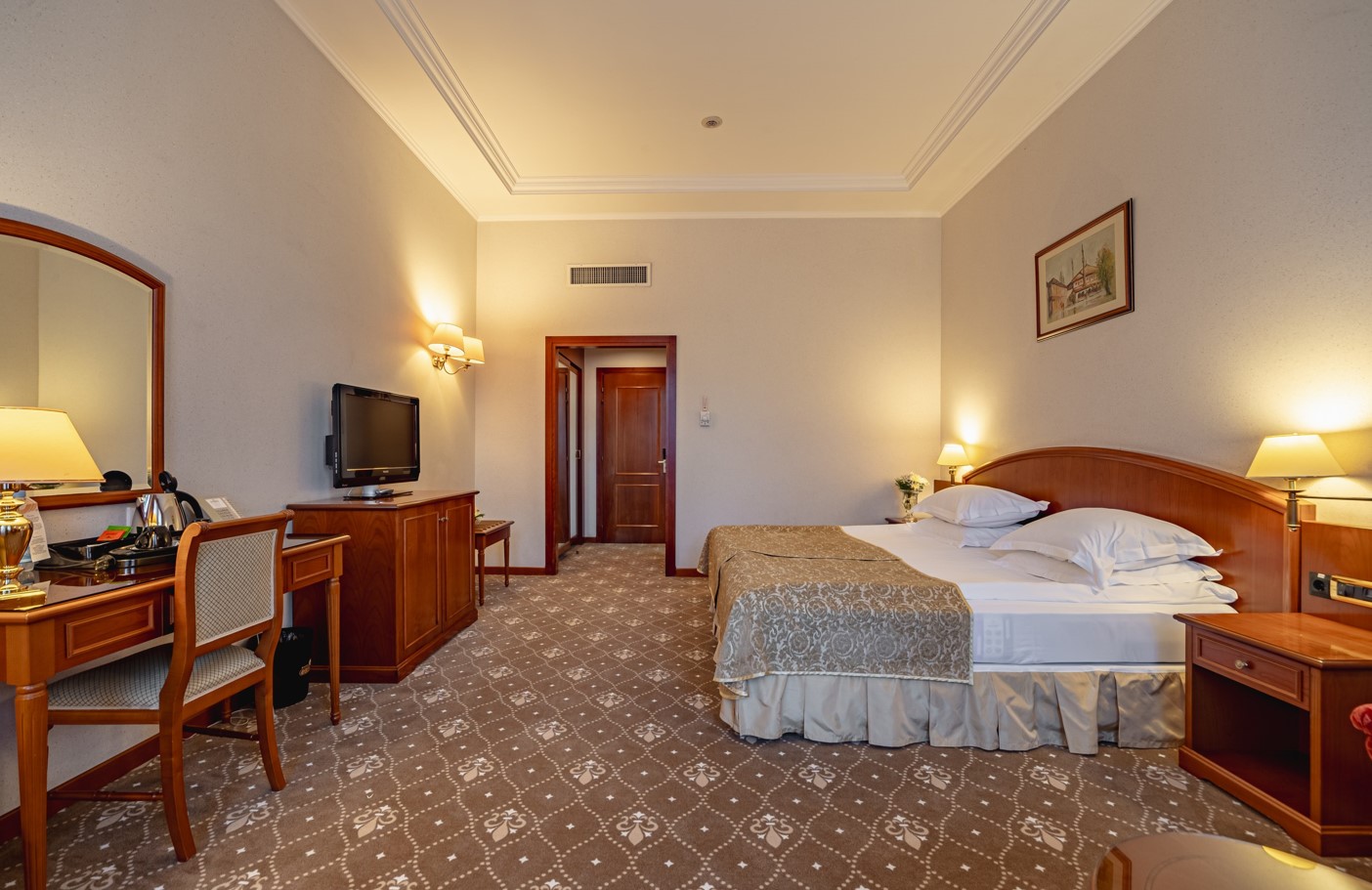 В номере: диван раскладной, зеркало, кровать двуспальная, прикроватные тумбочки, стол, столик журнальный, стулья, мини-холодильник, сейф, система общего кондиционирования, телевизор ЖК, телефон, чайная станция, чайный набор посуды, электрочайник