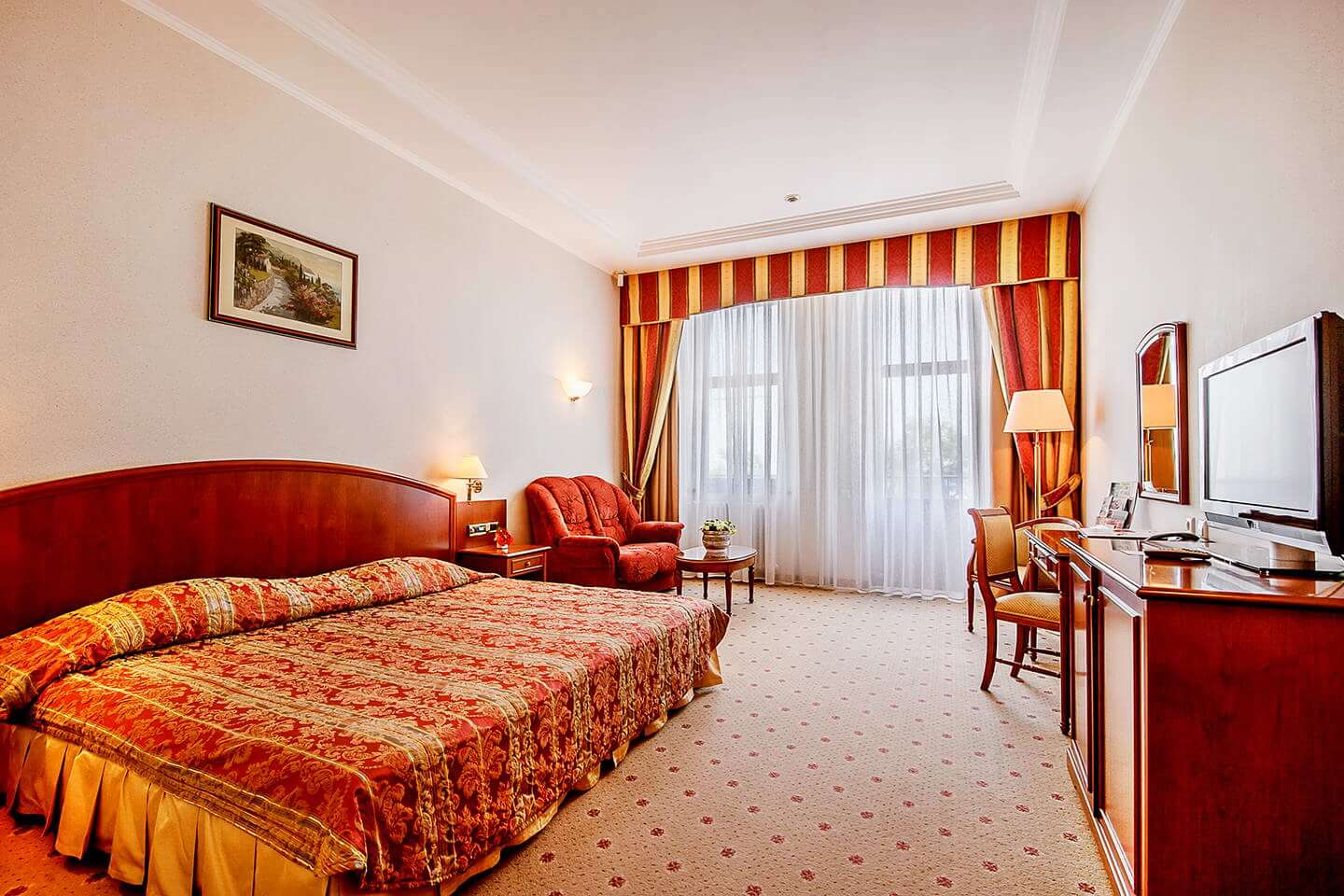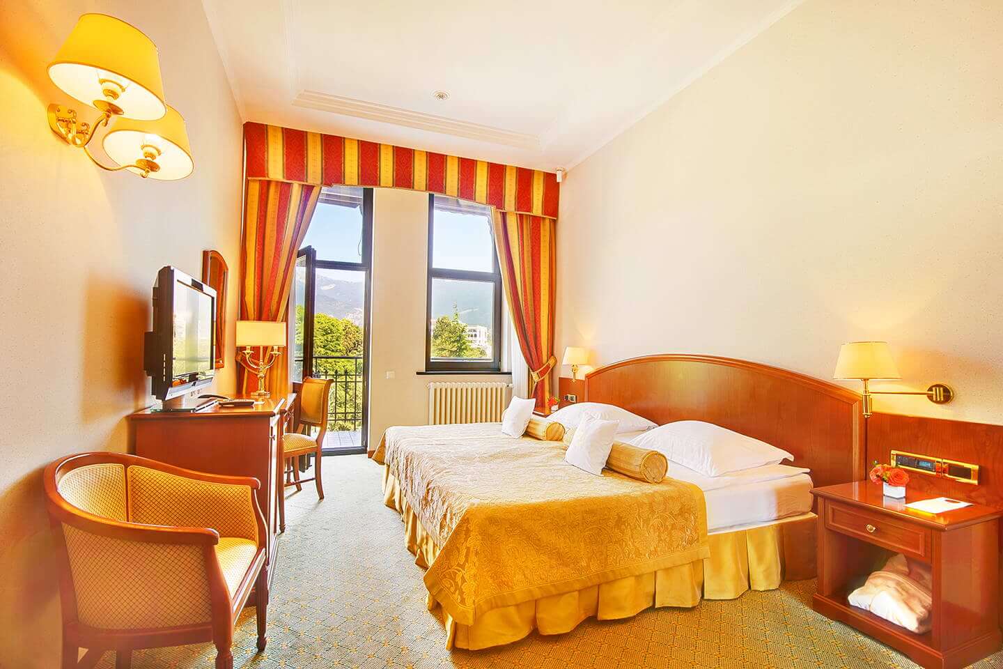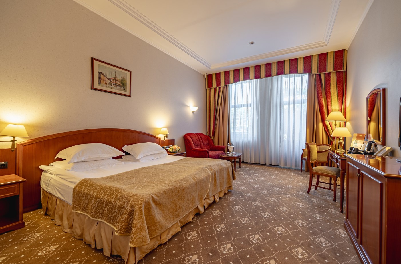 В номере: диван раскладной, зеркало, кровать двуспальная, прикроватные тумбочки, стол, столик журнальный, стулья, мини-холодильник, сейф, система общего кондиционирования, телевизор ЖК, телефон, чайная станция, чайный набор посуды, электрочайник