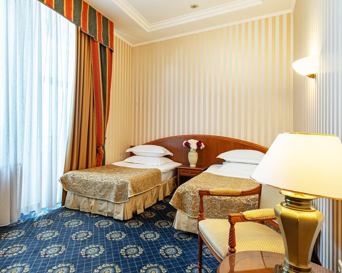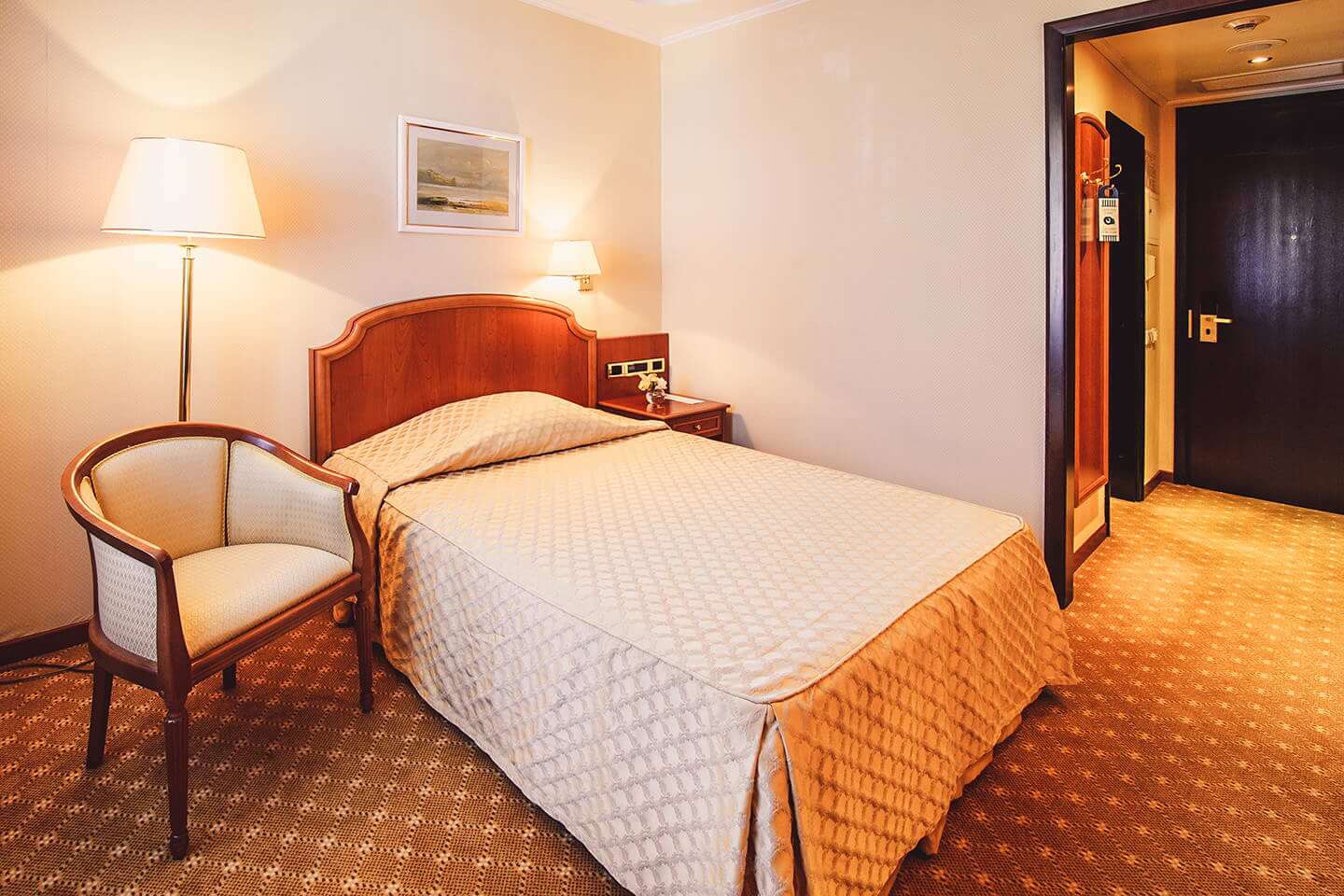 В номере: вешалка, зеркало, кровать полутороспальная, прикроватная тумбочка, стол, стулья, шкаф, мини-холодильник, сейф, система общего кондиционирования, телевизор ЖК, телефон, чайная станция, чайный набор посуды, электрочайник