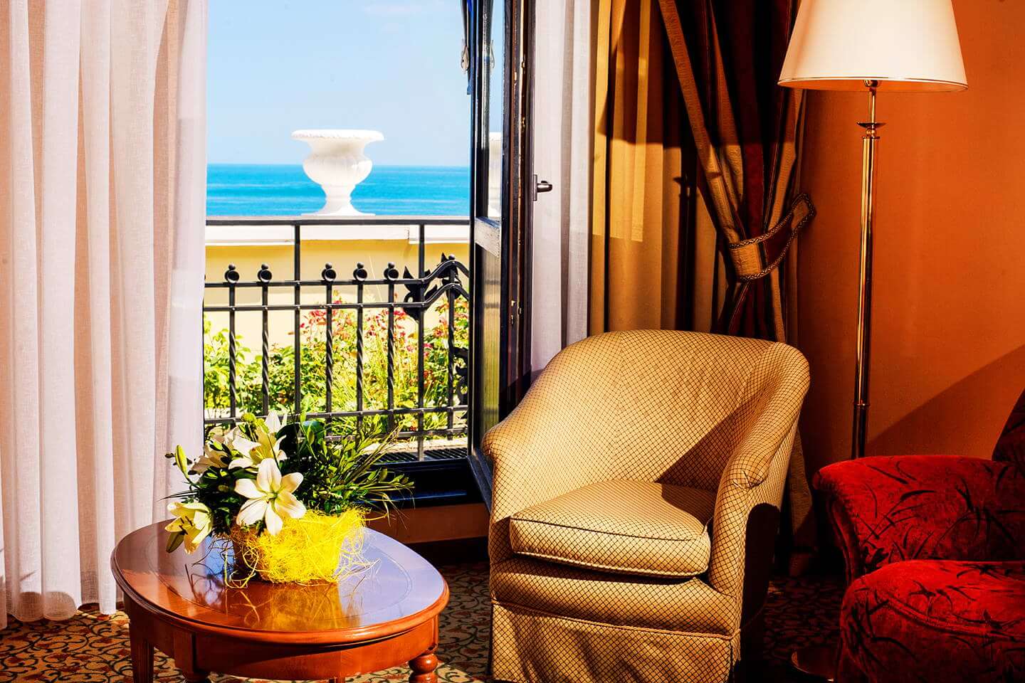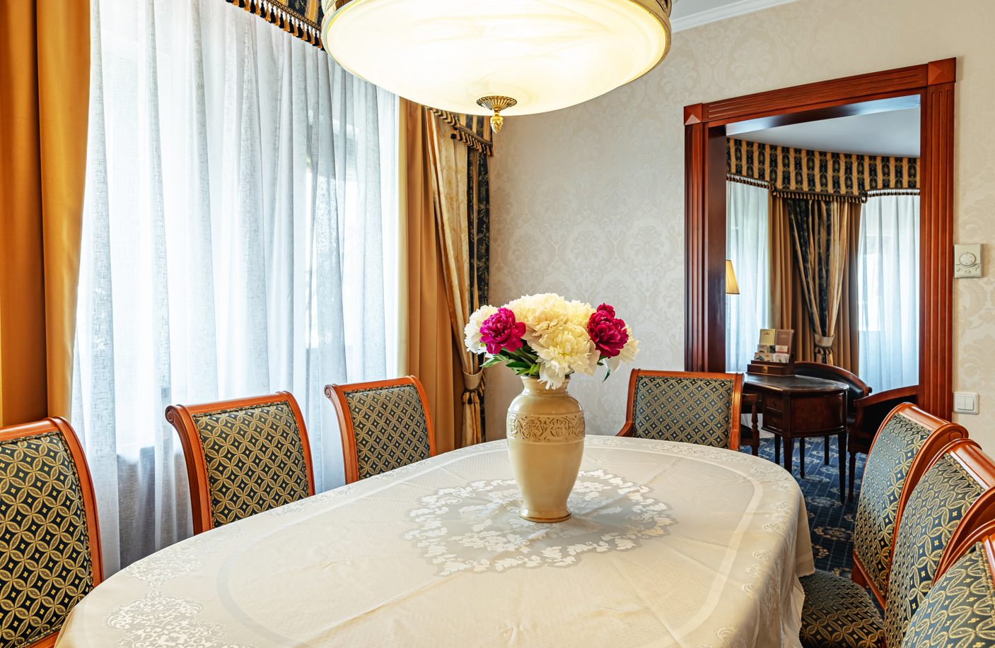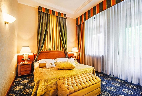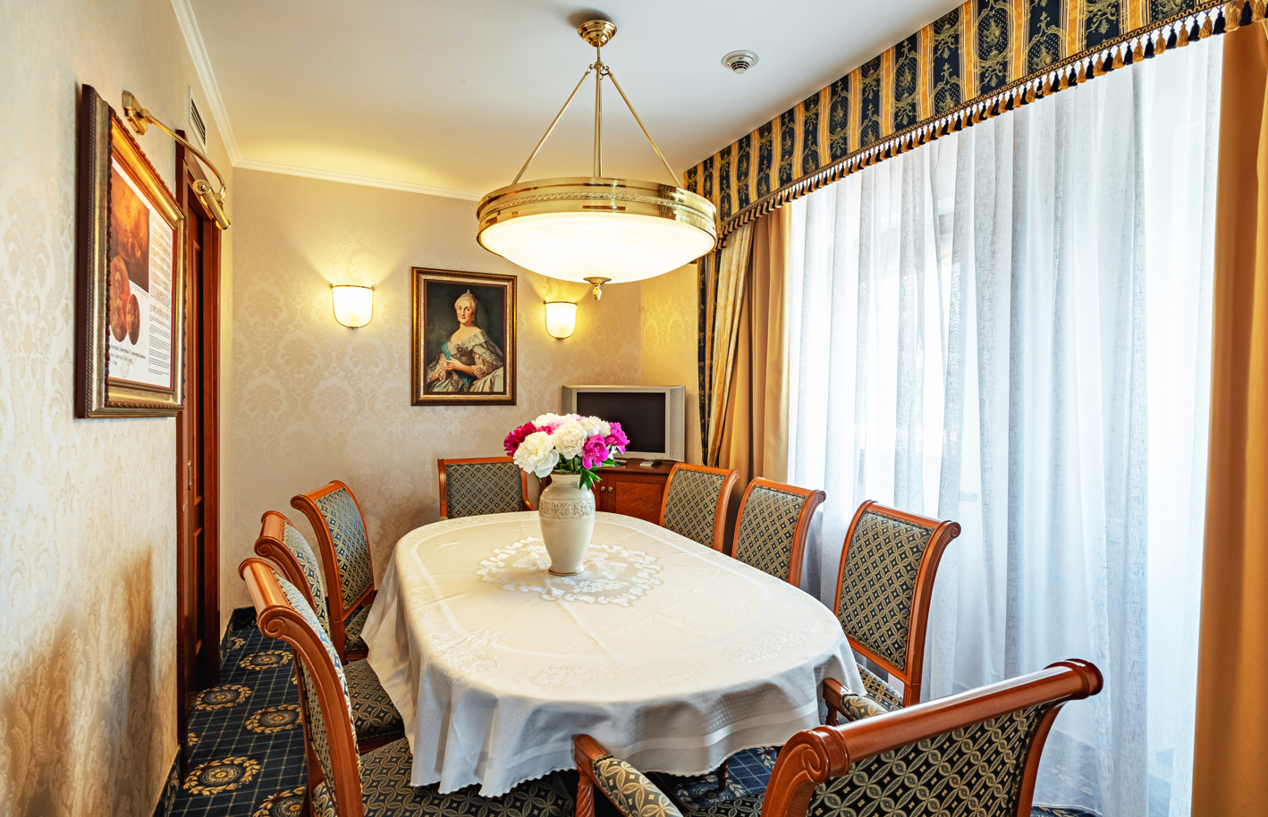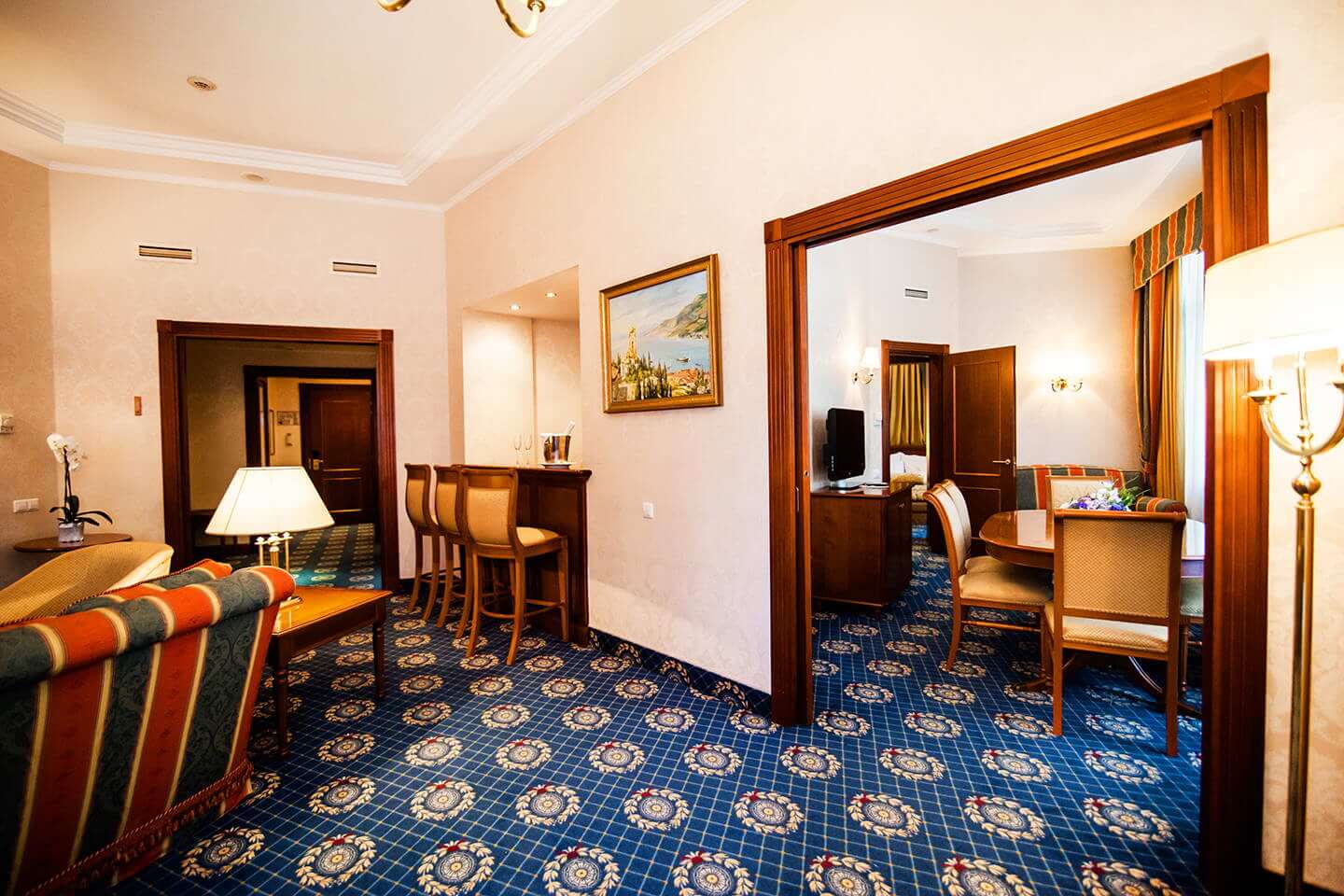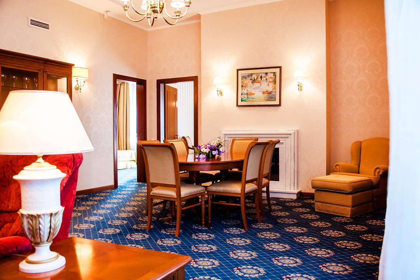 В номере: вешалка, диван раскладной, зеркало, кресла, кровать двуспальная, набор мягкой мебели, прикроватные тумбочки, столик журнальный, стулья, шкаф, камин, кофемашина, мини-холодильник, сейф, система общего кондиционирования, телевизор, телефон, чайная станция, чайный набор посуды, электрочайник