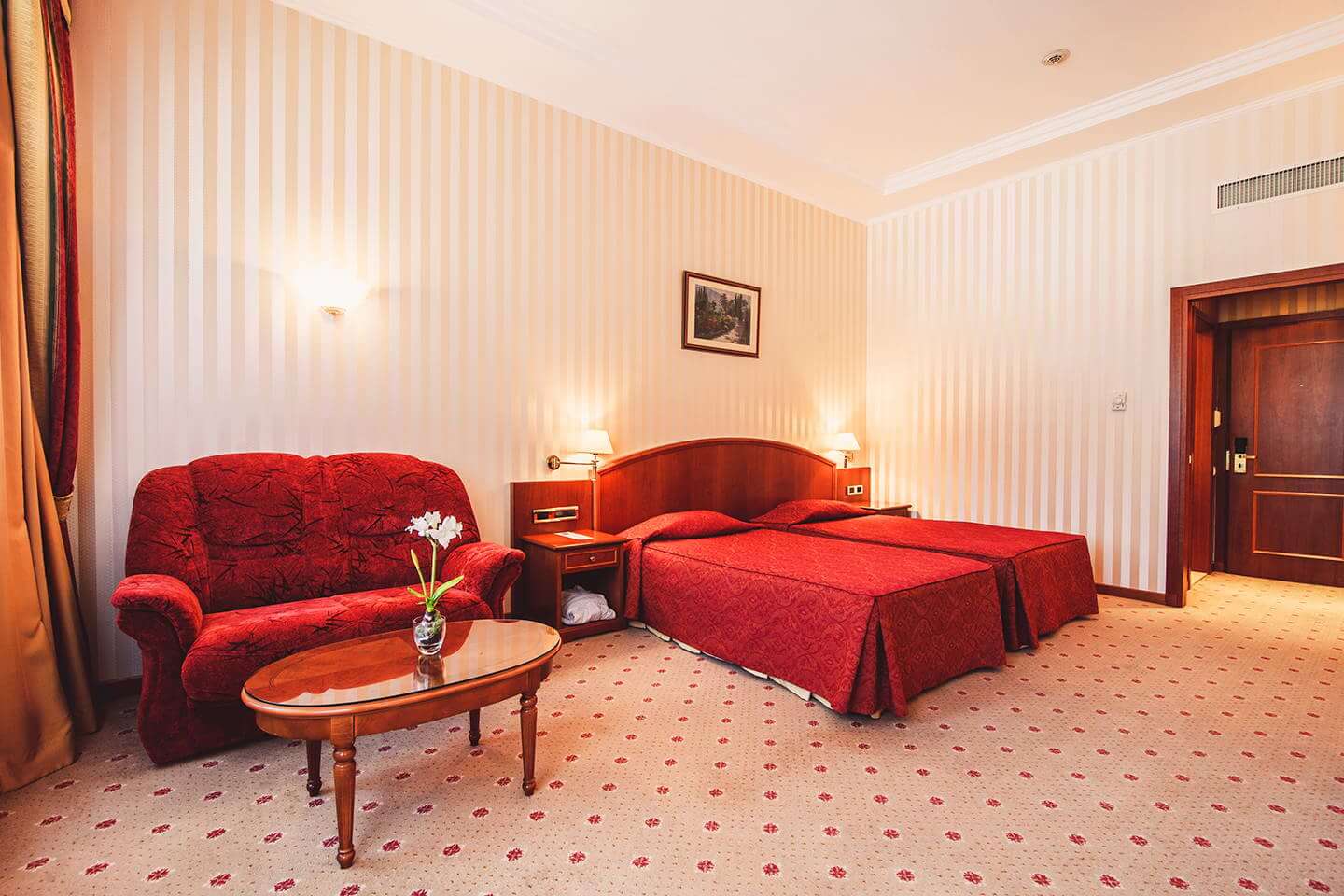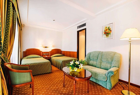 В номере: вешалка, диван раскладной, зеркало, кровати односпальные /одна двуспальная кровать, прикроватные тумбочки, стол, стул, шкаф, кондиционер, сейф, телевизор ЖК, чайная станция, чайный набор посуды, электрочайник
