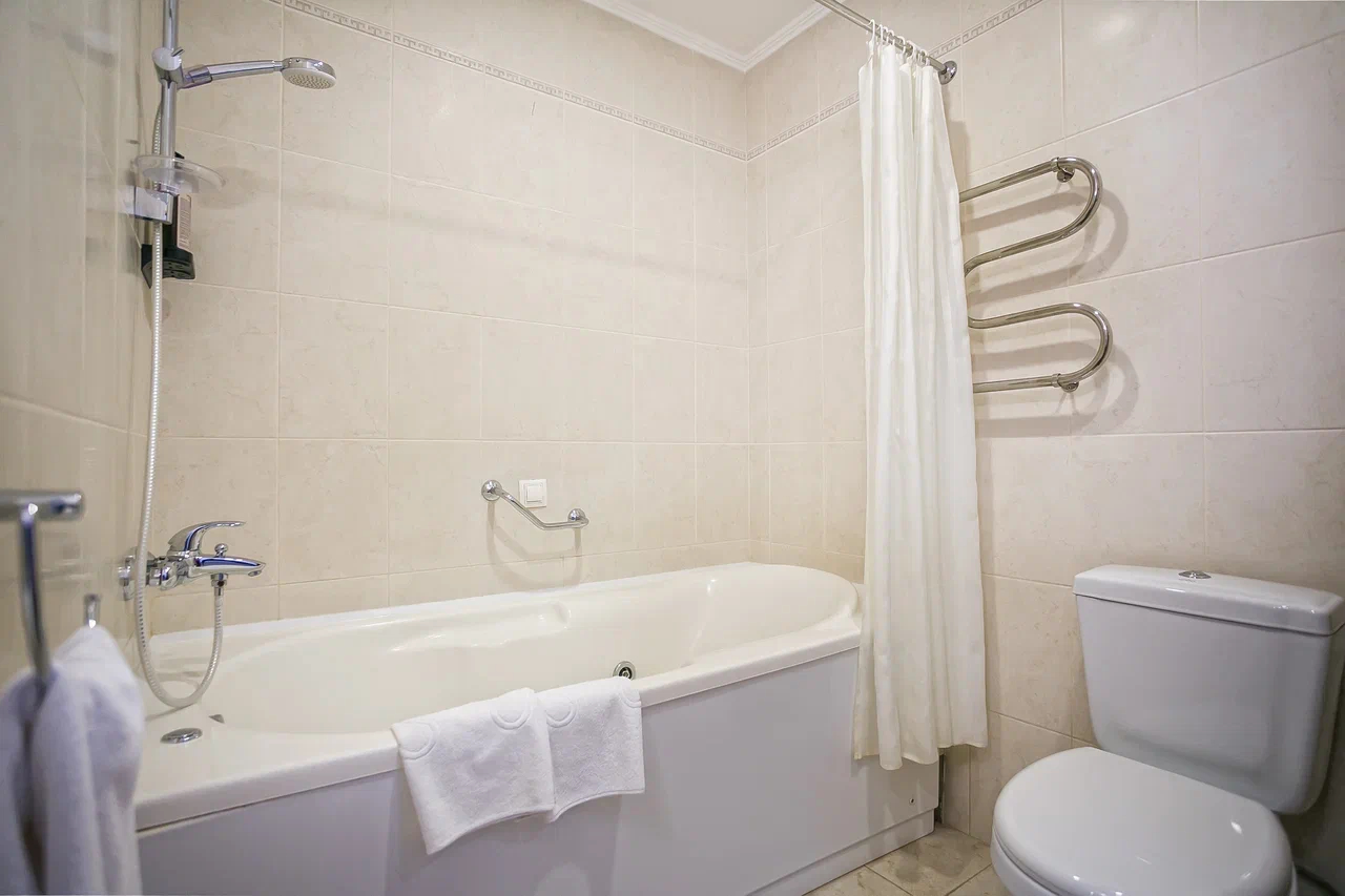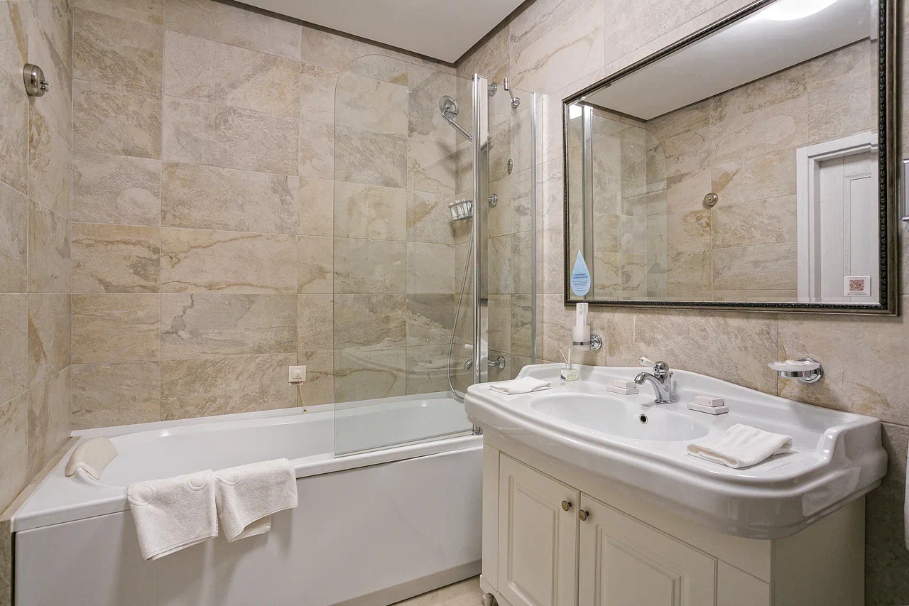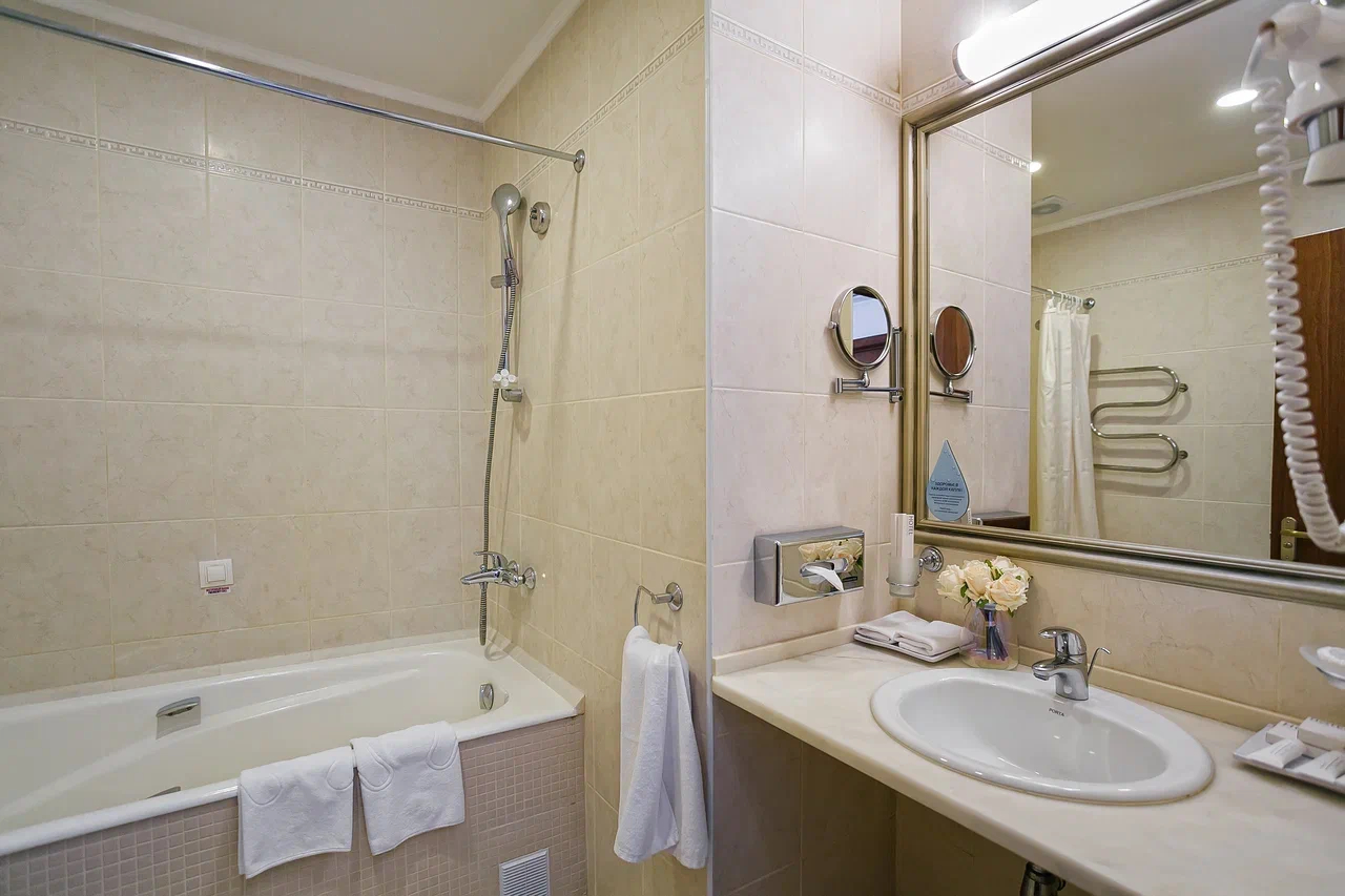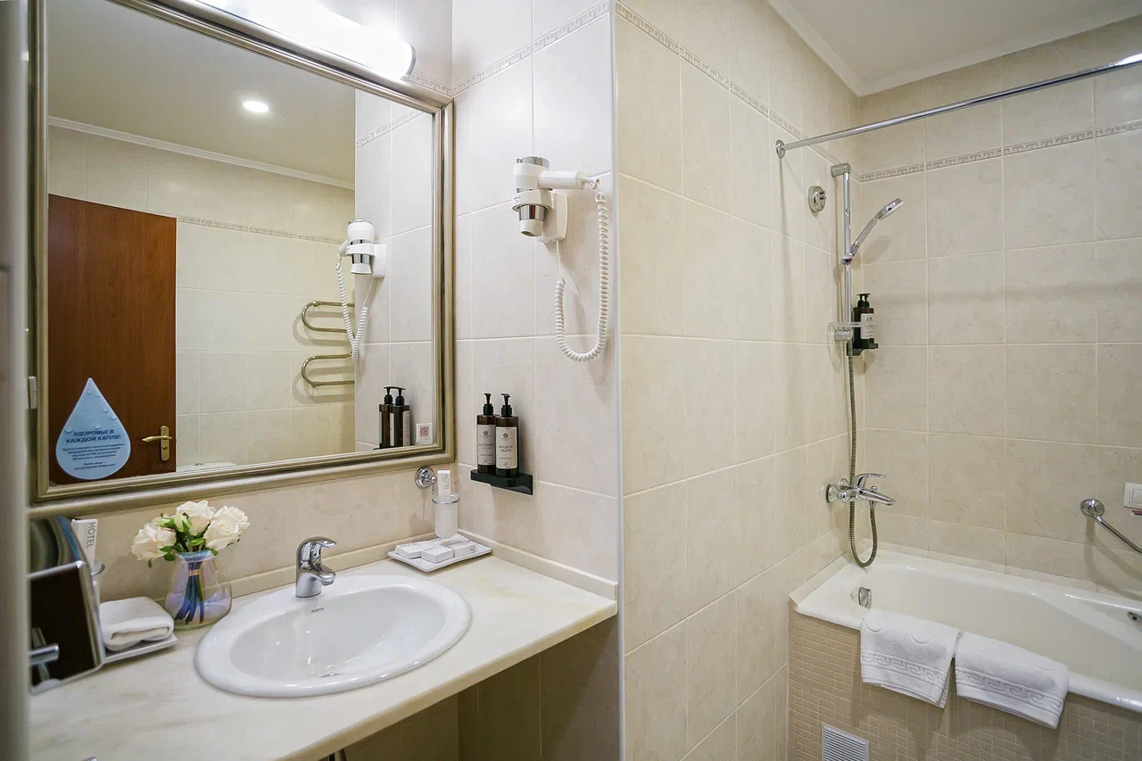 Санузел: с ванной или душевой кабиной, тапочки, туалетные принадлежности, фен, халат