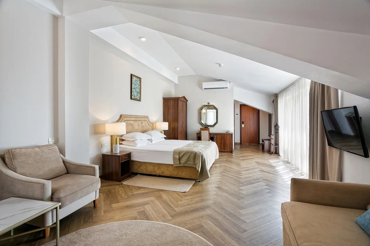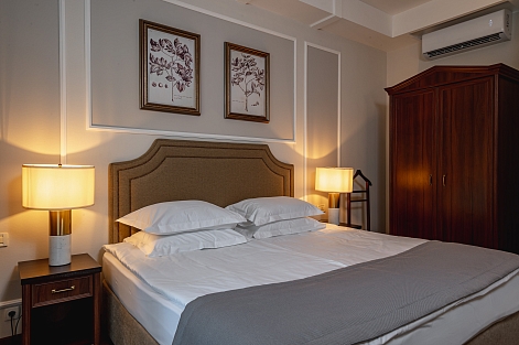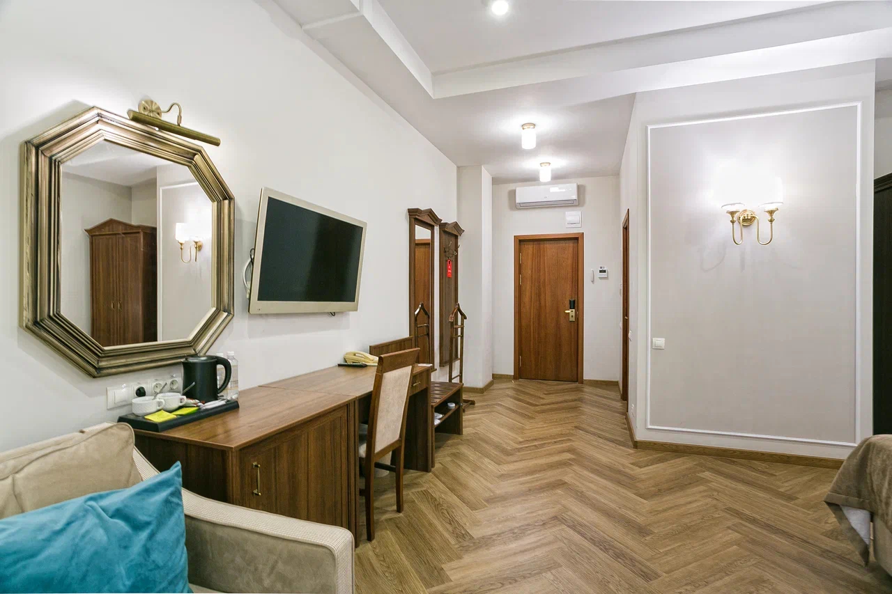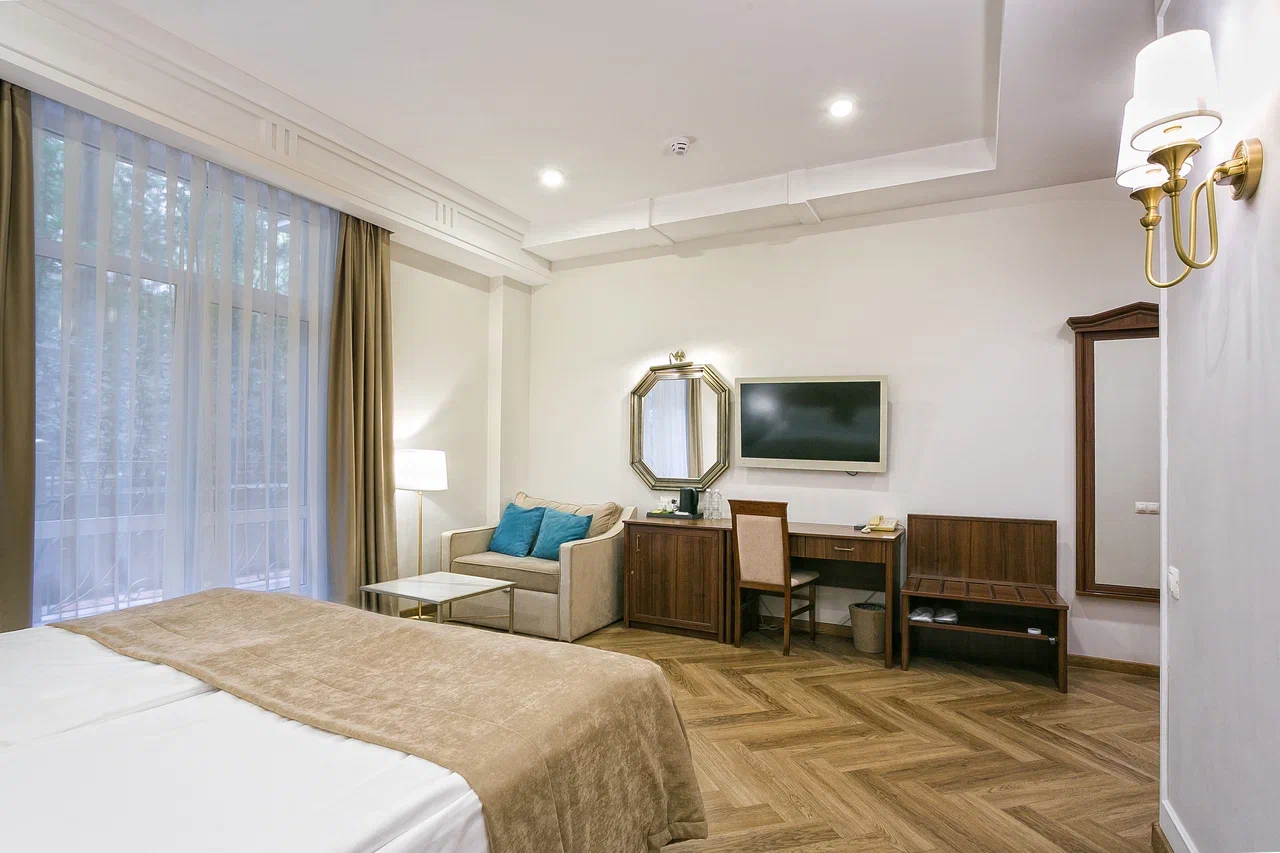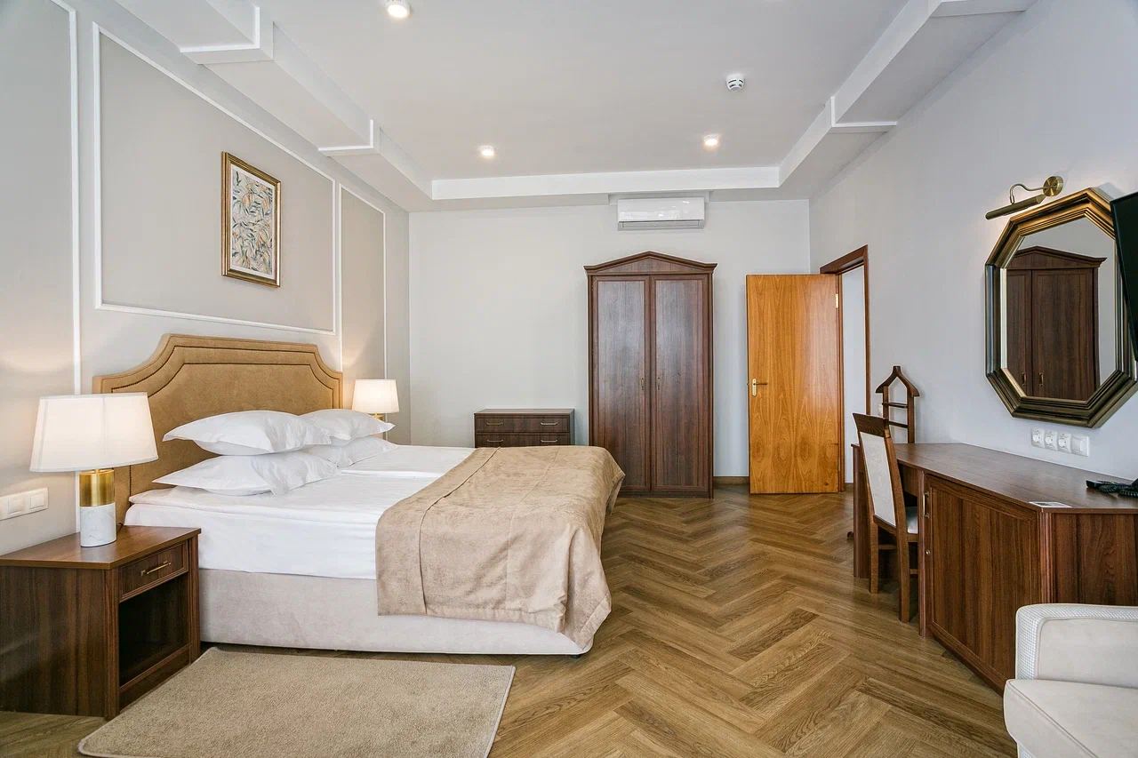 В номере: диван, зеркало, кровать двуспальная, прикроватные тумбочки, стол, стулья, шкаф, кондиционер, мини-холодильник, набор посуды, сейф, телевизор, телефон, чайный набор посуды, электрочайник
