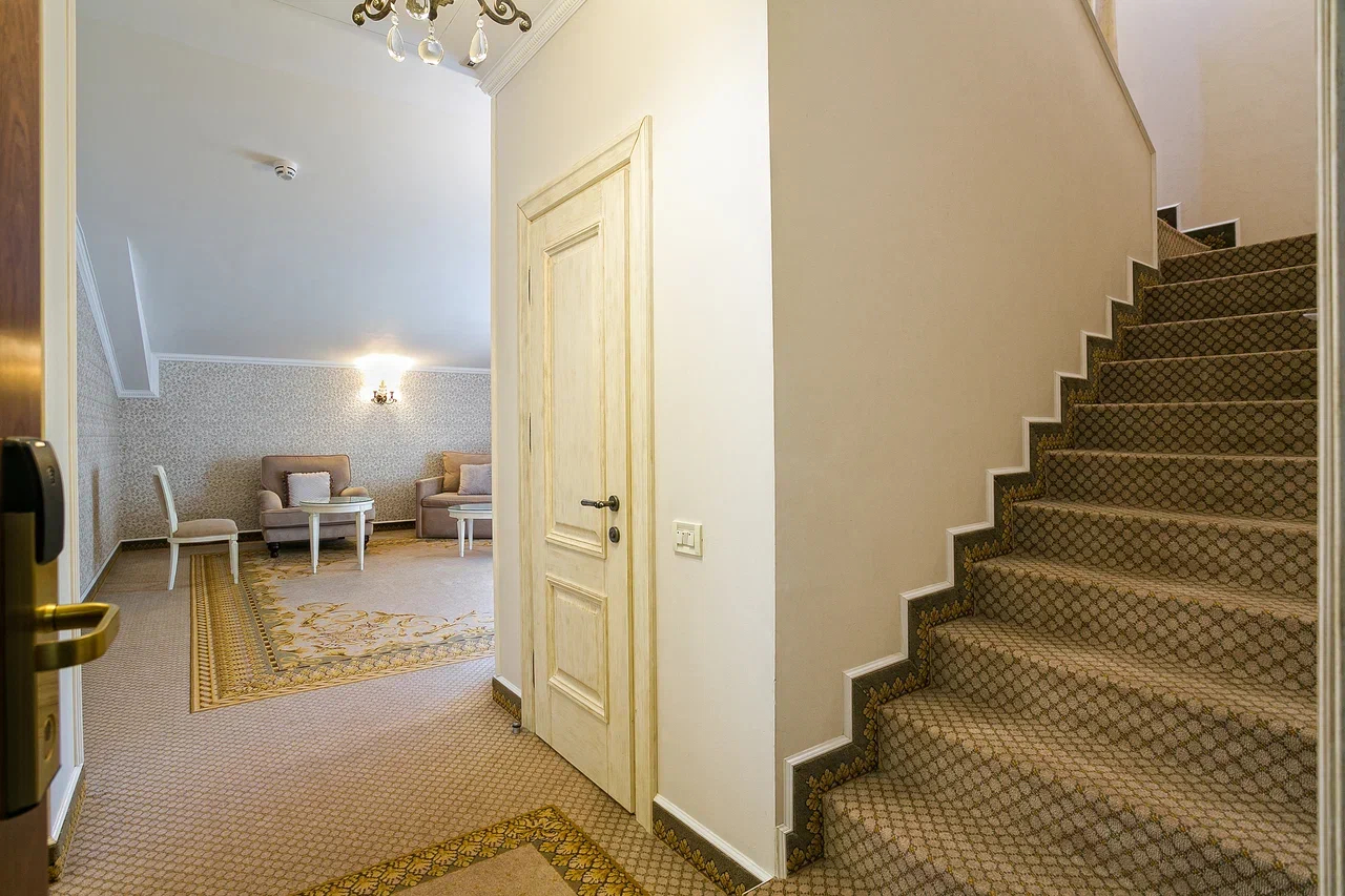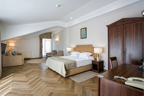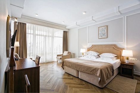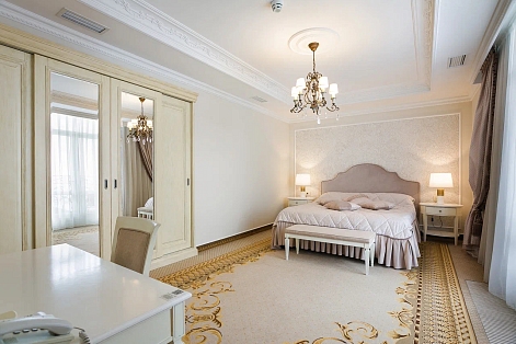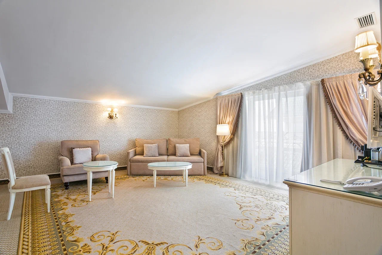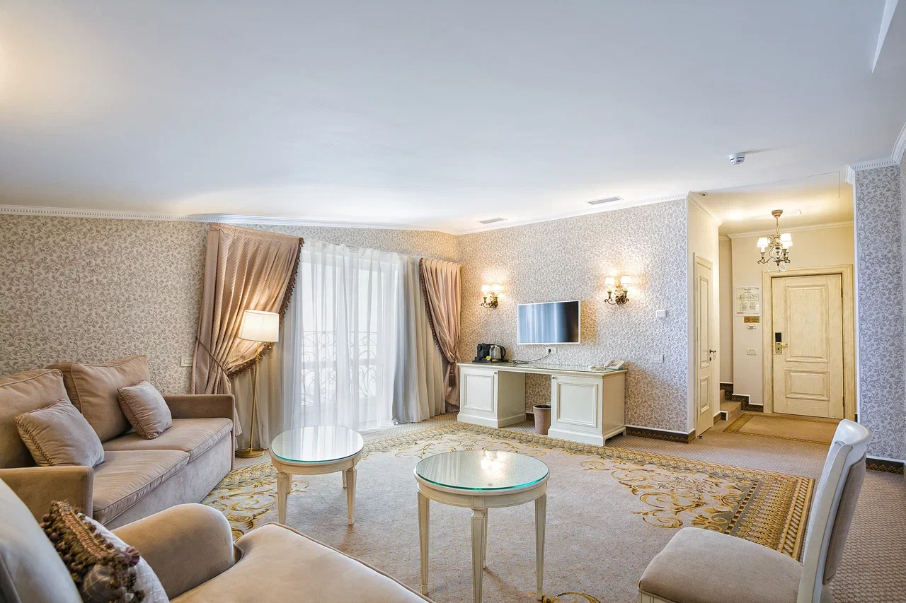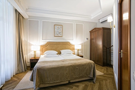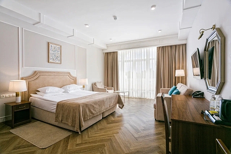 В номере: диван, зеркало, кровать двуспальная, прикроватные тумбочки, стол, стулья, шкаф, кондиционер, мини-холодильник, набор посуды, сейф, телевизор, телефон, чайный набор посуды, электрочайник