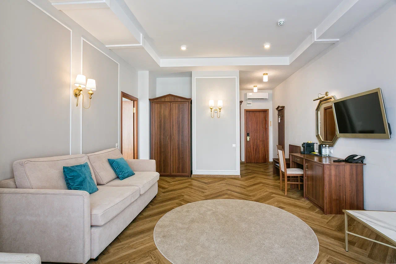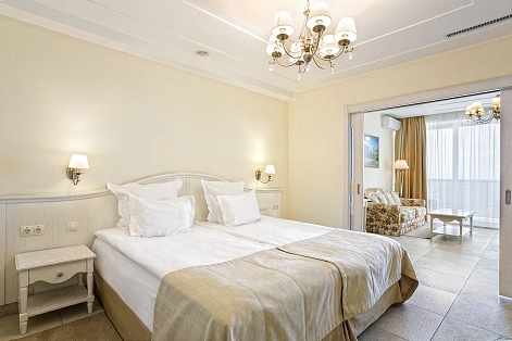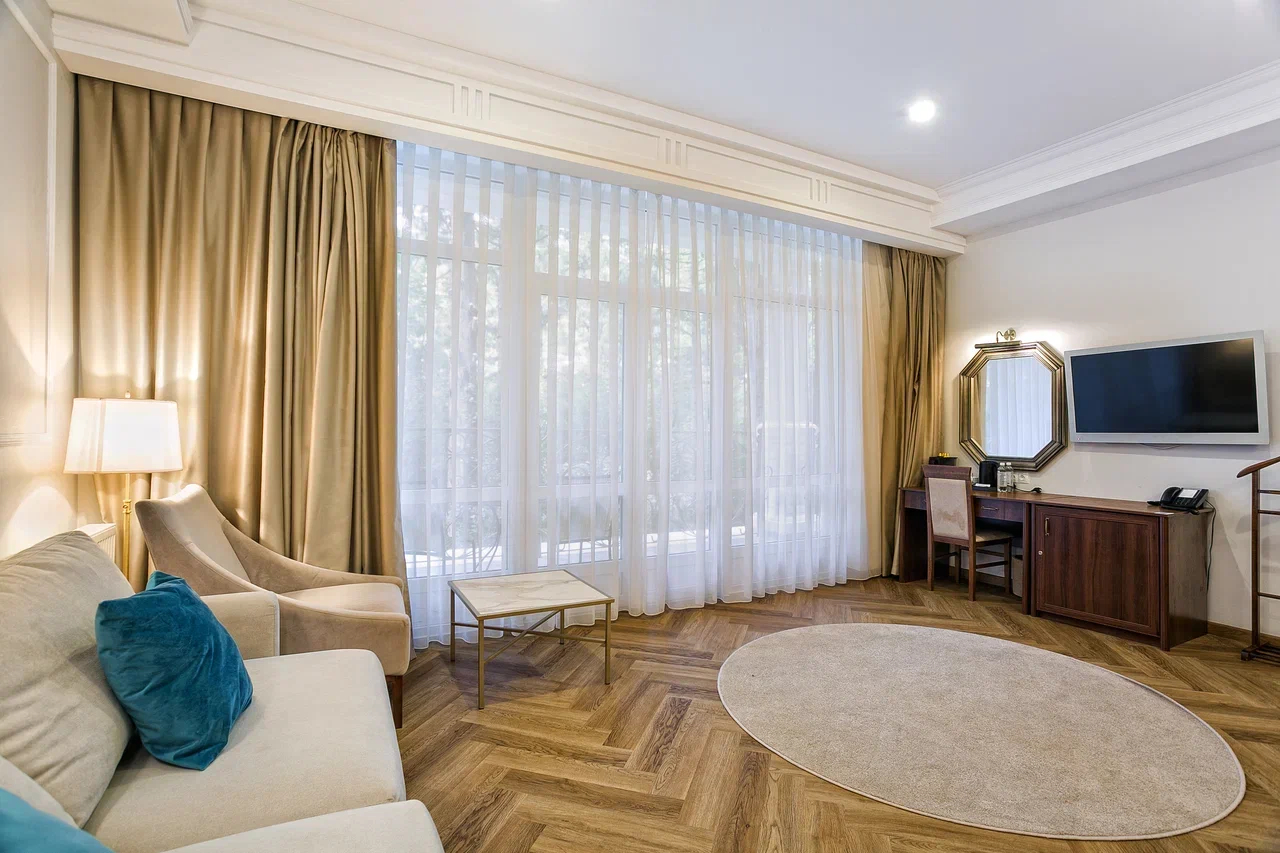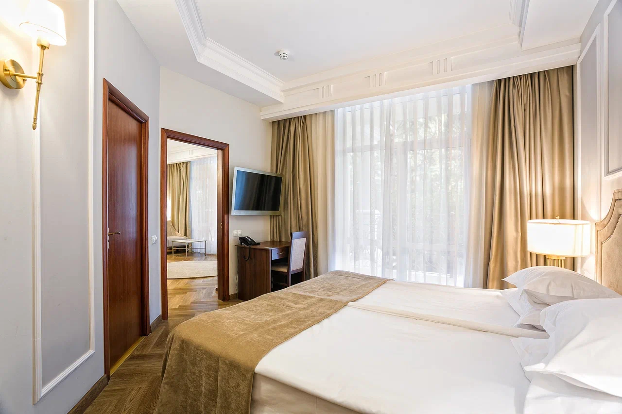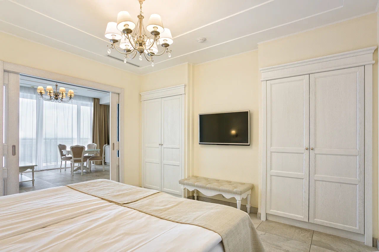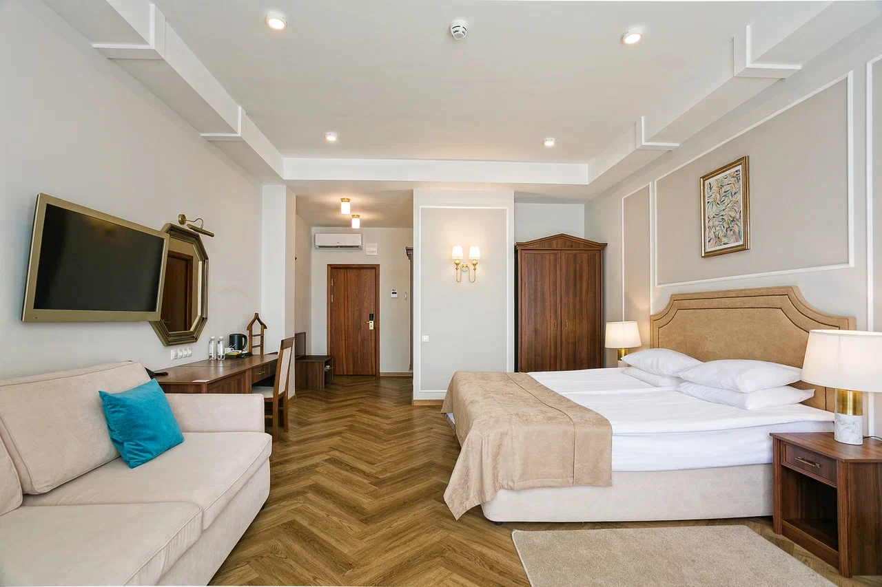 В номере: вешалка, диван раскладной, зеркало, кровать двуспальная, прикроватные тумбочки, стол, стулья, шкаф, кондиционер, мини-холодильник, сейф, сушилка для белья, телевизор ЖК, телефон, чайный набор посуды, электрочайник