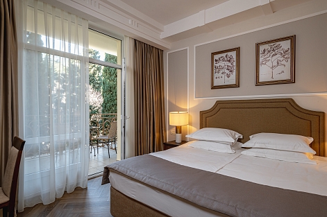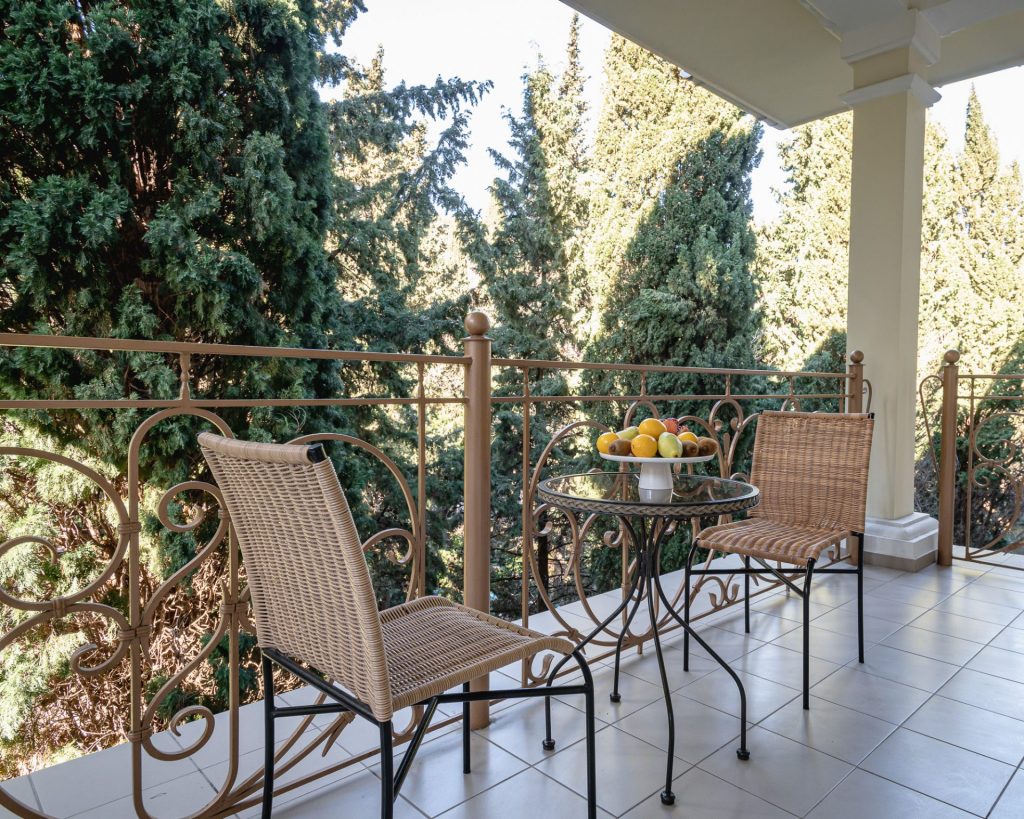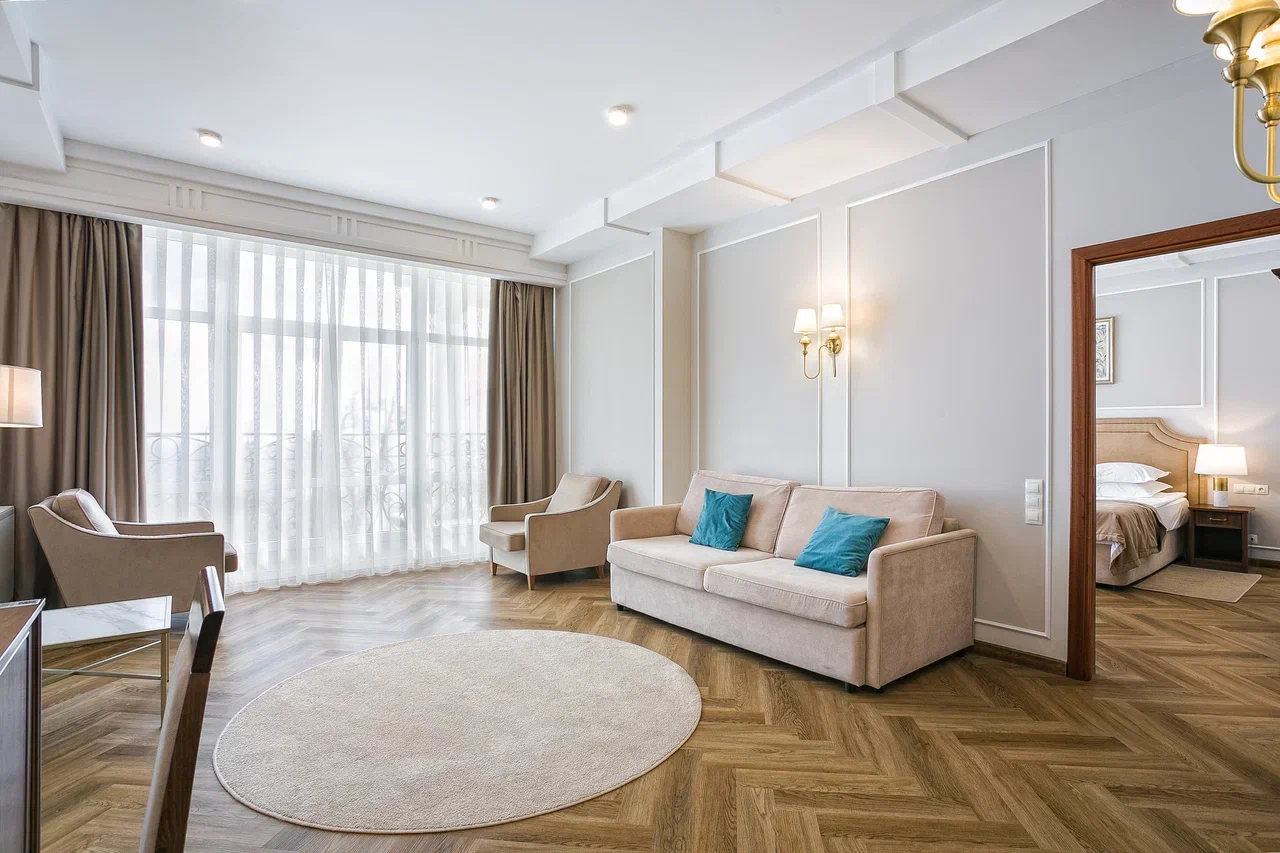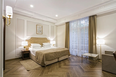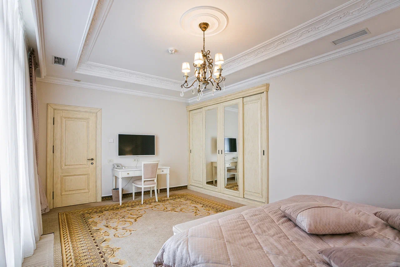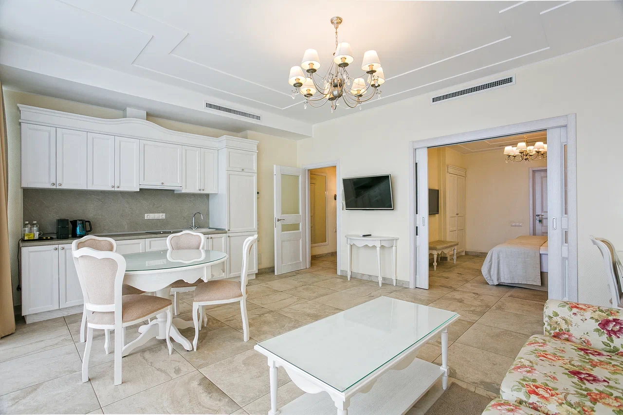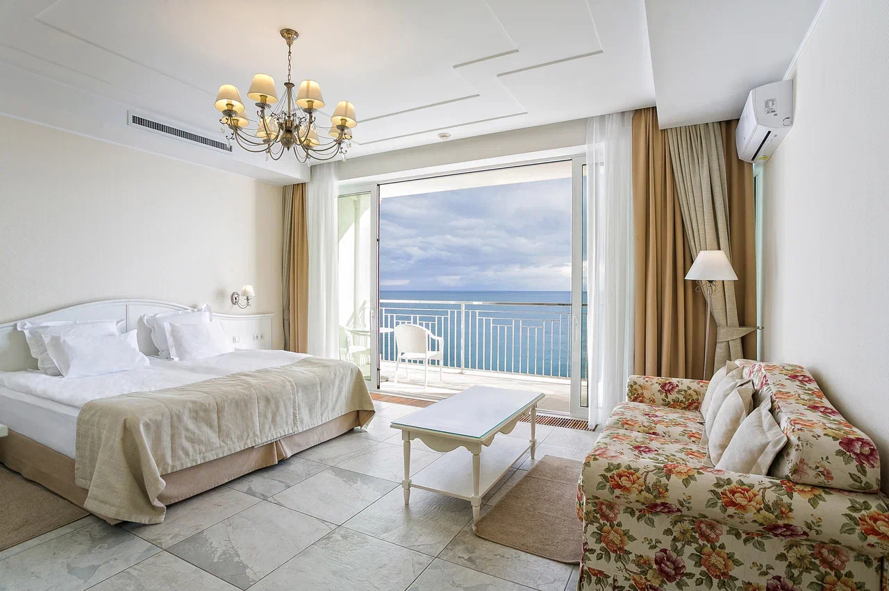 В номере: вешалка, диван раскладной, зеркало, кровать двуспальная, прикроватные тумбочки, стол, стулья, шкаф, кондиционер, мини-холодильник, сейф, сушилка для белья, телевизор ЖК, телефон, чайный набор посуды, электрочайник