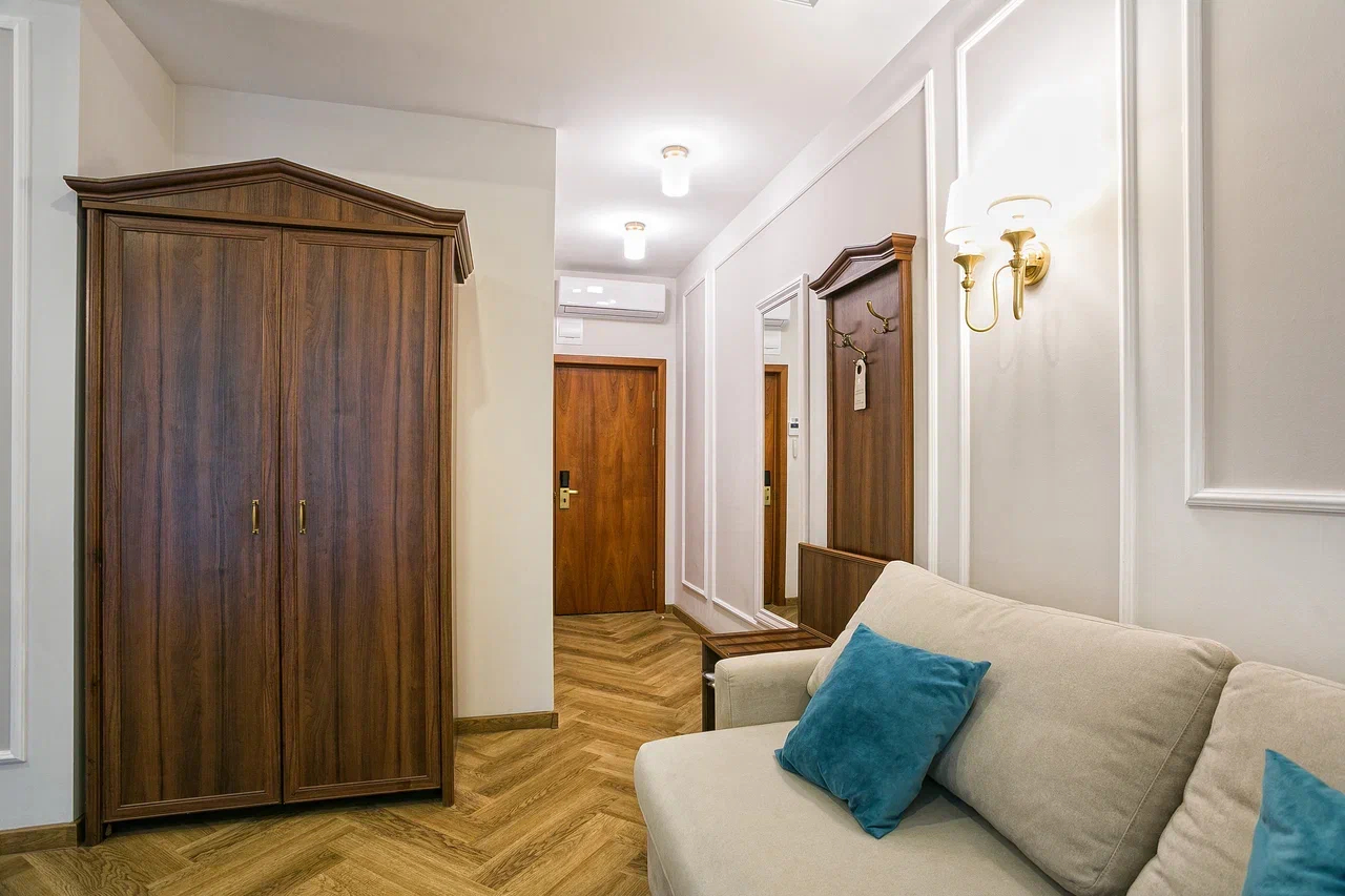 В номере: вешалка, диван раскладной, зеркало, кровати односпальные, прикроватные тумбочки, стол, стулья, шкаф, кондиционер, кофемашина, мини-холодильник, набор посуды, сейф, телевизор, телефон, чайный набор посуды, электрочайник