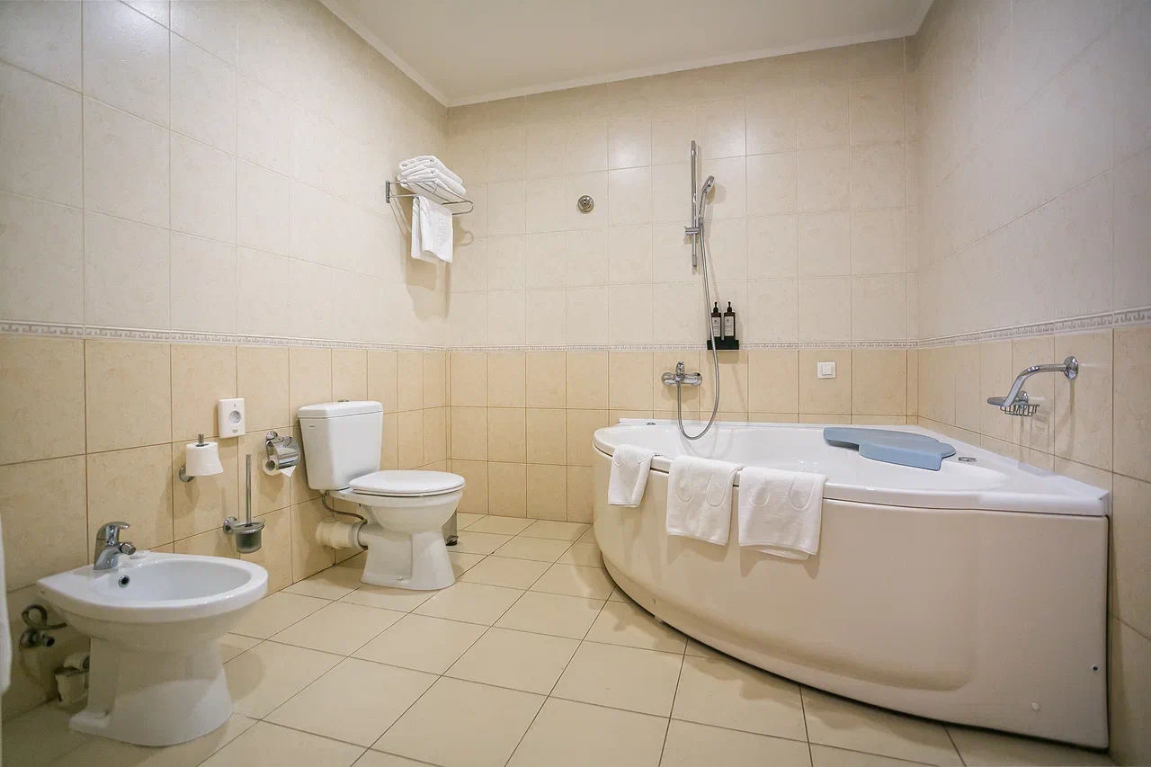 Санузел: биде, с ванной, тапочки, туалетные принадлежности, фен, халат