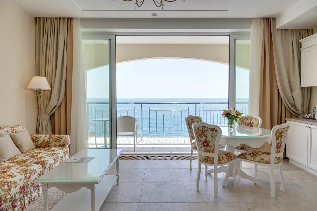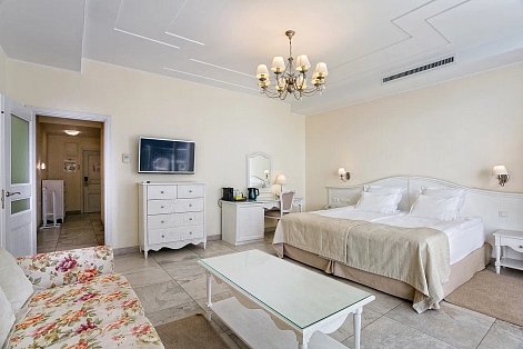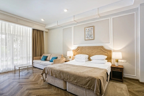 В номере: вешалка, диван раскладной, зеркало, кровати односпальные /одна двуспальная кровать, прикроватные тумбочки, стол, стулья, шкаф, кондиционер, кофемашина, мини-холодильник, набор посуды, сейф, телевизор, телефон, чайный набор посуды, электрочайник