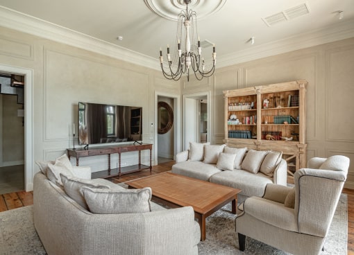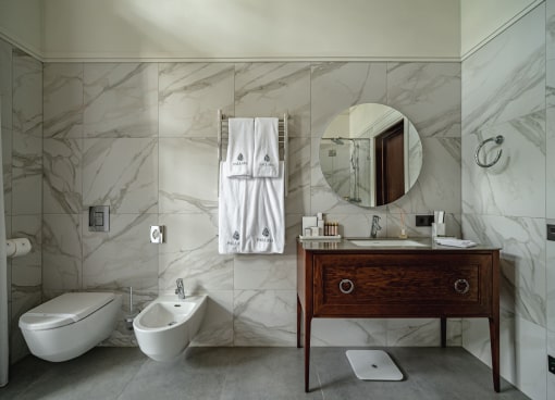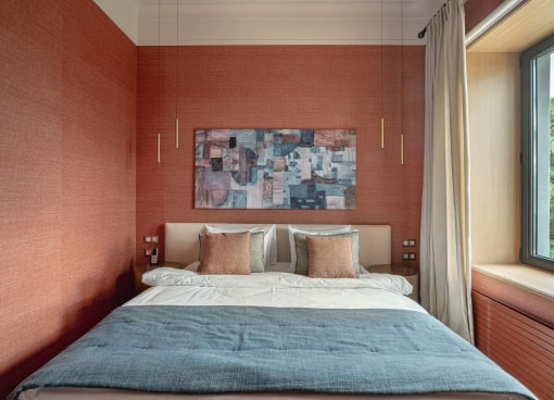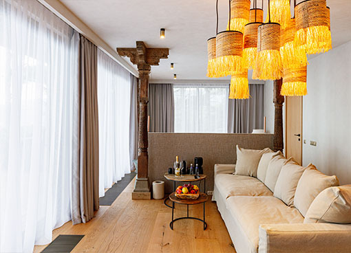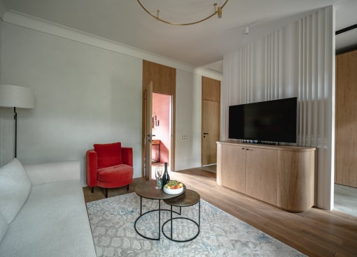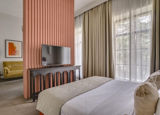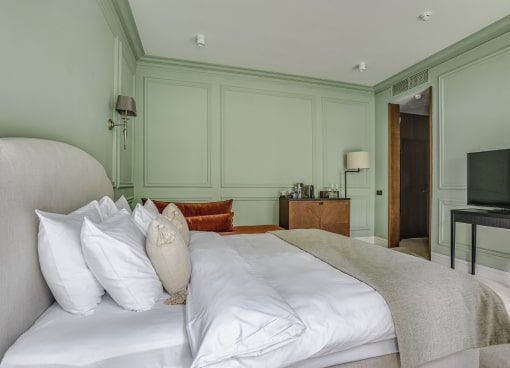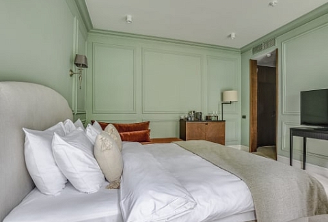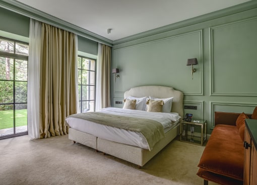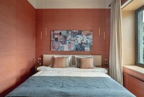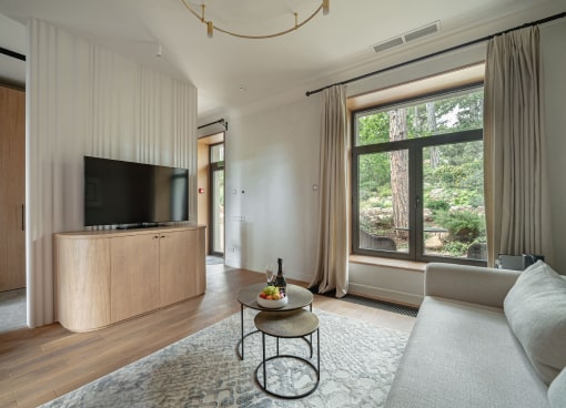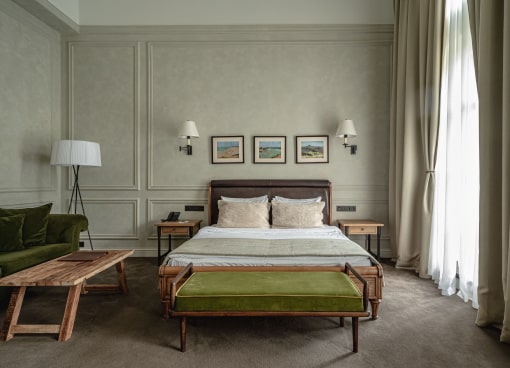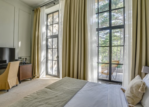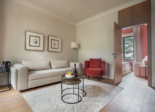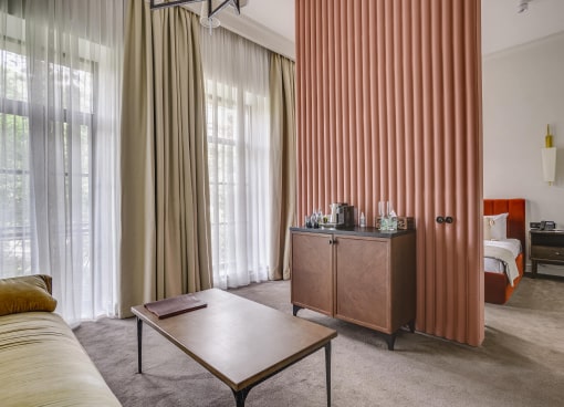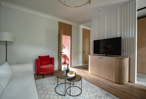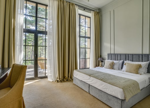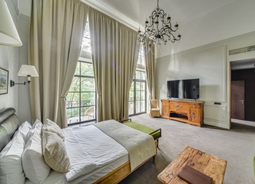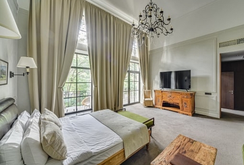 В номере: вешалка, диван, зеркало, кресла, кровать двуспальная, прикроватные тумбочки, стол, столик журнальный, стулья, тумба, шкаф, кондиционер, сейф, телевизор