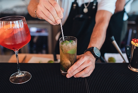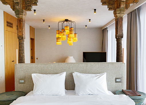 В номере: вешалка, зеркало, кресло, кровать двуспальная, прикроватные тумбочки, стол, стулья, шкаф, кондиционер, мини-холодильник, набор посуды, сейф, телевизор, телефон