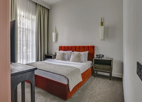 В номере: вешалка, зеркало, кровать двуспальная, прикроватные тумбочки, стол, стулья, шкаф, кондиционер, мини-холодильник, набор посуды, сейф, телевизор, телефон