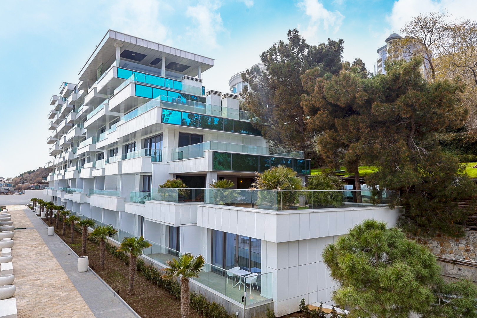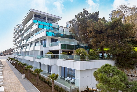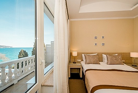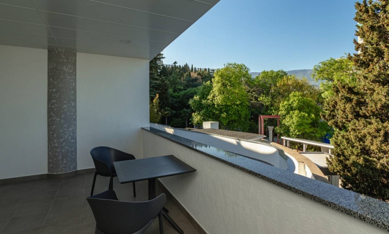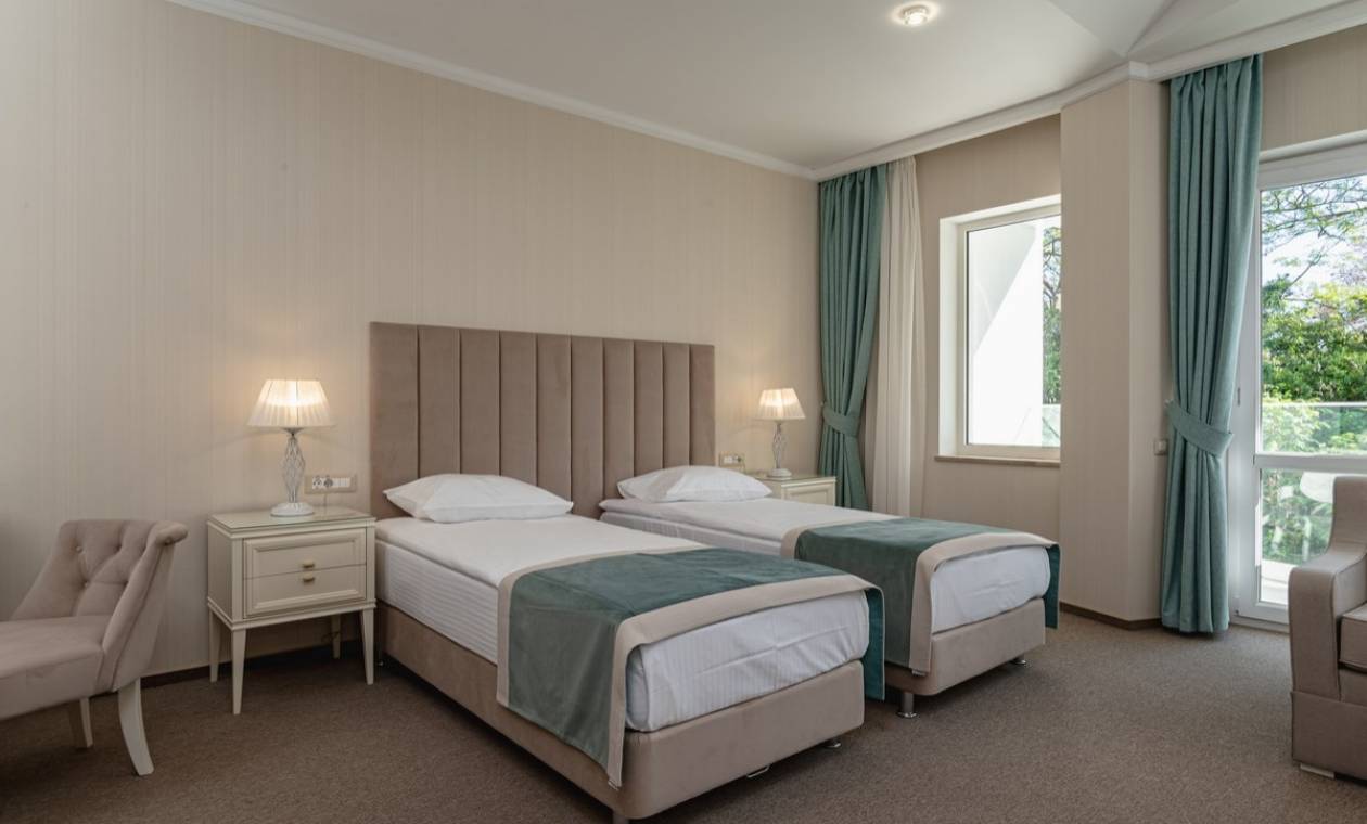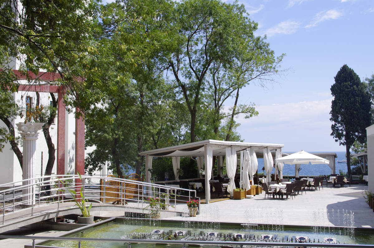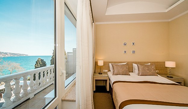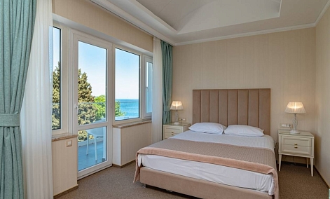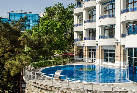 Дорога до аэропорта Симферополя займет около полутора часов. Отельный комплекс занимает благоустроенную территорию на первой береговой линии, протяженностью в два километра. Спа-отель включает в себя четыре многоэтажных корпуса, оснащенных лифтами. Жилой фонд предлагает отдыхающим 45 комфортабельных номеров категории Полулюкс, Люкс, Делюкс, Студио и 6 просторных Апартаментов. В номерах современный лаконичный интерьер с использованием холодных пастельных оттенков. Комнаты оснащены кондиционером, необходимой бытовой техникой, в апартаментах и в ряде номеров есть мини-кухня. С балконов открываются виды на море или Приморский парк. При отеле работает ресторан «ФабрикантЪ» и летняя веранда. В распоряжении отдыхающих два бассейна — открытый с подогревом и крытый с морской водой. Отдохнуть и расслабиться можно в спа-центре. Гостей там ожидает несколько видов бань - грязевая, соляна бан, термы, русская парная, травяная и финская и травяная сауны, хаммам, джакузи. Для любителей активного образа жизни предусмотрен тренажерный зал. На территории доступен беспроводной интернет, организованы охраняемая парковки. Деловые мероприятия можно провести в современном конференц-зале, вмещающем до 60 приглашенных. Для детей организована небольшая игровая зона в ресторане, доступна аренда кроваток. В двух шагах от спальных корпусов отеля находится мелко-галечный пляж. Пляж хорошо обрадован, вдоль побережья установлены раздевалки и душевые, есть навесы, шезлонги, лежаки.