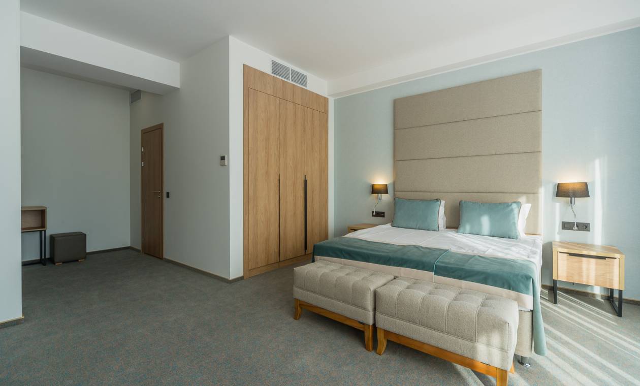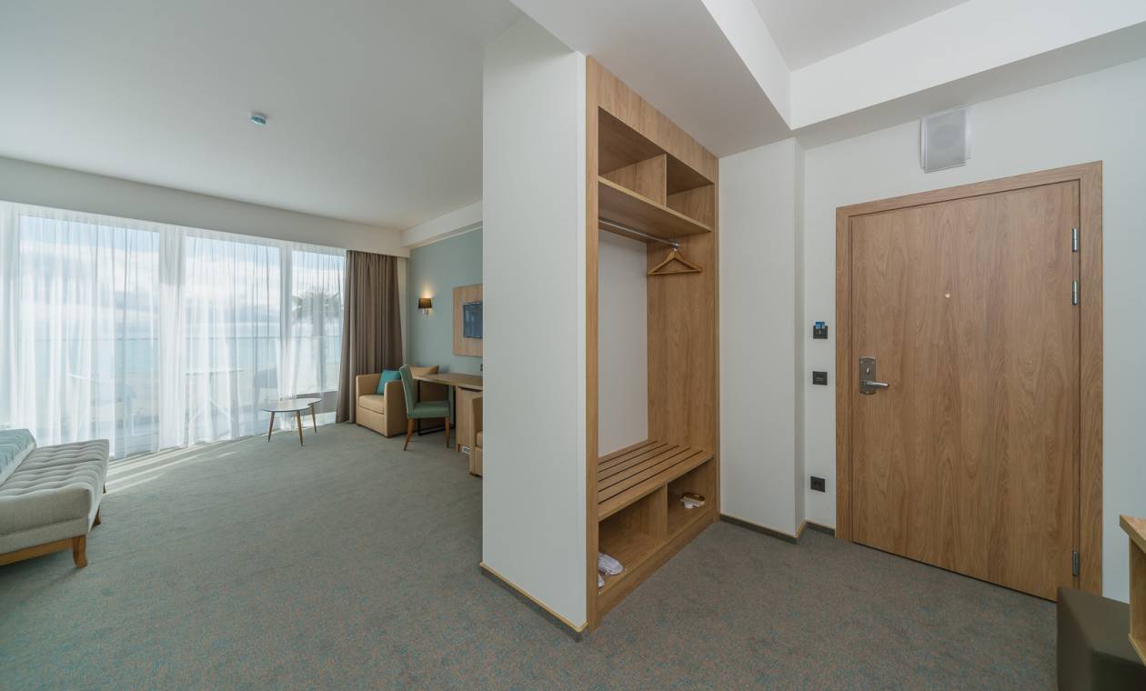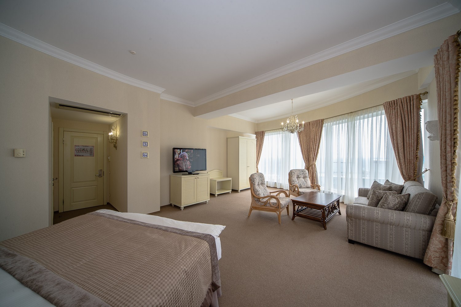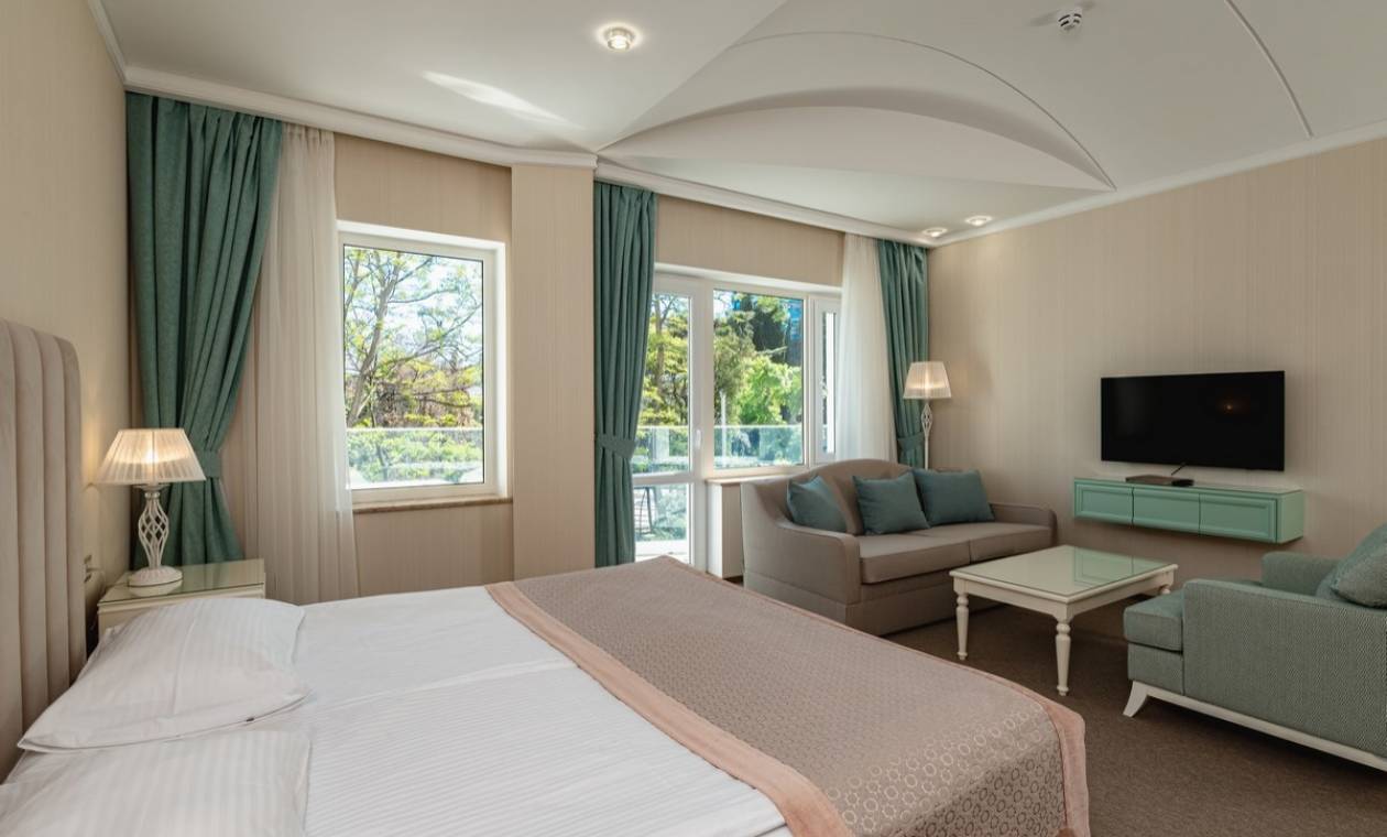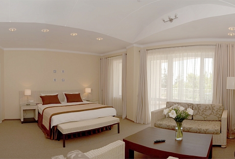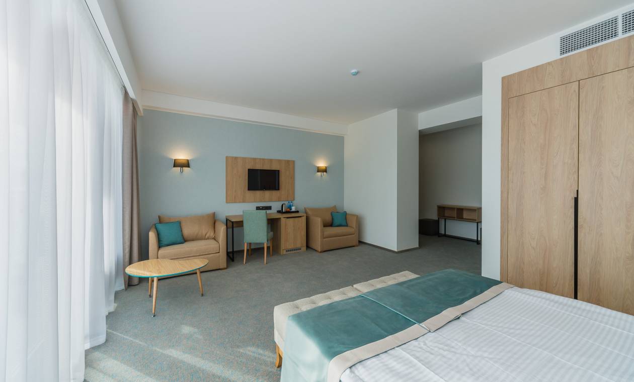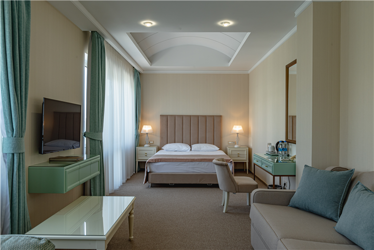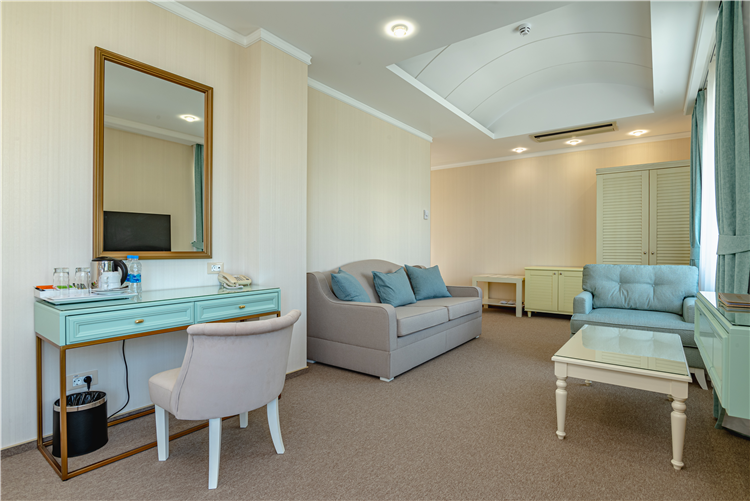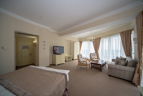 В номере: вешалка, зеркало, кровать двуспальная, набор мягкой мебели, прикроватные тумбочки, стол, столик журнальный, стул, шкаф, кондиционер, мини-холодильник, сейф, телевизор ЖК, утюг, чайный набор посуды, электрочайник