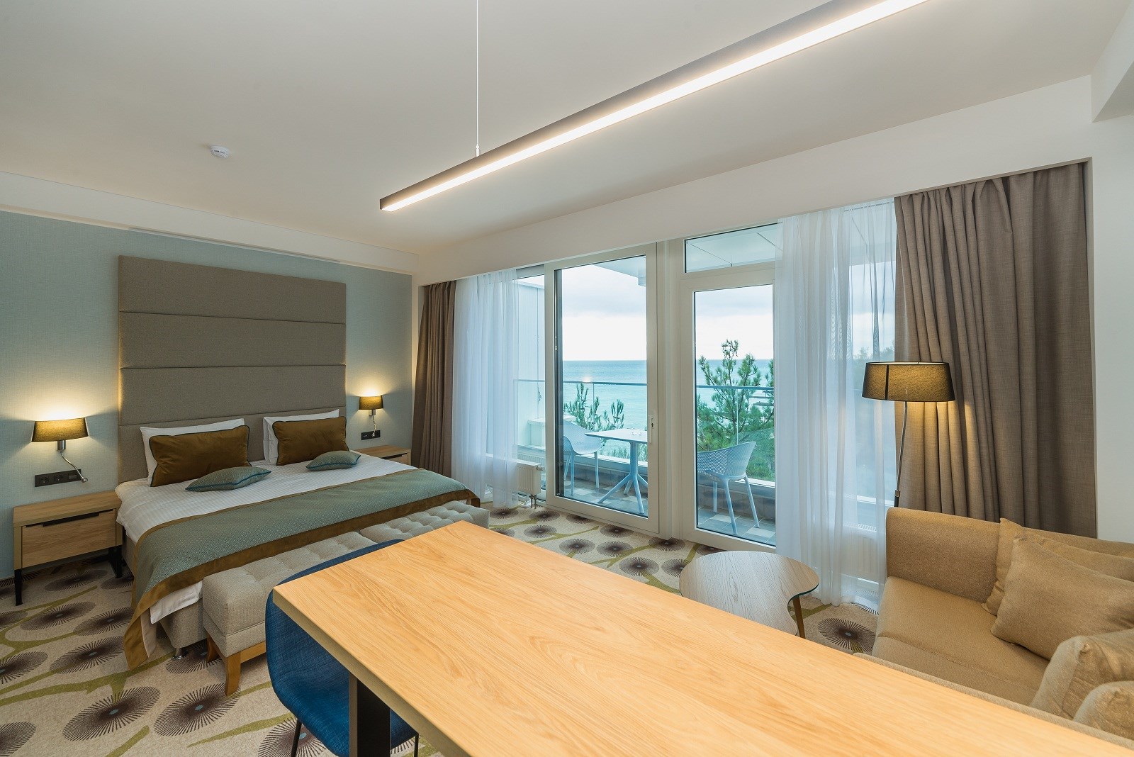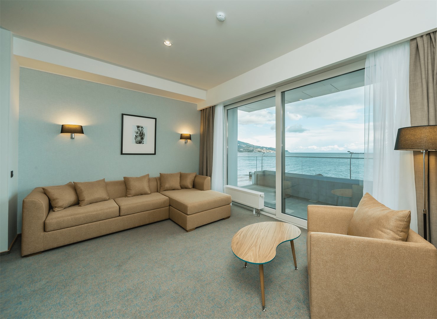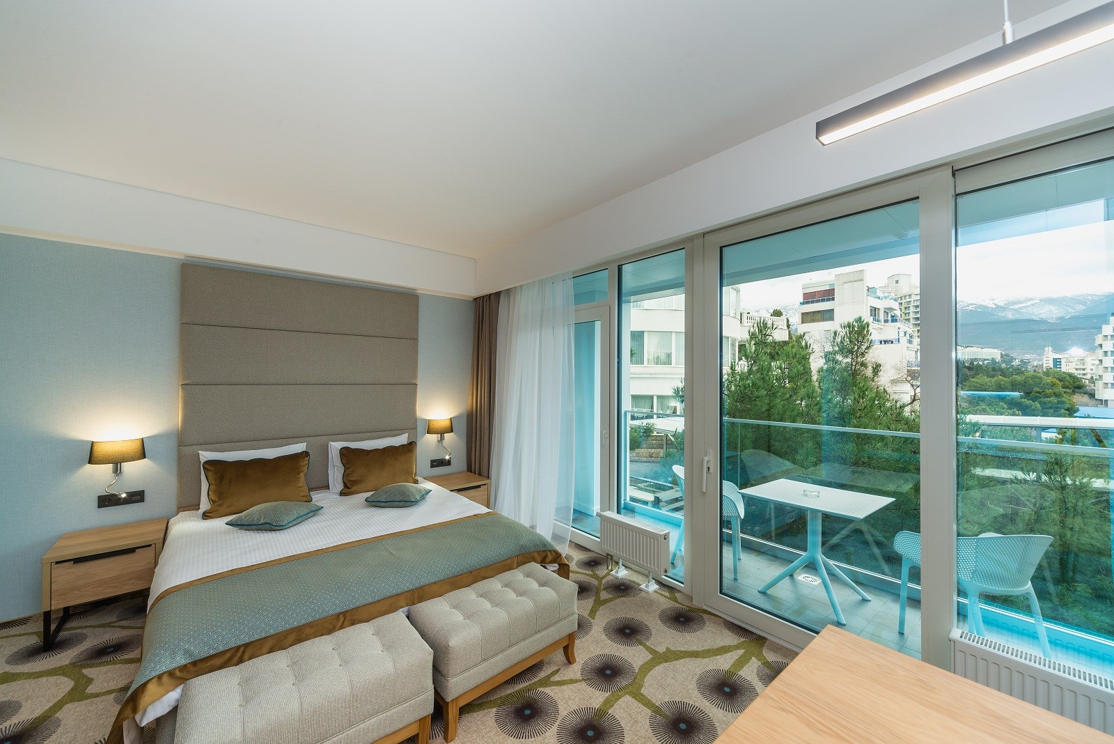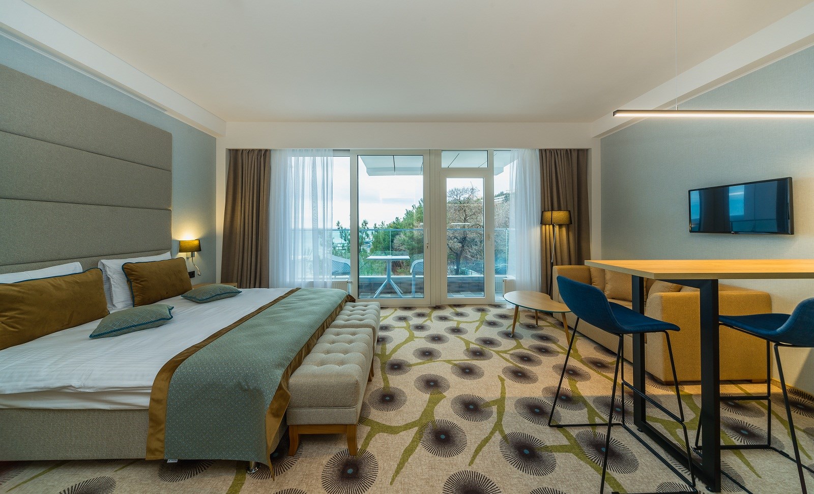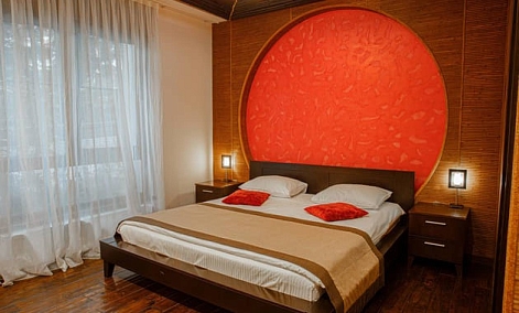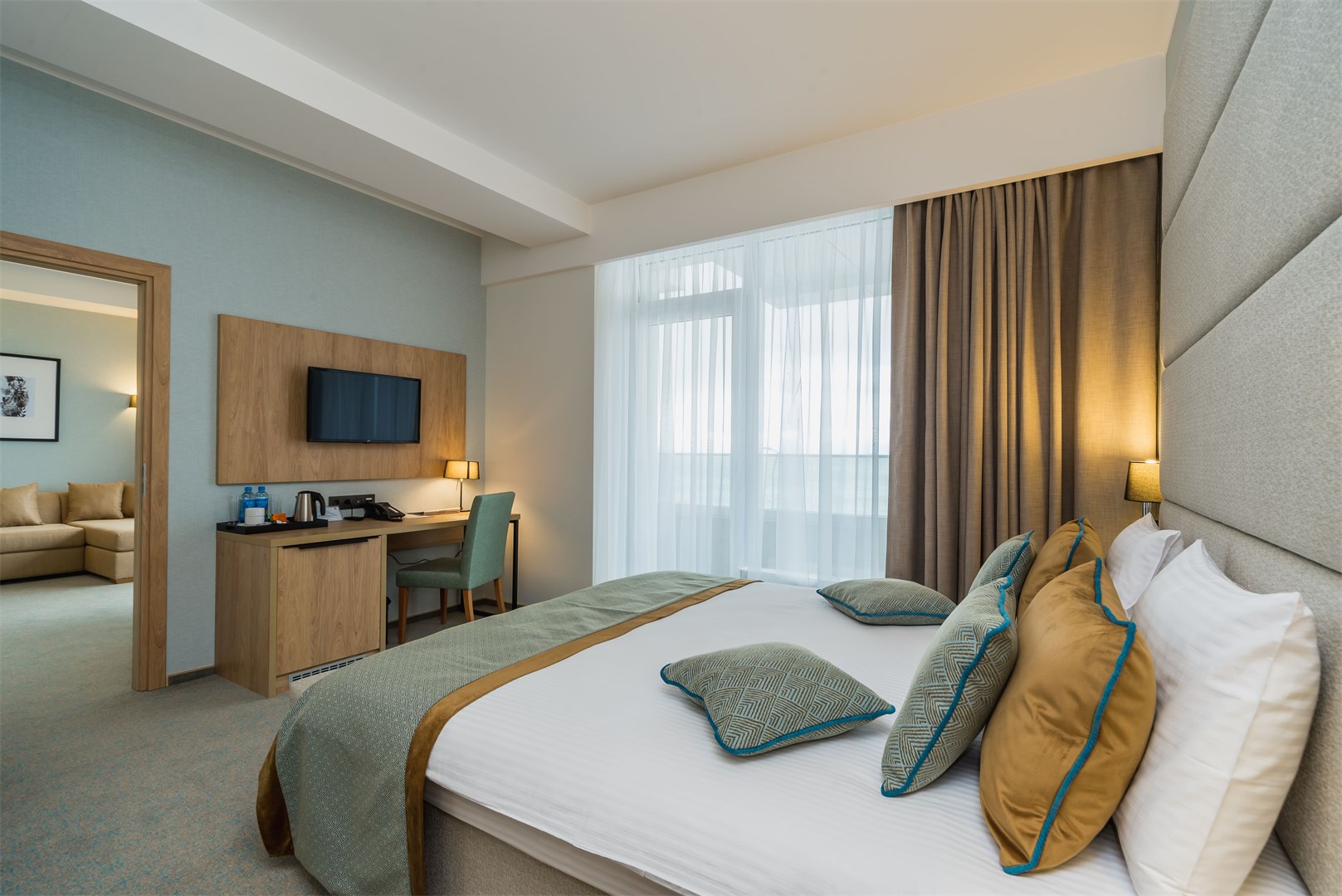 В номере: вешалка, зеркало, кровать двуспальная, набор мягкой мебели, прикроватные тумбочки, стол, столик журнальный, стул, шкаф, кондиционер, мини-холодильник, сейф, телевизор ЖК, утюг, чайный набор посуды, электрочайник