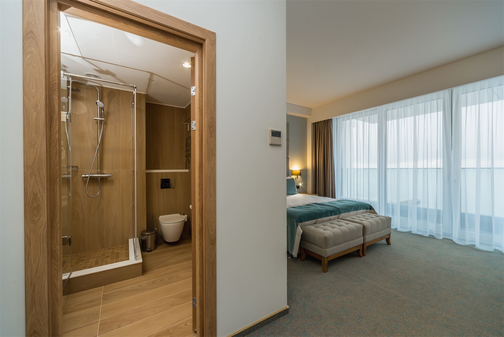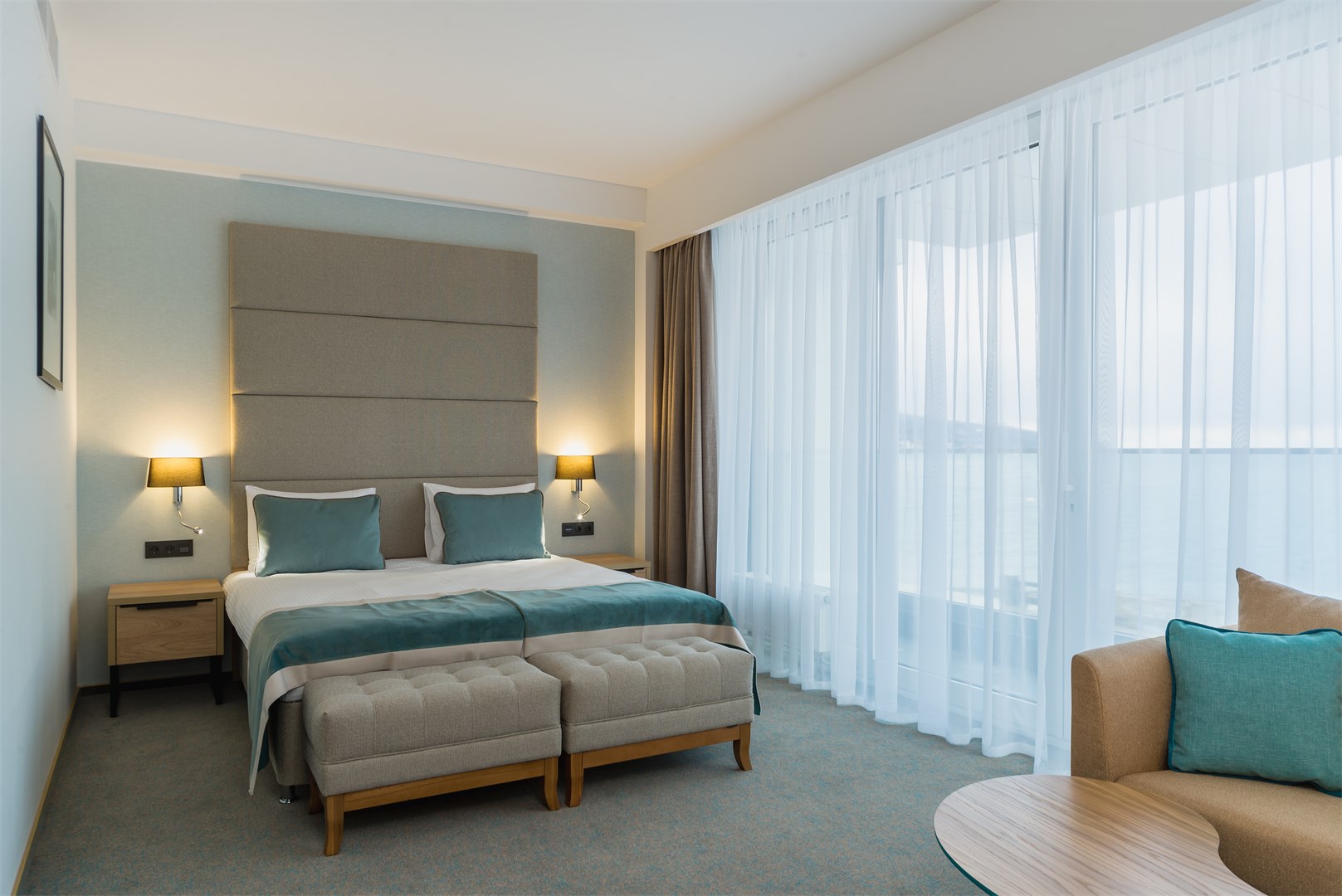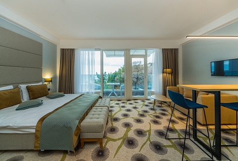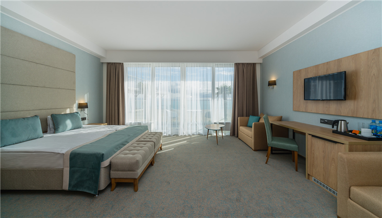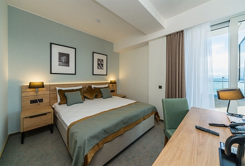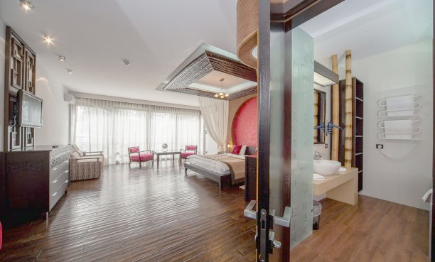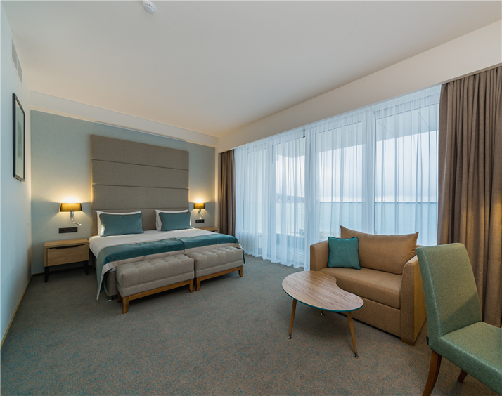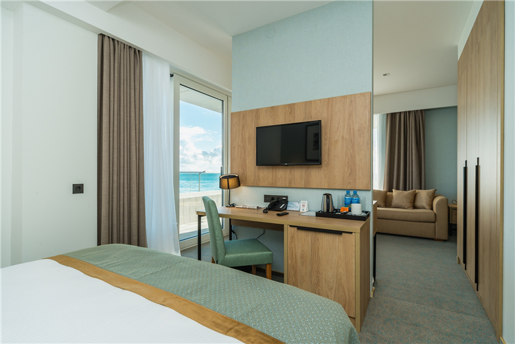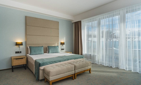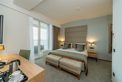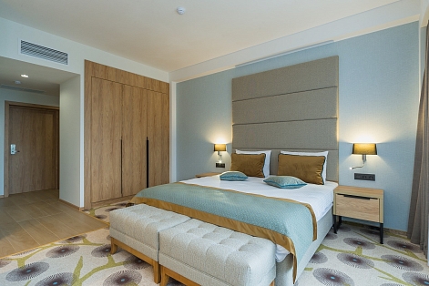 В номере: вешалка, зеркало, кровать двуспальная, набор мягкой мебели, прикроватные тумбочки, столик журнальный, стул, шкаф, кондиционер, мини-холодильник, сейф, телевизор ЖК, чайный набор посуды, электрочайник