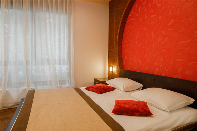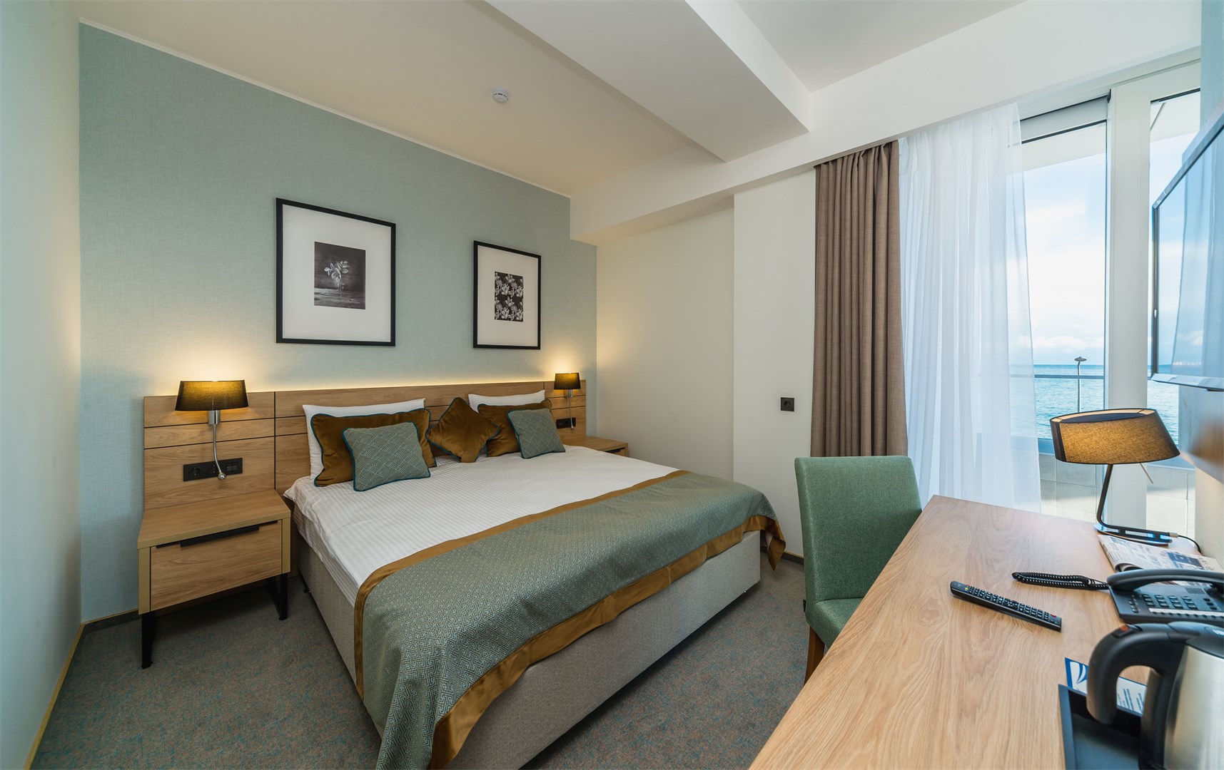 В номере: вешалка, зеркало, кровать двуспальная, прикроватные тумбочки, стол, стул, шкаф, кондиционер, мини-холодильник, сейф, телевизор ЖК, чайный набор посуды, электрочайник