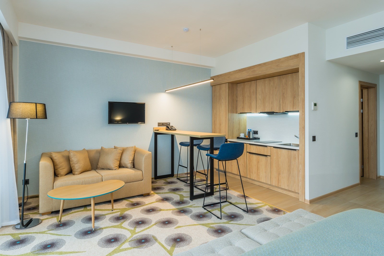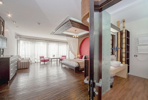 В номере: вешалка, зеркало, кровать двуспальная, кухонная мебель, прикроватные тумбочки, стол, стул, шкаф, кондиционер, мини-холодильник, плита электрическая, сейф, телевизор ЖК, утюг, чайный набор посуды, электрочайник
