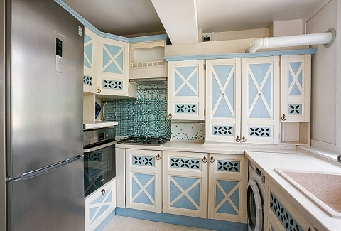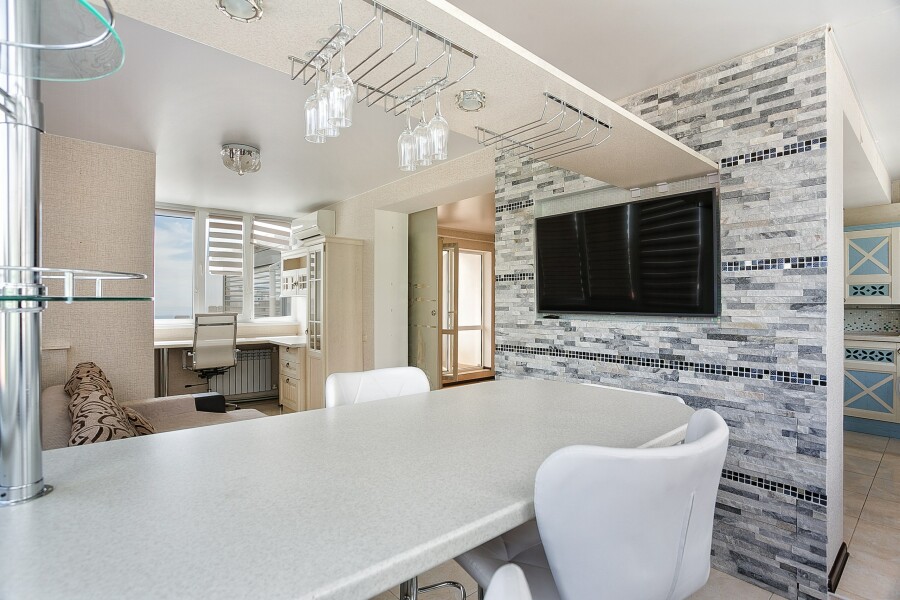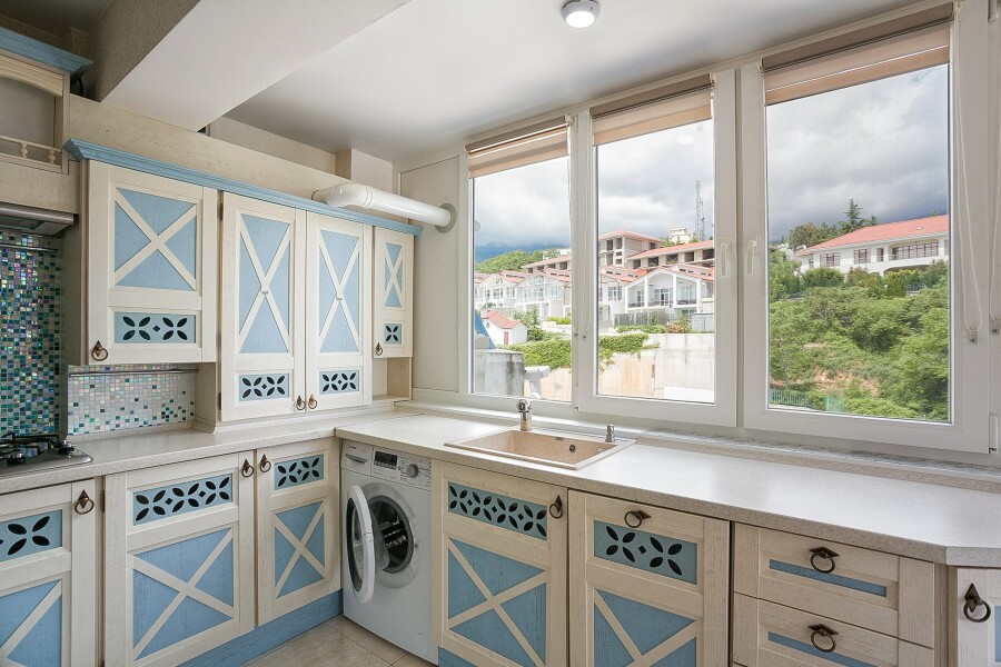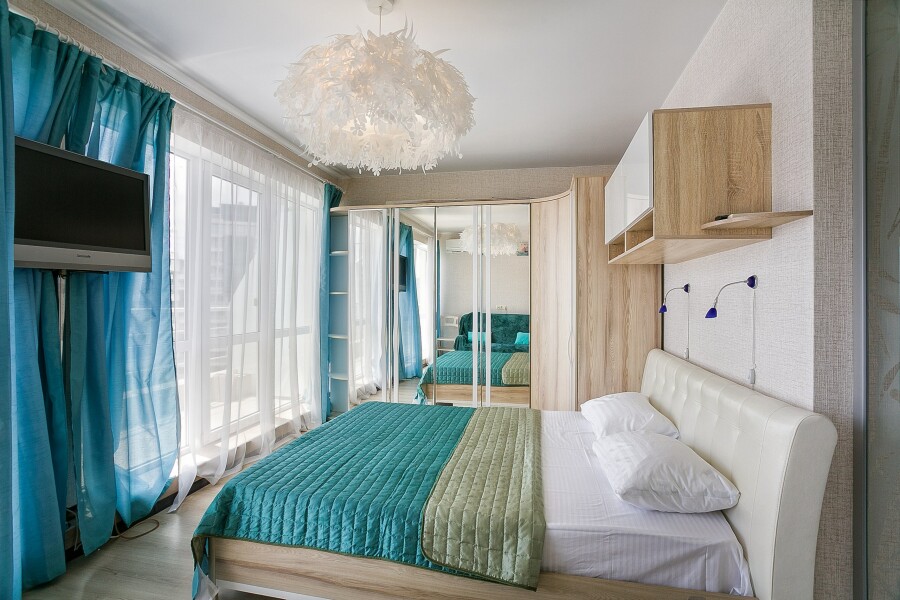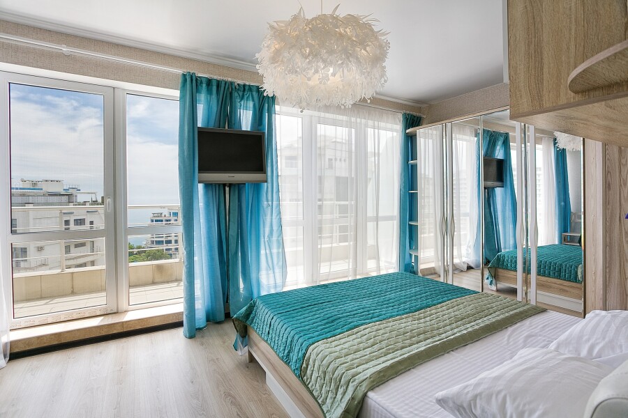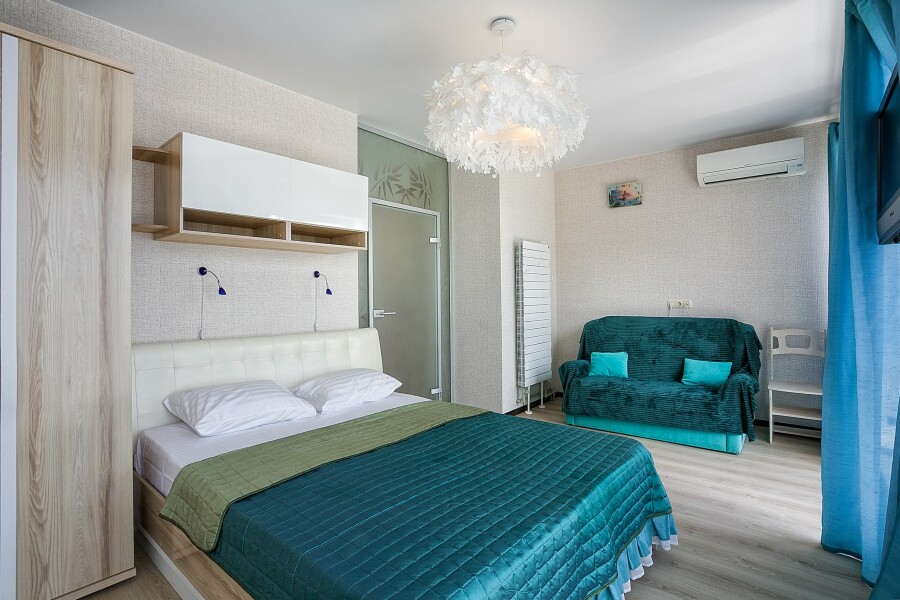В номере: вешалка, диван, зеркало, кровать двуспальная, кухонная мебель, прикроватные тумбочки, стол, стулья, шкаф, кондиционер, стиральная машина, телевизор, холодильник