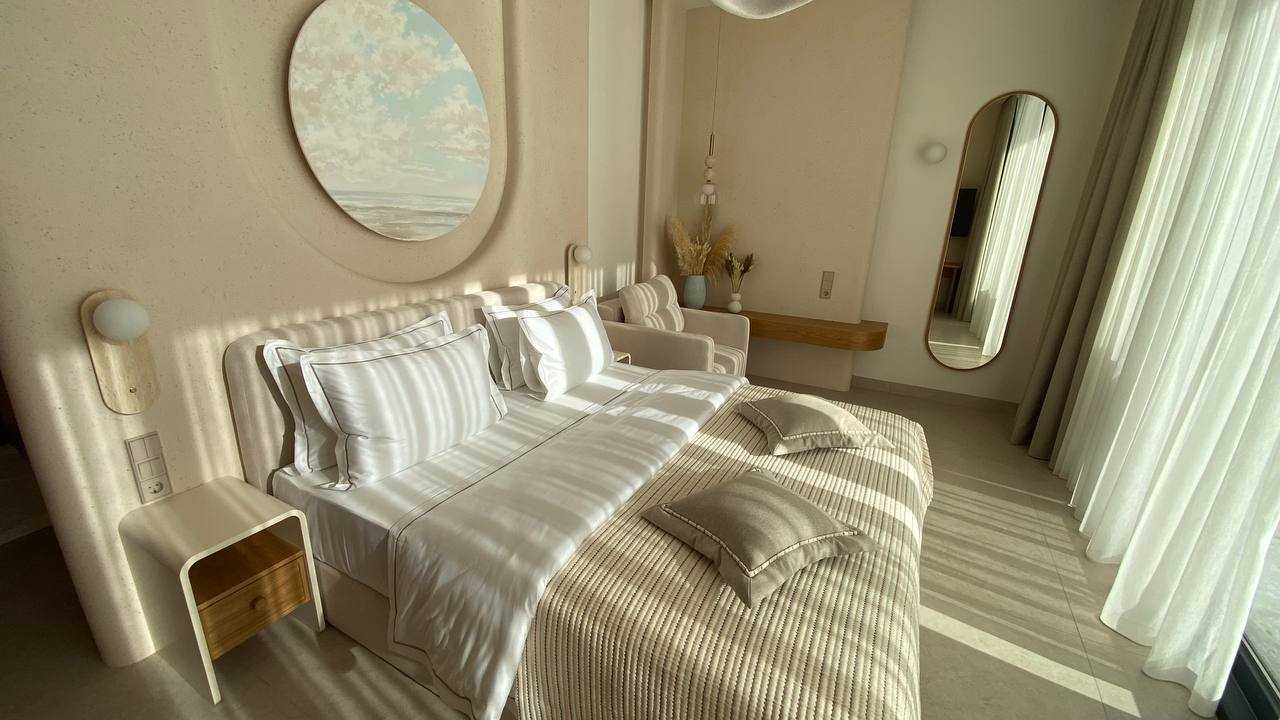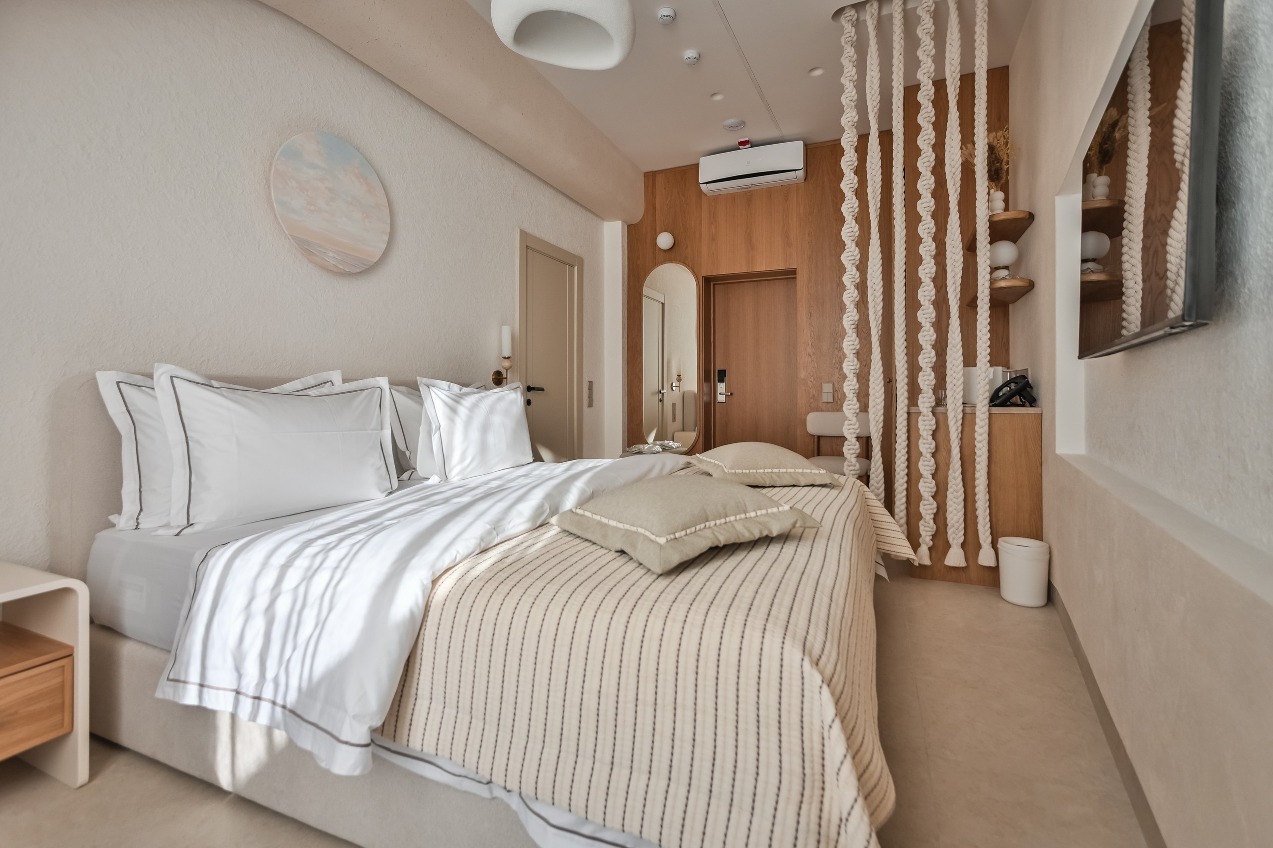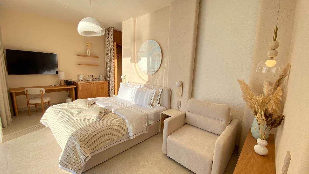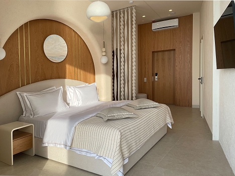 В номере: вешалка, зеркало, кровать двуспальная, прикроватные тумбочки, шкаф, кондиционер, телевизор, холодильник
