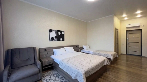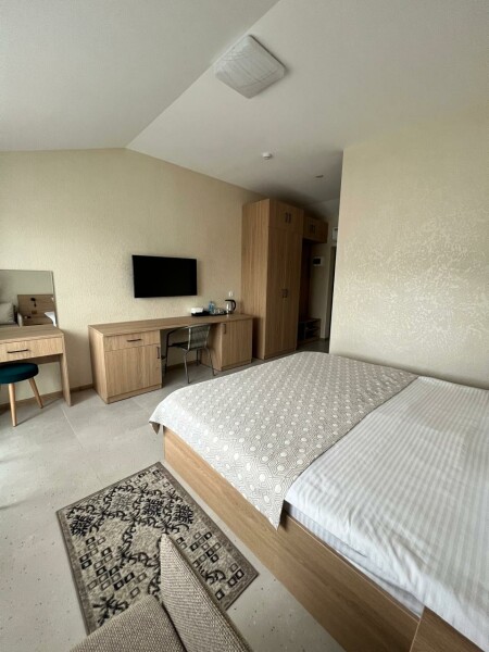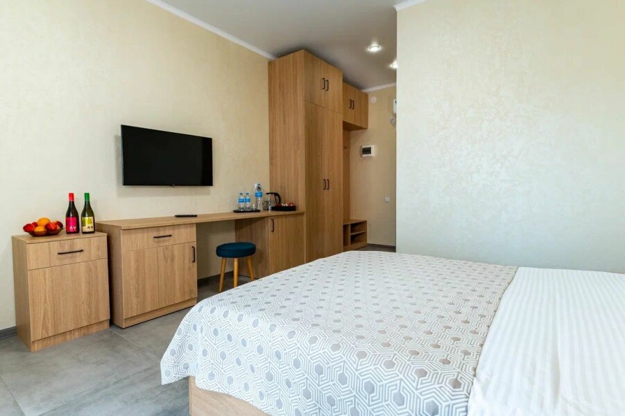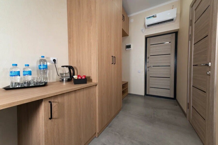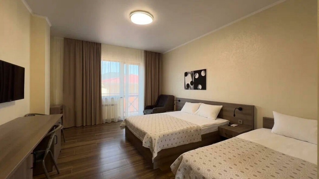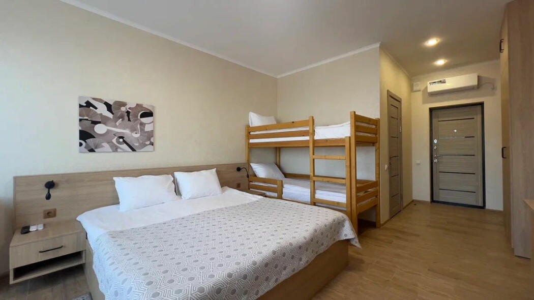 В номере: вешалка, зеркало, кровать двуспальная, кровать двухъярусная, прикроватные тумбочки, шкаф, кондиционер, телевизор, холодильник