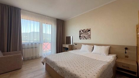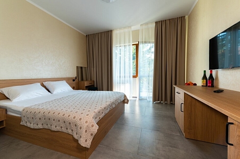 В номере: вешалка, зеркало, кровать двуспальная, прикроватные тумбочки, шкаф, кондиционер, телевизор, холодильник