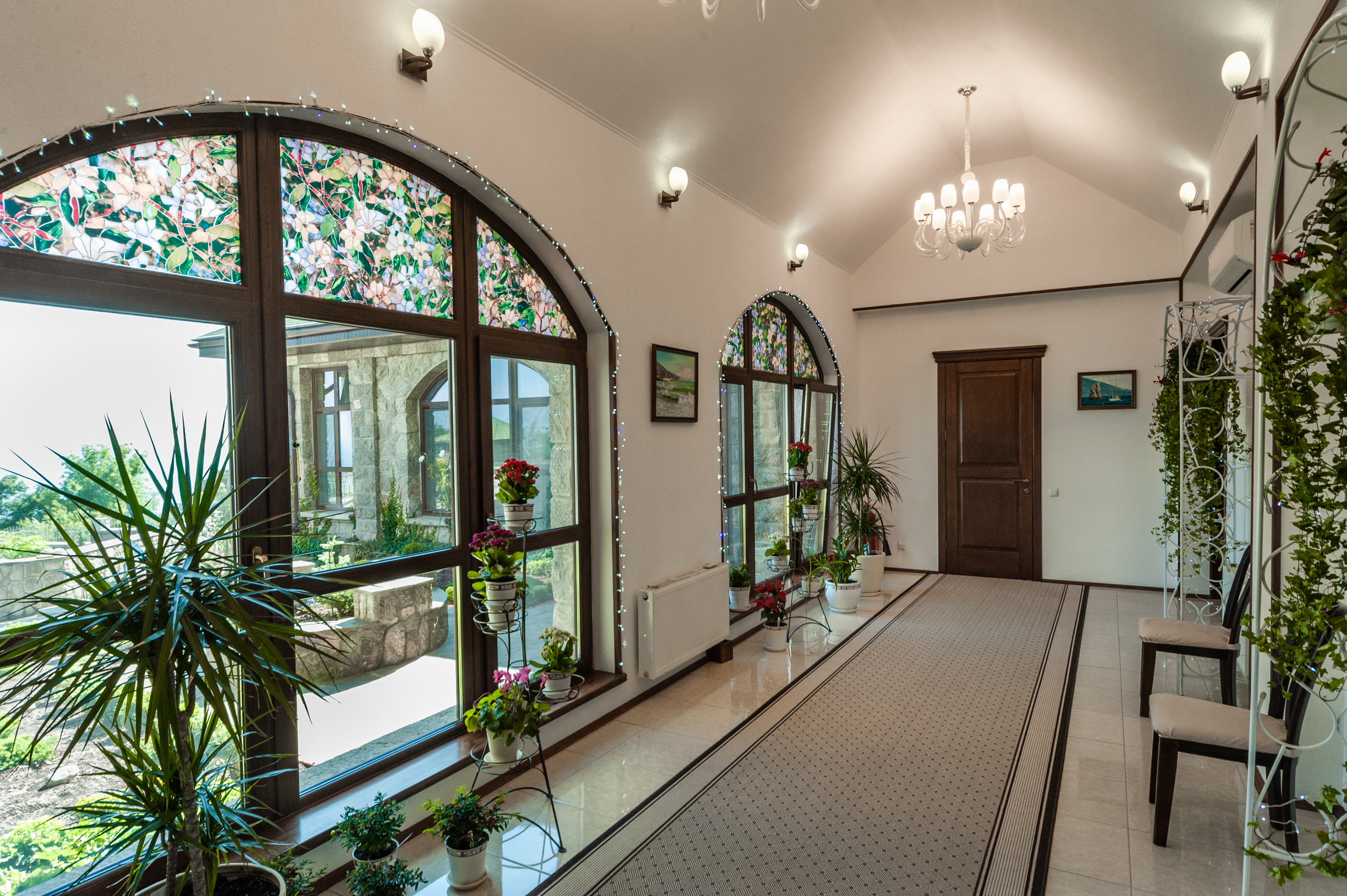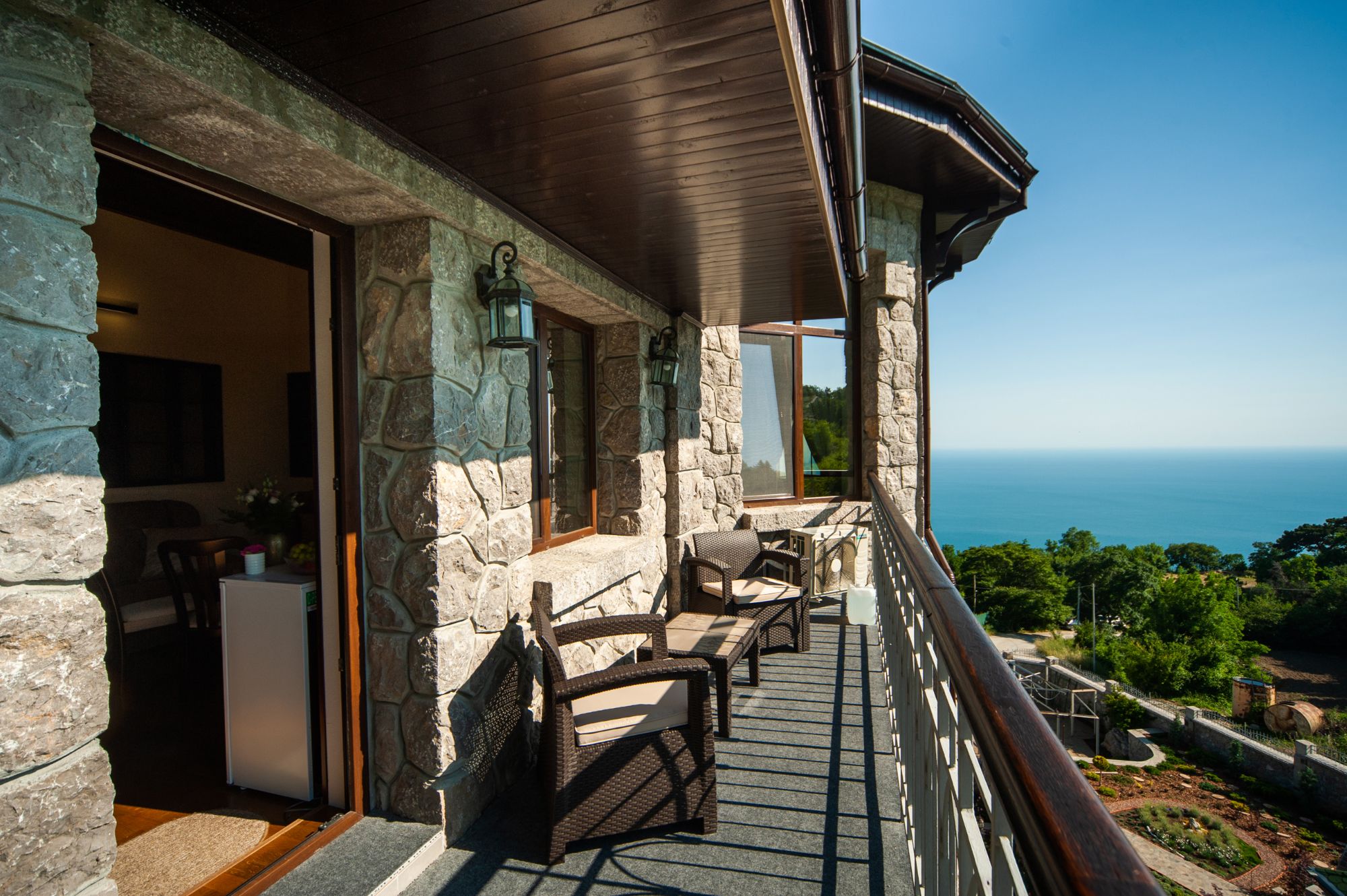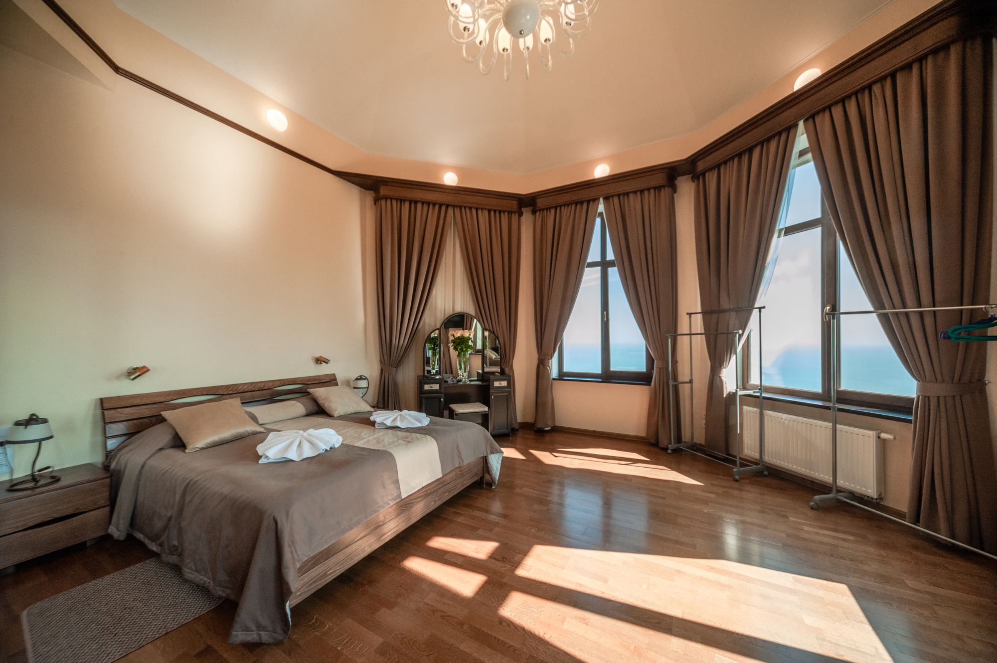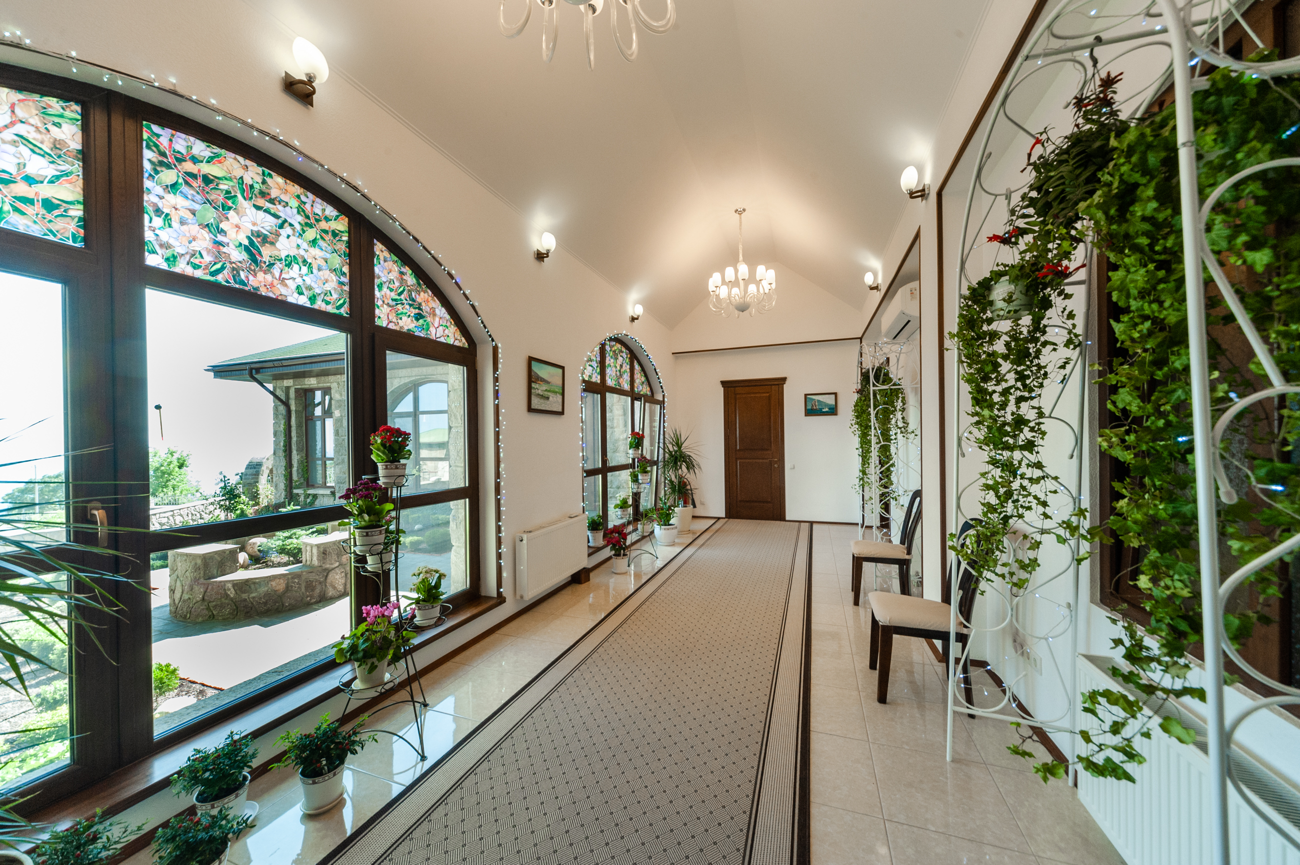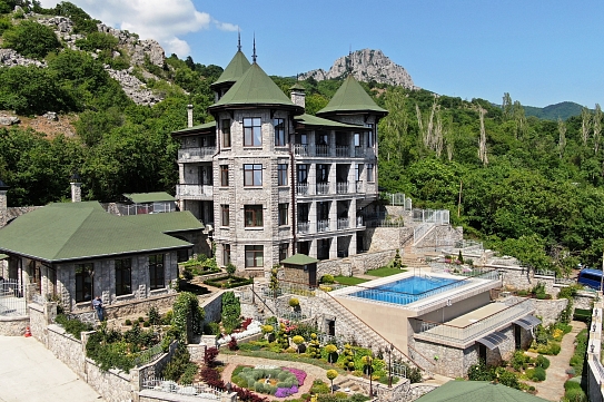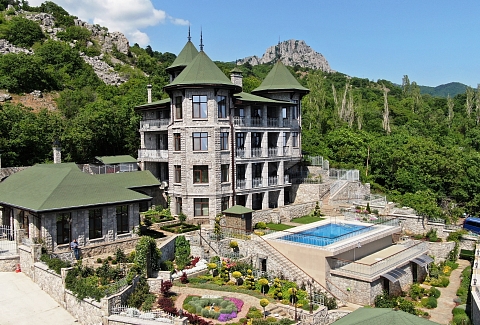 На втором, третьем и четвертом этажах располагаются комфортабельные номера, названные в честь природных достопримечательностей Крыма. В каждом номере предусмотрен индивидуальный санузел, есть кондиционер, плазменный телевизор, набор посуды, подключен интернет. В гостевом доме работает ресторан, на территории организован открытый бассейн с зоной для отдыха и загара. На территории «Замка» расположена летняя площадка для пикников под открытым небом. Здесь есть мангал приготовления шашлыков, где гости могут готовить себе, как самостоятельно, так и с нашей помощью. Оборудован небольшой тренажерный зал с беговыми дорожками. Посещая тренажерный зал «Замка», наши гости могут поддерживать спортивную форму даже в дождливую или снежную погоду.При желании гости могут заняться виндсерфингом, вейкбордингом, дайвингом, полетать на параплане, покататься на гидроциклах или водных лыжах. Все эти развлечения предоставляет пятизвёздочный отель «Мрия», расположенный на берегу в 10 км от гостевого дома.